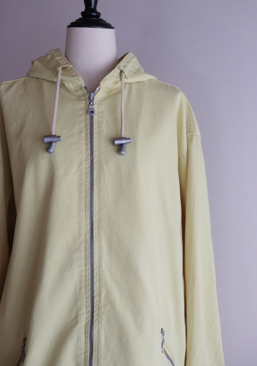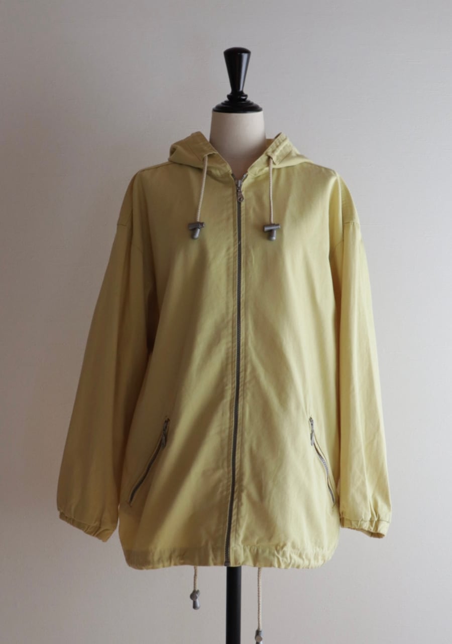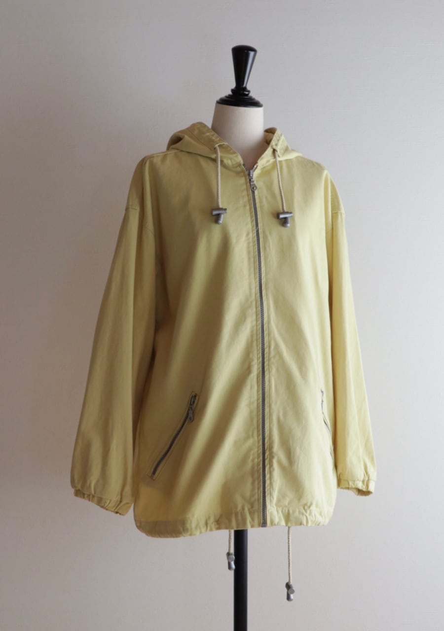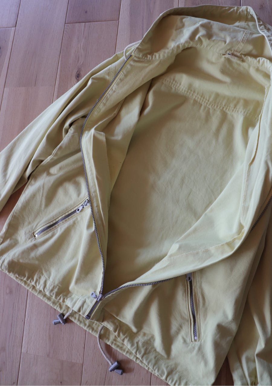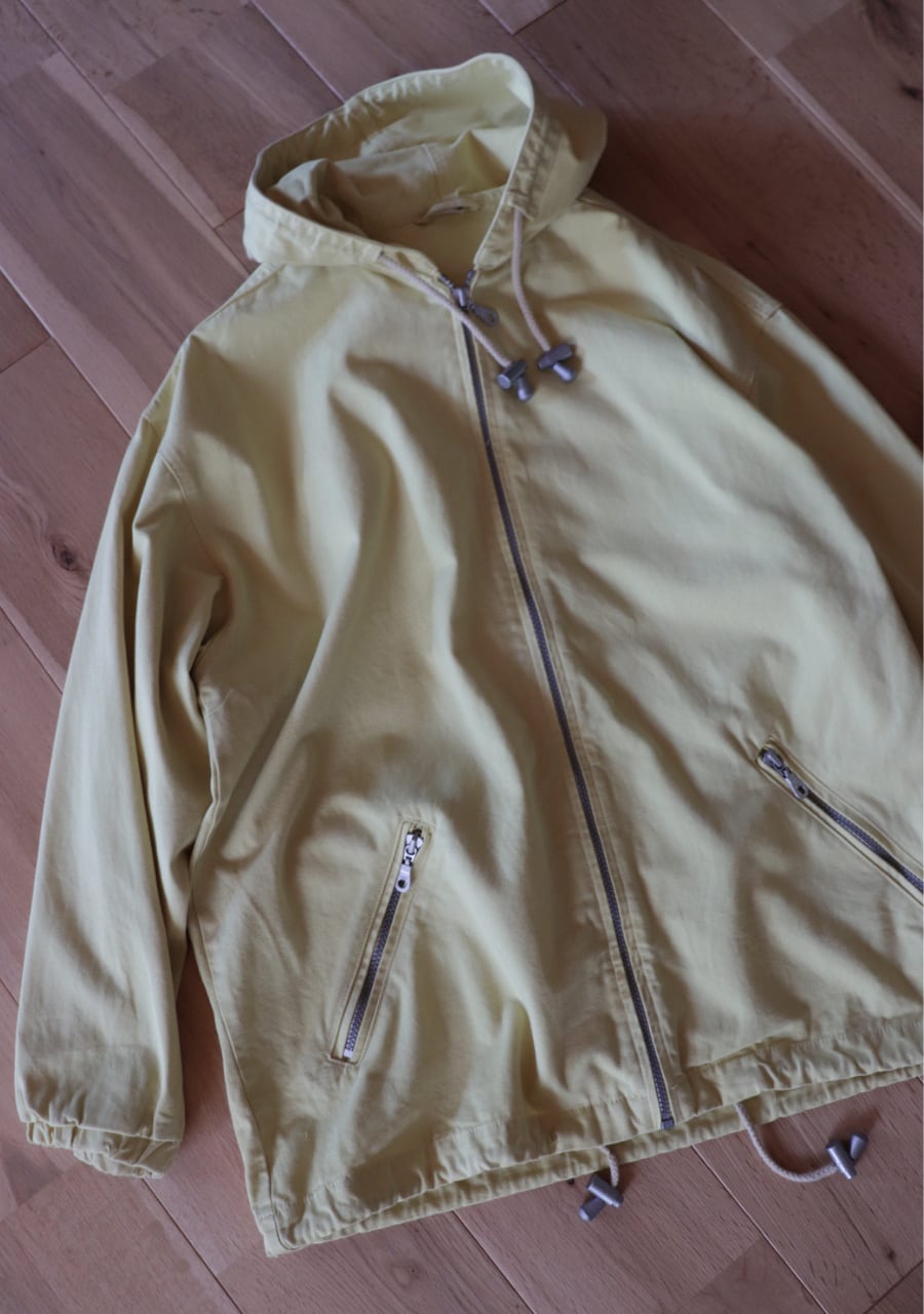 爽やかなレモンイエローとシルバーのジップが可愛い。生地はやや薄手で柔らかいがしっかとした生地。身幅も良くインナーにスウェットやニットの上からも羽織れます。またコートのインナーとしても良し!フードとカラーがアクセントになるアイテムでファッション性もよく機能性も良し。春まで活躍してくれるアイテムです。