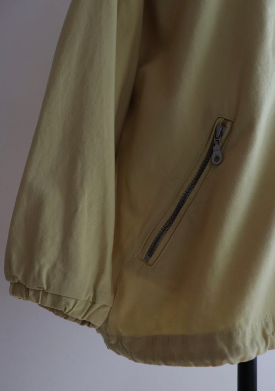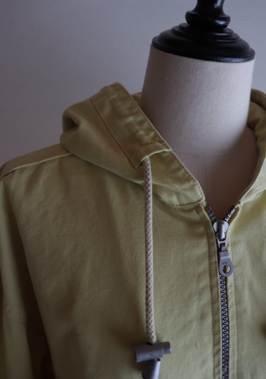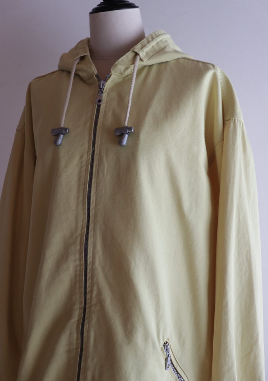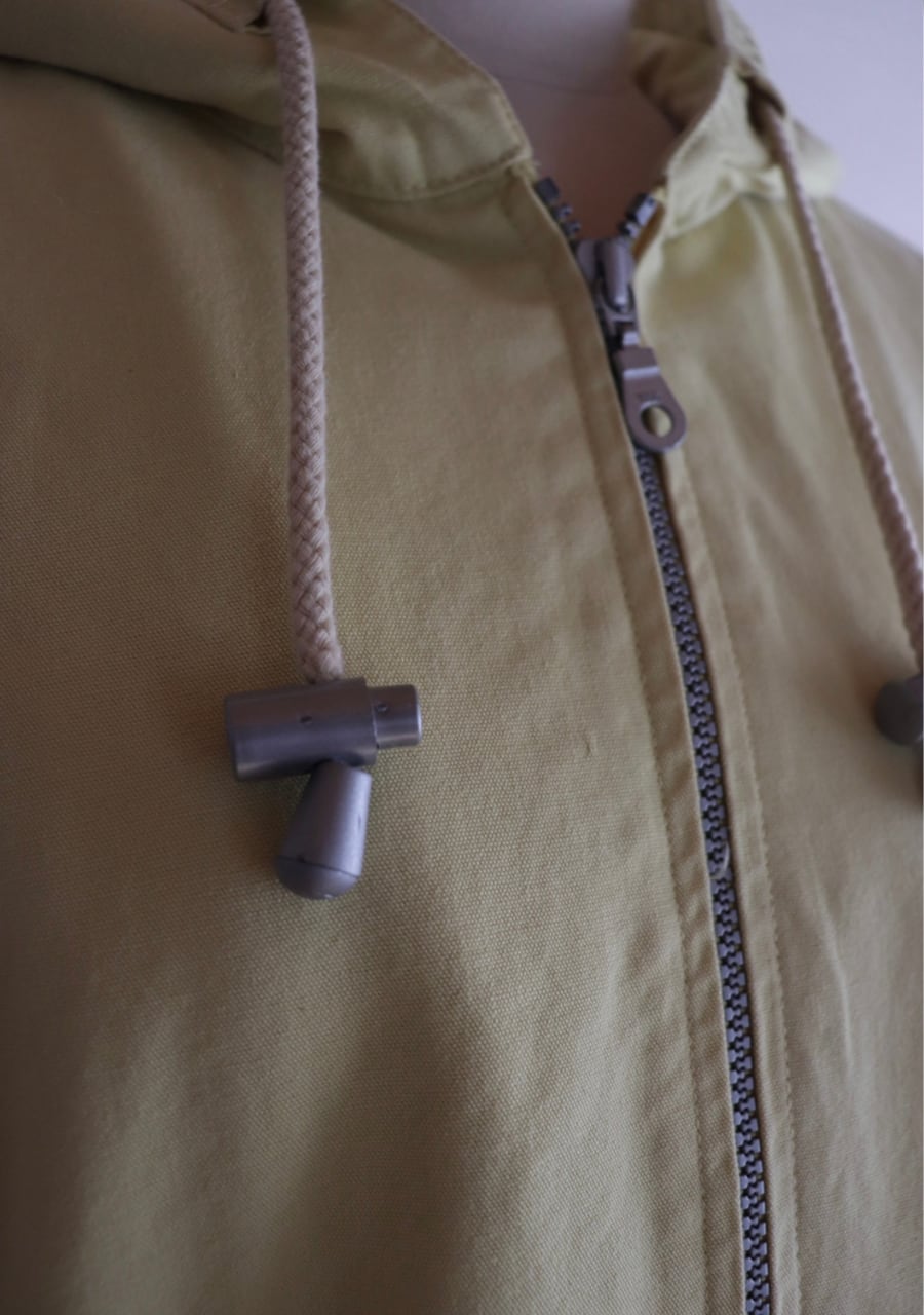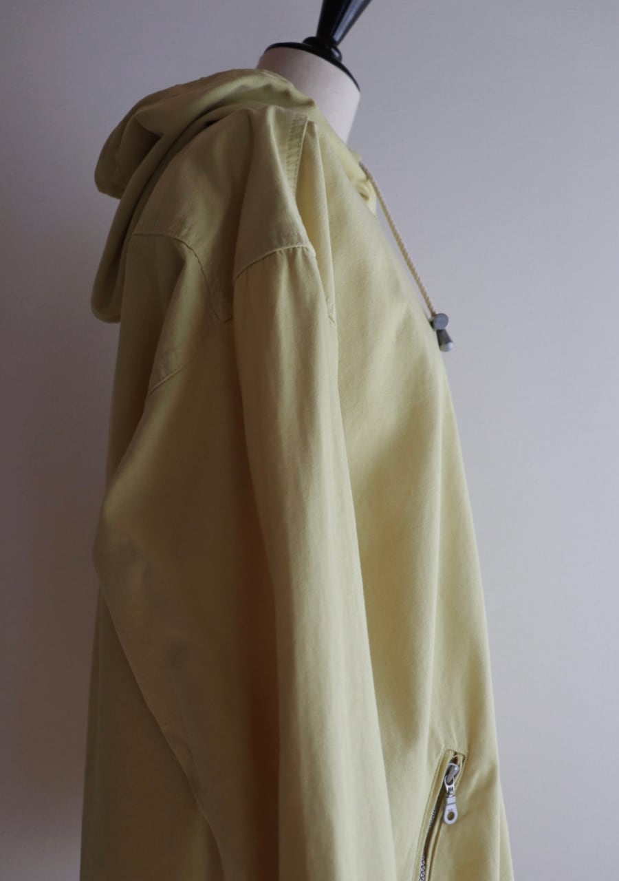 爽やかなレモンイエローとシルバーのジップが可愛い。生地はやや薄手で柔らかいがしっかとした生地。身幅も良くインナーにスウェットやニットの上からも羽織れます。またコートのインナーとしても良し!フードとカラーがアクセントになるアイテムでファッション性もよく機能性も良し。春まで活躍してくれるアイテムです。