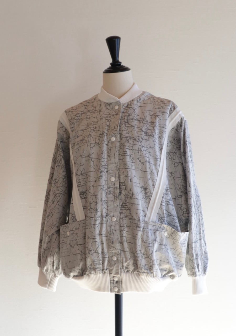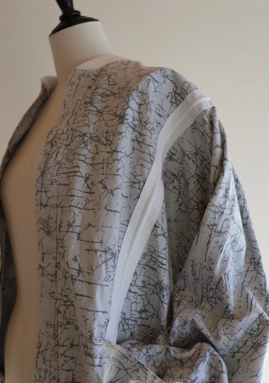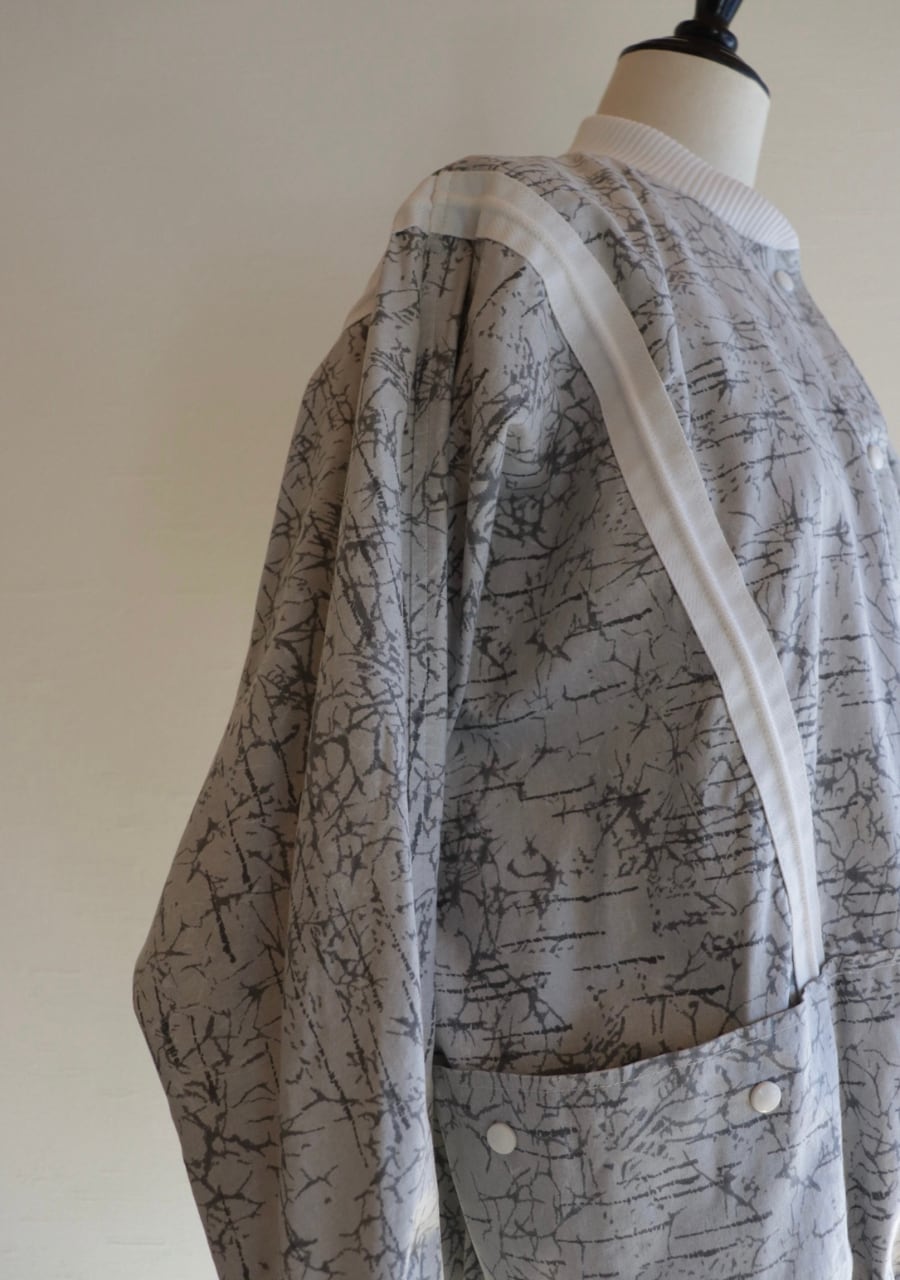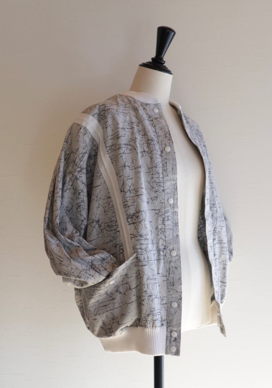薄手で軽く爽やかな肌触りの生地。透け感はなくリブ部分は柔らかく伸縮性があり柔らかく。グレーのプリントデザインに白のラインが爽やかな印象で春から初夏にかけて活躍してくれるアイテム。軽めのタッチで開閉できるスナップボタンもうれしい。ポケット部分にもスナップボタンを採用していてデザインが素敵です。ドルマンスリーブでゆったり着用できシルエットも可愛い。大変おすすめの一着!