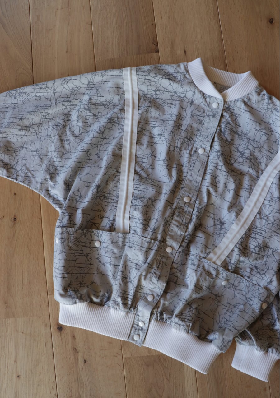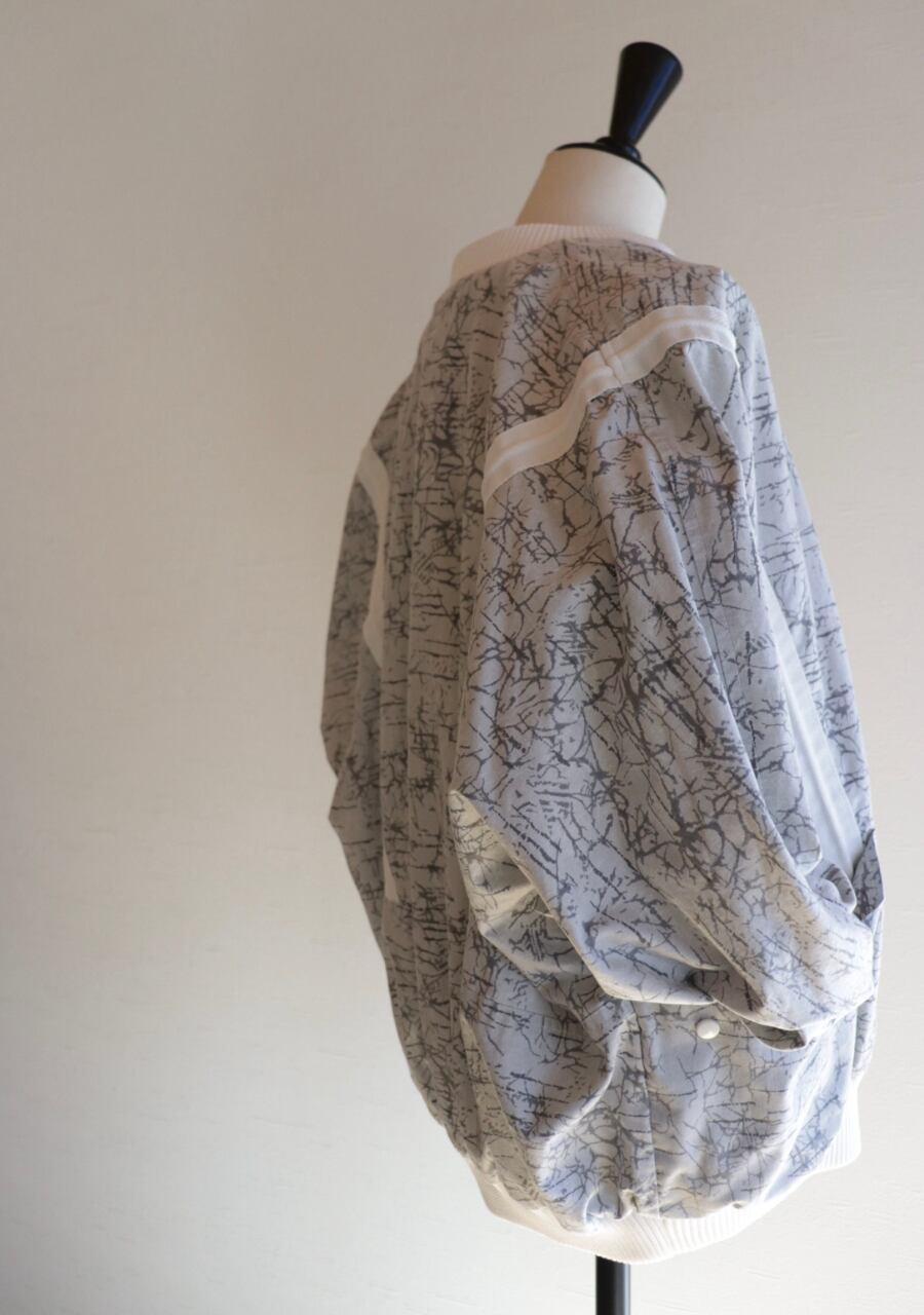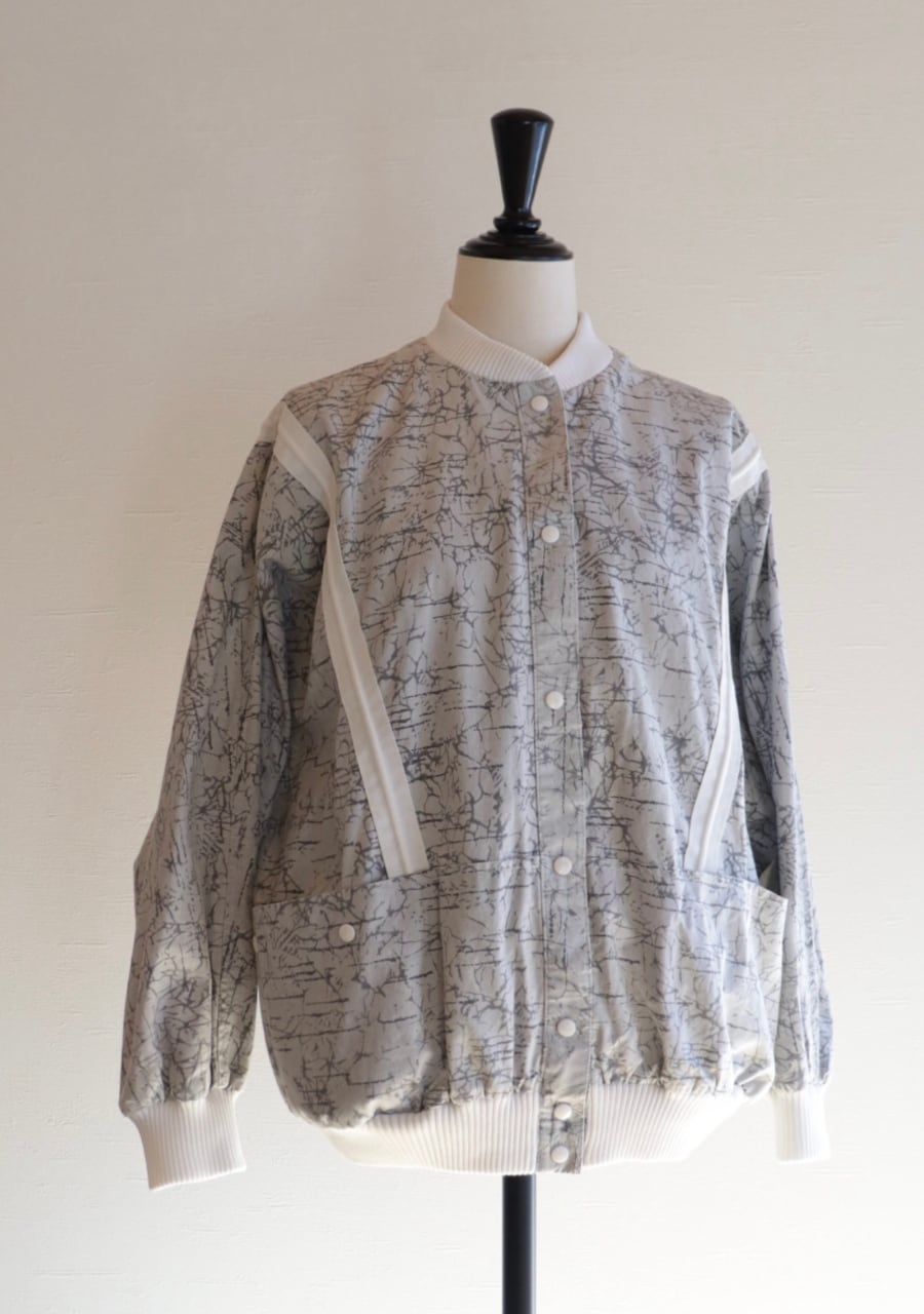 薄手で軽く爽やかな肌触りの生地。透け感はなくリブ部分は柔らかく伸縮性があり柔らかく。グレーのプリントデザインに白のラインが爽やかな印象で春から初夏にかけて活躍してくれるアイテム。軽めのタッチで開閉できるスナップボタンもうれしい。ポケット部分にもスナップボタンを採用していてデザインが素敵です。ドルマンスリーブでゆったり着用できシルエットも可愛い。大変おすすめの一着!