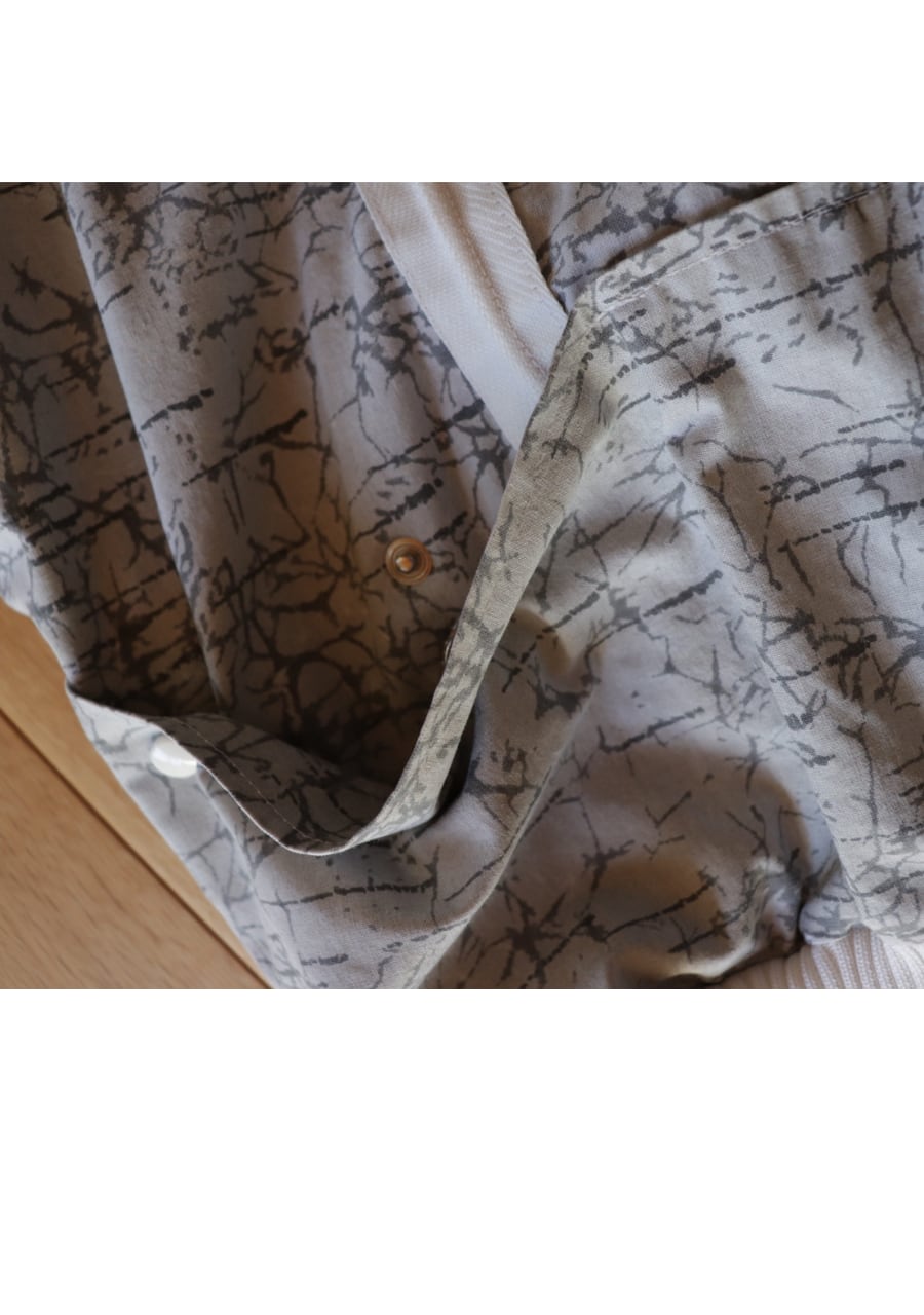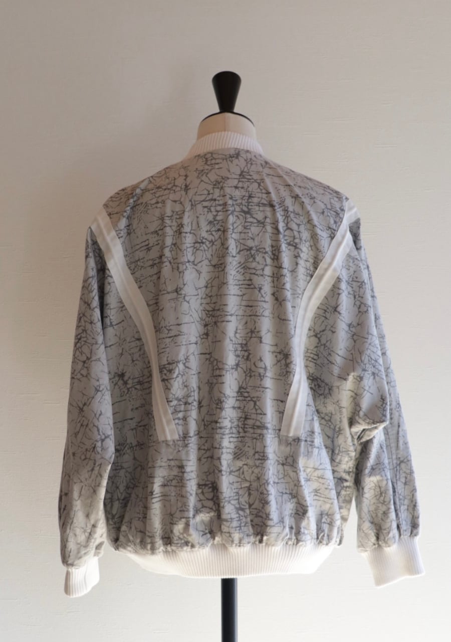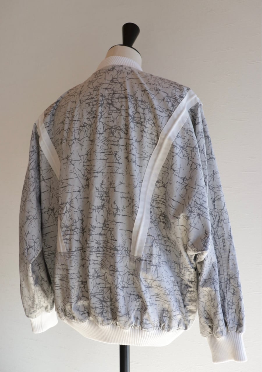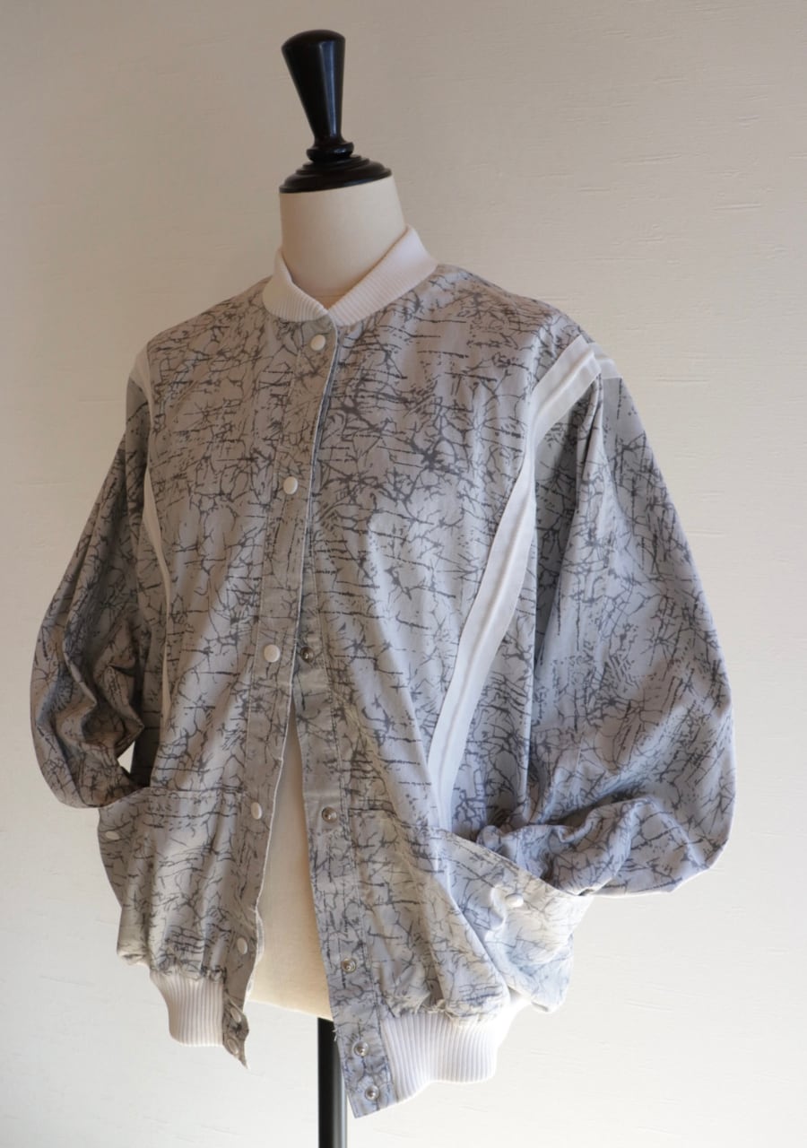薄手で軽く爽やかな肌触りの生地。透け感はなくリブ部分は柔らかく伸縮性があり柔らかく。グレーのプリントデザインに白のラインが爽やかな印象で春から初夏にかけて活躍してくれるアイテム。軽めのタッチで開閉できるスナップボタンもうれしい。ポケット部分にもスナップボタンを採用していてデザインが素敵です。ドルマンスリーブでゆったり着用できシルエットも可愛い。大変おすすめの一着!