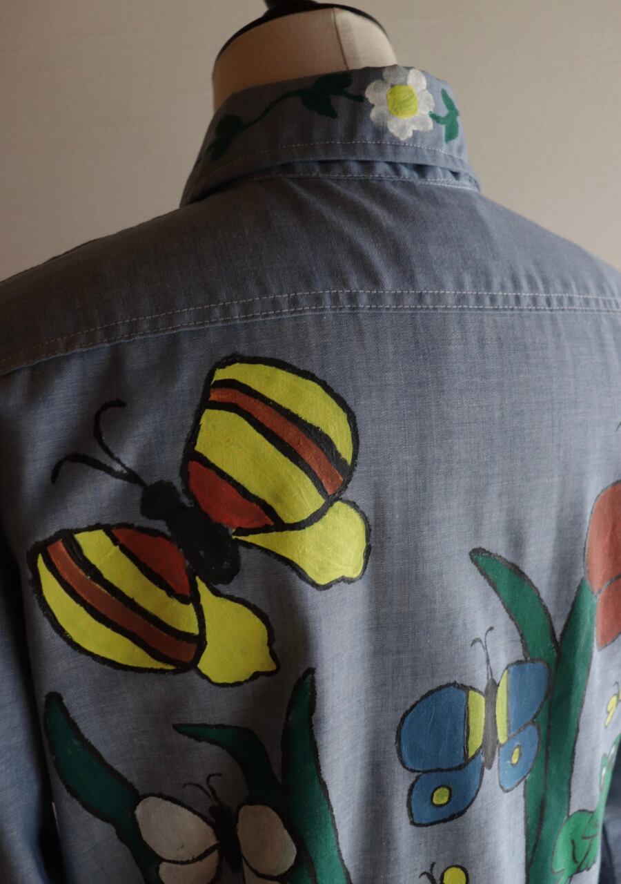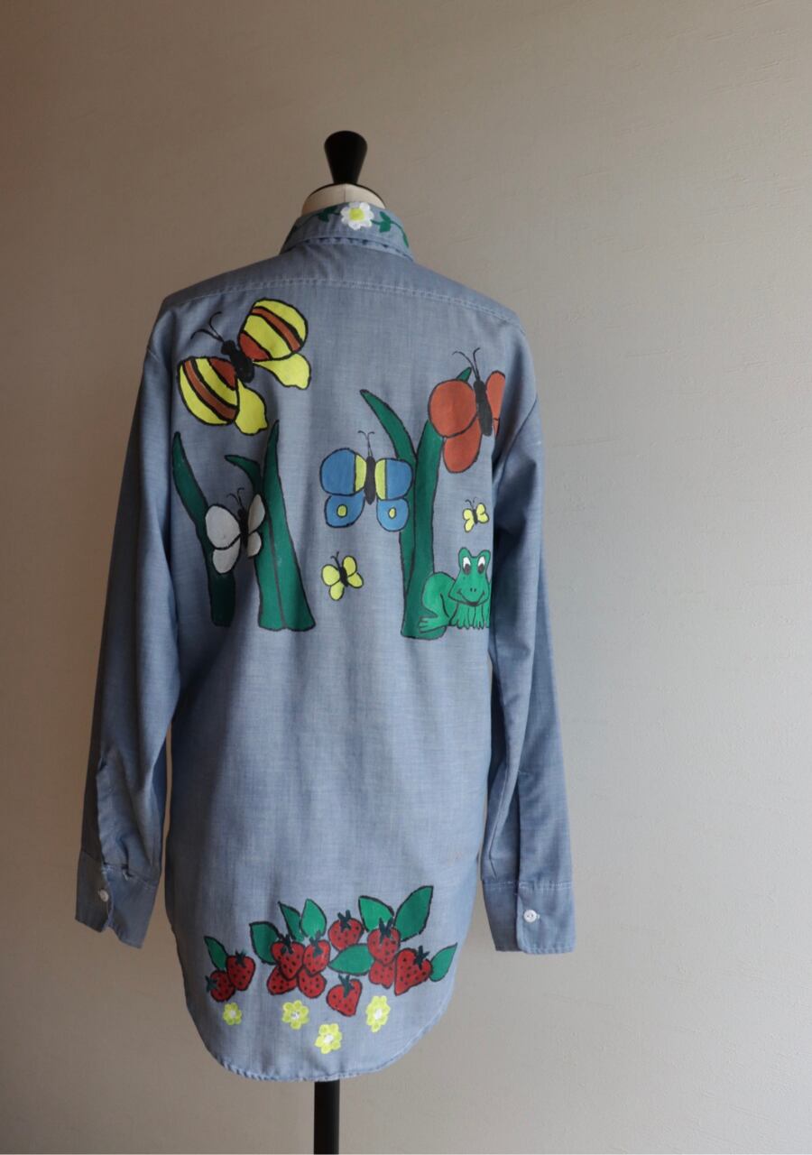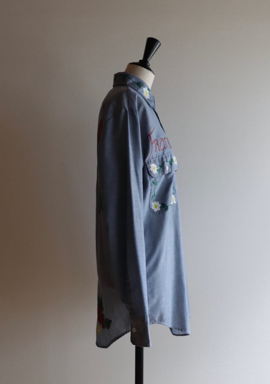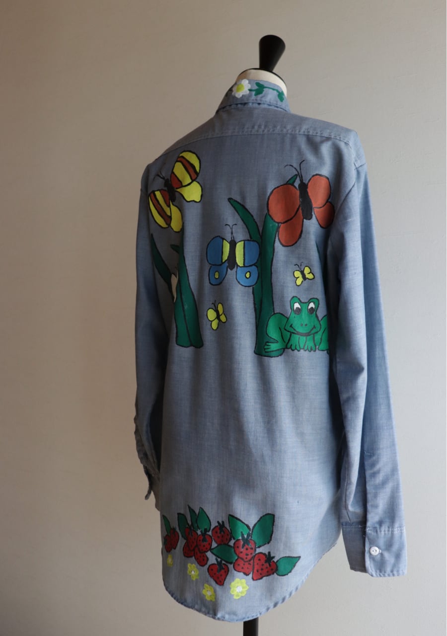 ペイントがかなり可愛いシャツ。薄手の生地に全体的にペイントされていてどこから見ても素敵で可愛くて言うおとなしの個性豊かなシャツ。ブルーの生地が何にでも合わせやすい。ペイントのカラー使いが豊かでポイントカラーをどの色を拾ってスタイリングを組んでもよいのが嬉しい。とても可愛い世界に一つだけのシャツ!是非!