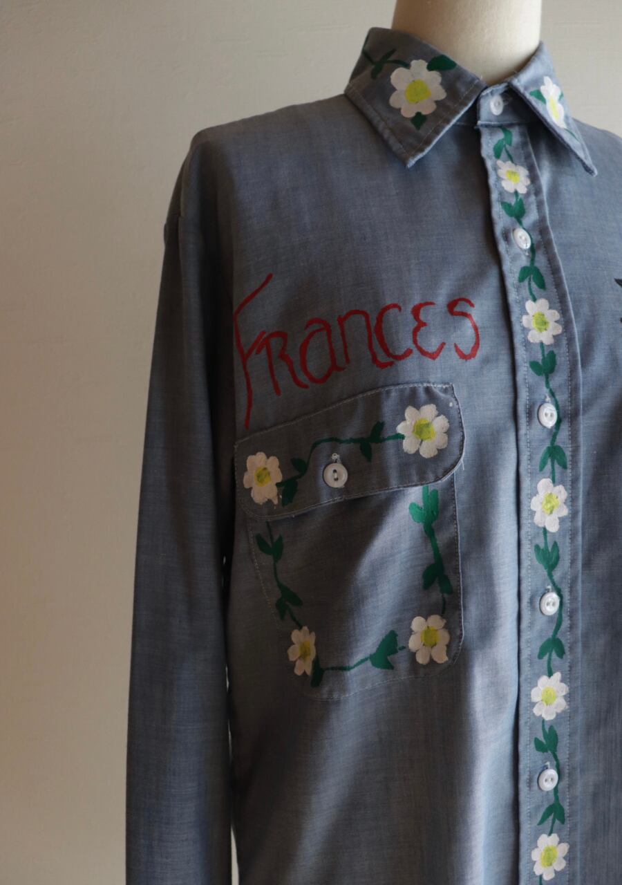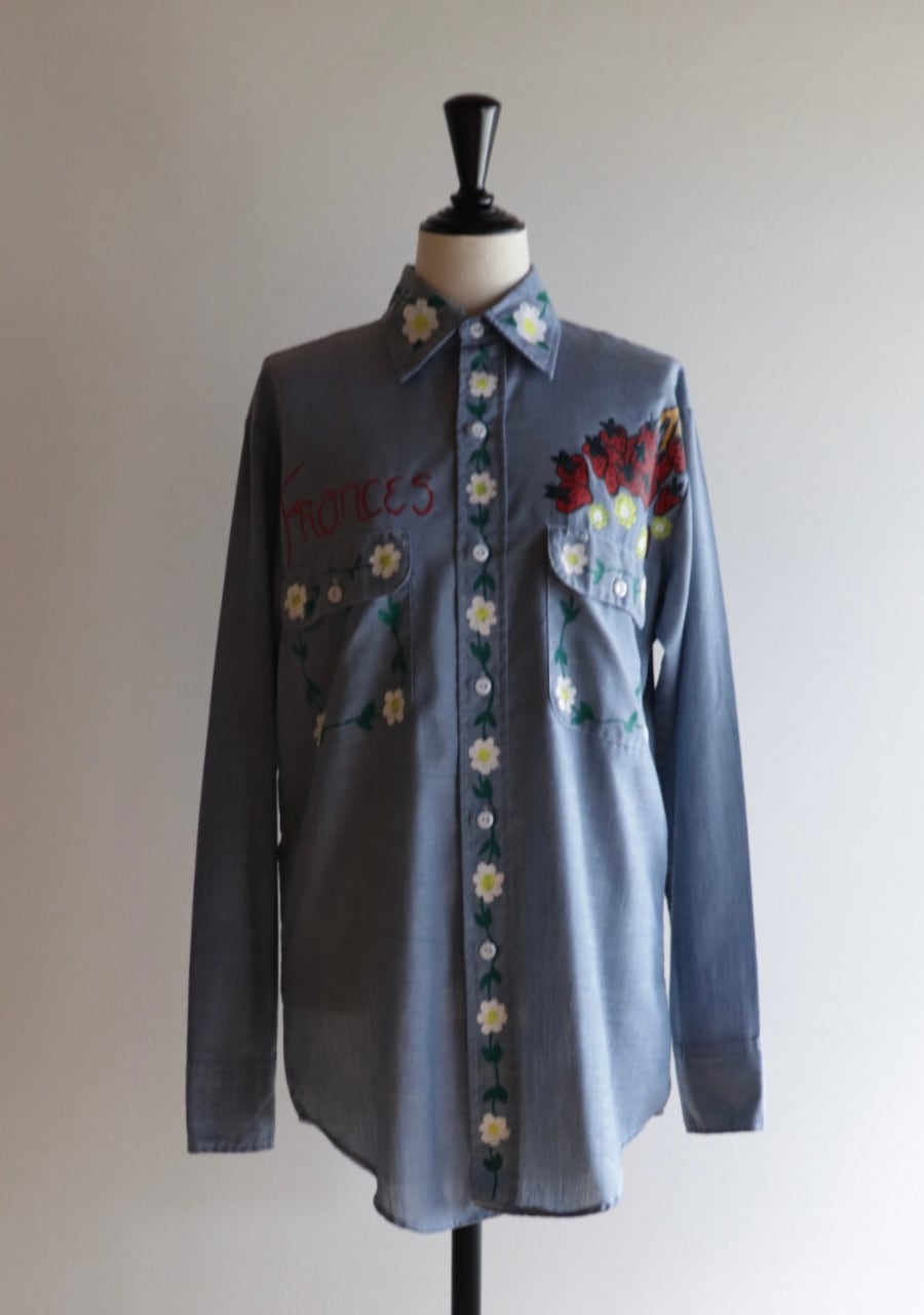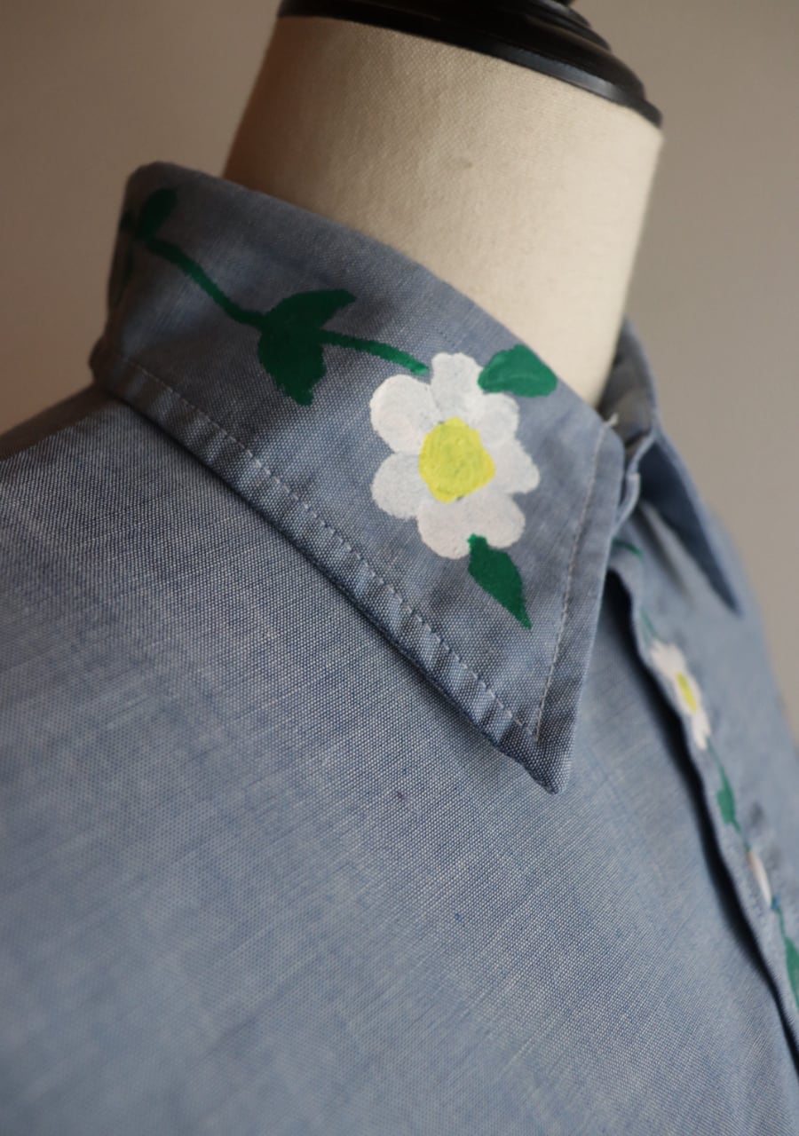 ペイントがかなり可愛いシャツ。薄手の生地に全体的にペイントされていてどこから見ても素敵で可愛くて言うおとなしの個性豊かなシャツ。ブルーの生地が何にでも合わせやすい。ペイントのカラー使いが豊かでポイントカラーをどの色を拾ってスタイリングを組んでもよいのが嬉しい。とても可愛い世界に一つだけのシャツ!是非!