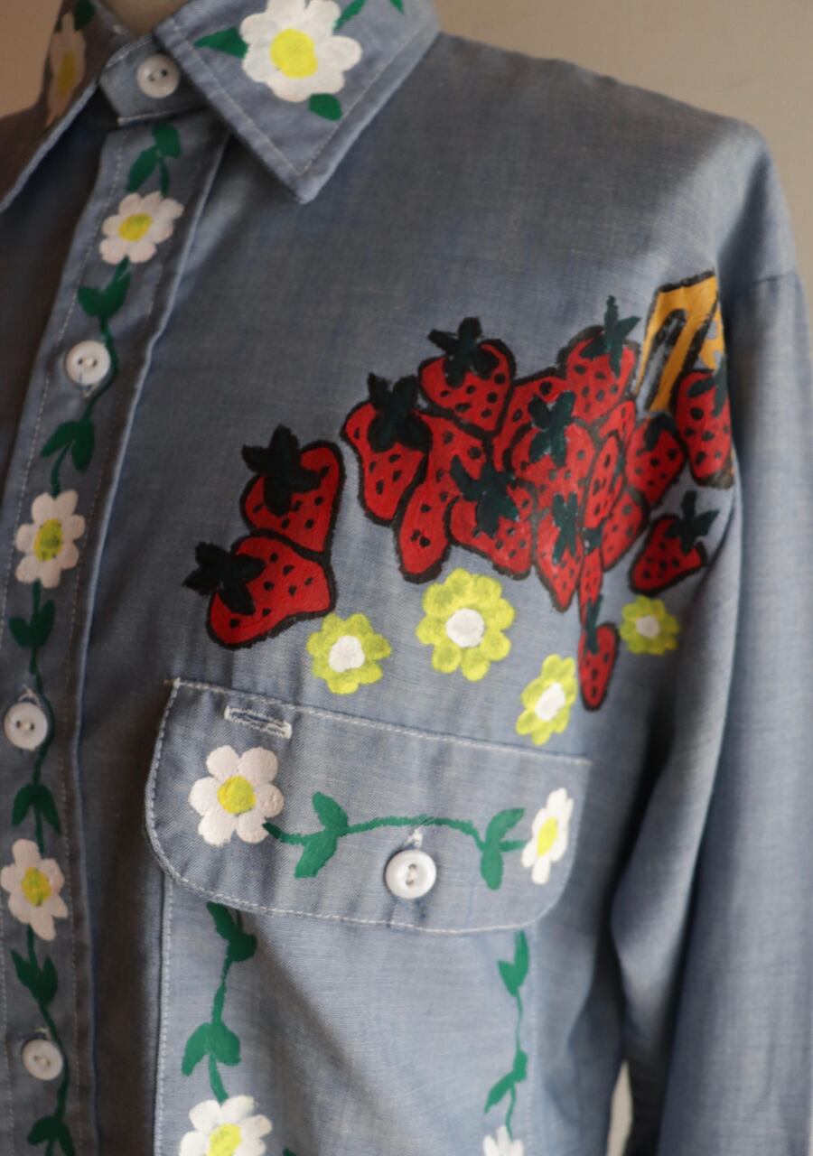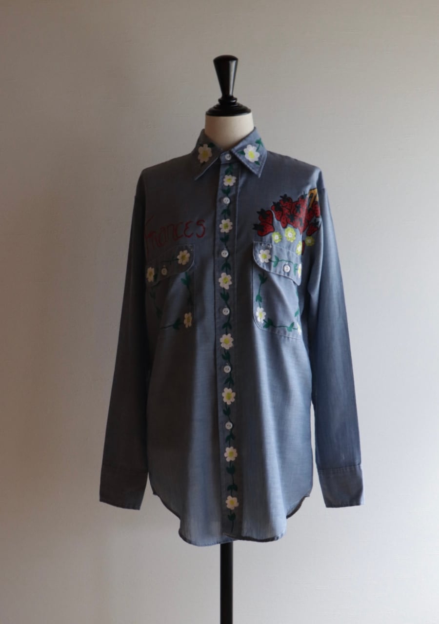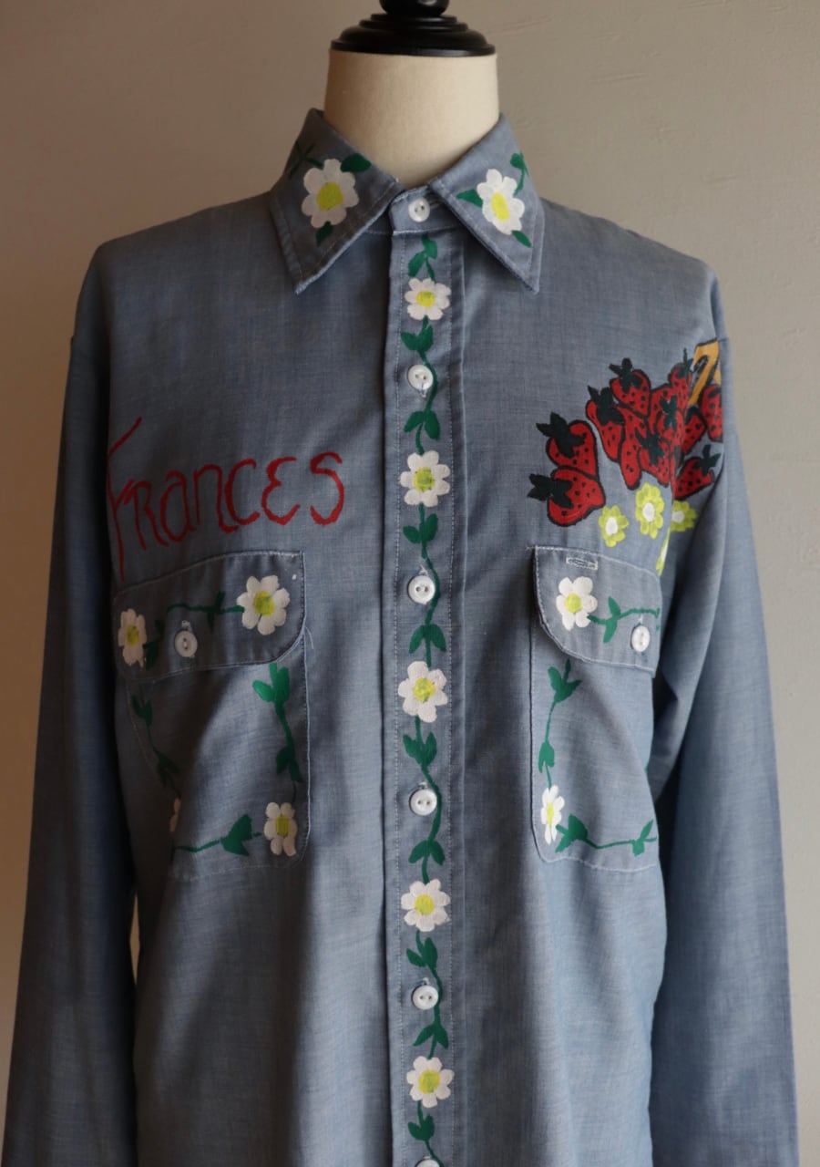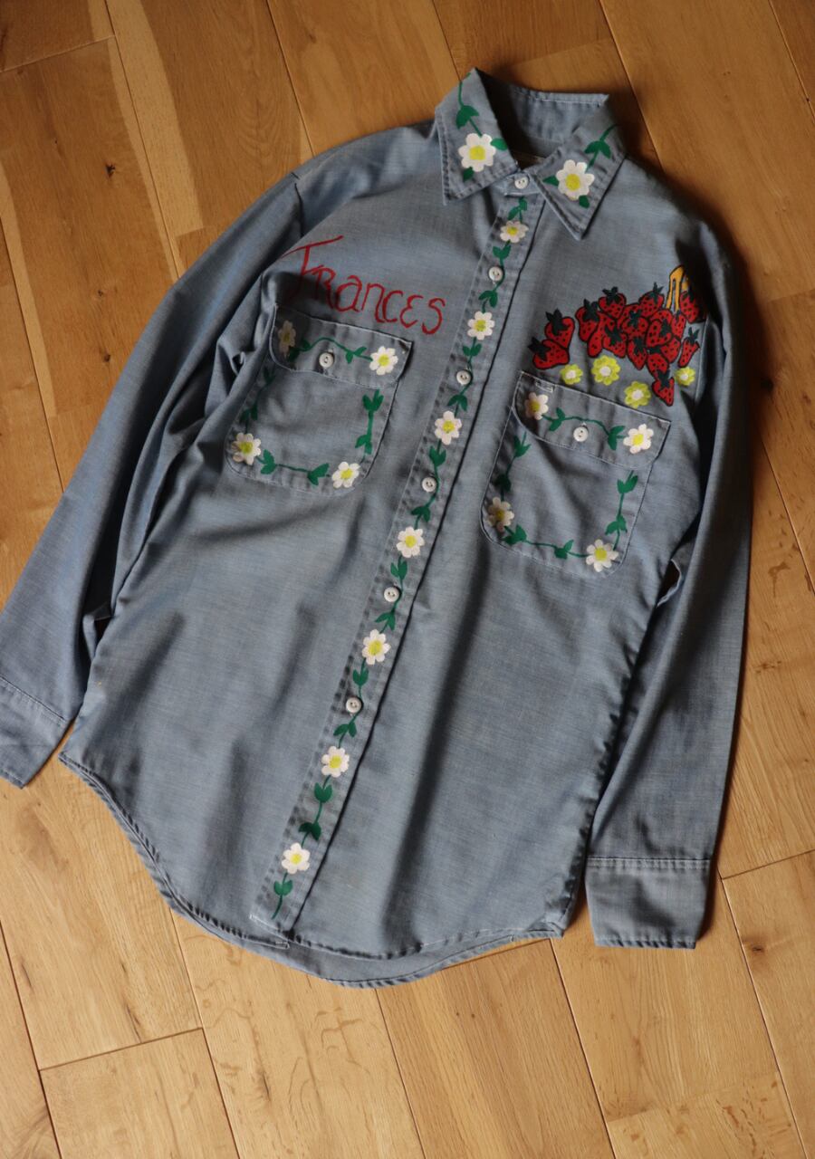 ペイントがかなり可愛いシャツ。薄手の生地に全体的にペイントされていてどこから見ても素敵で可愛くて言うおとなしの個性豊かなシャツ。ブルーの生地が何にでも合わせやすい。ペイントのカラー使いが豊かでポイントカラーをどの色を拾ってスタイリングを組んでもよいのが嬉しい。とても可愛い世界に一つだけのシャツ!是非!