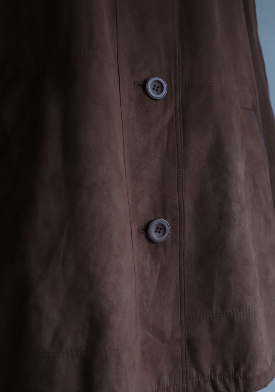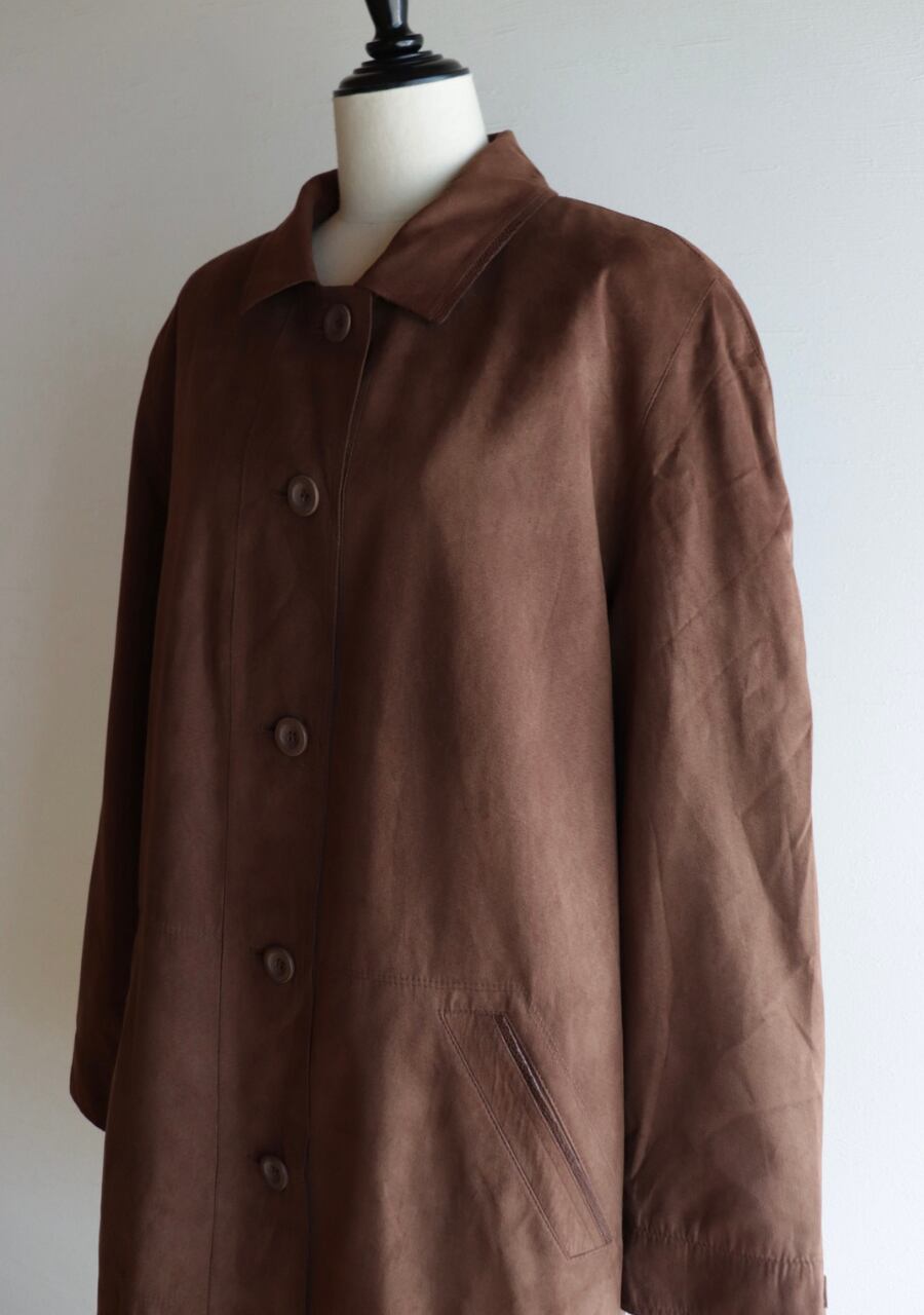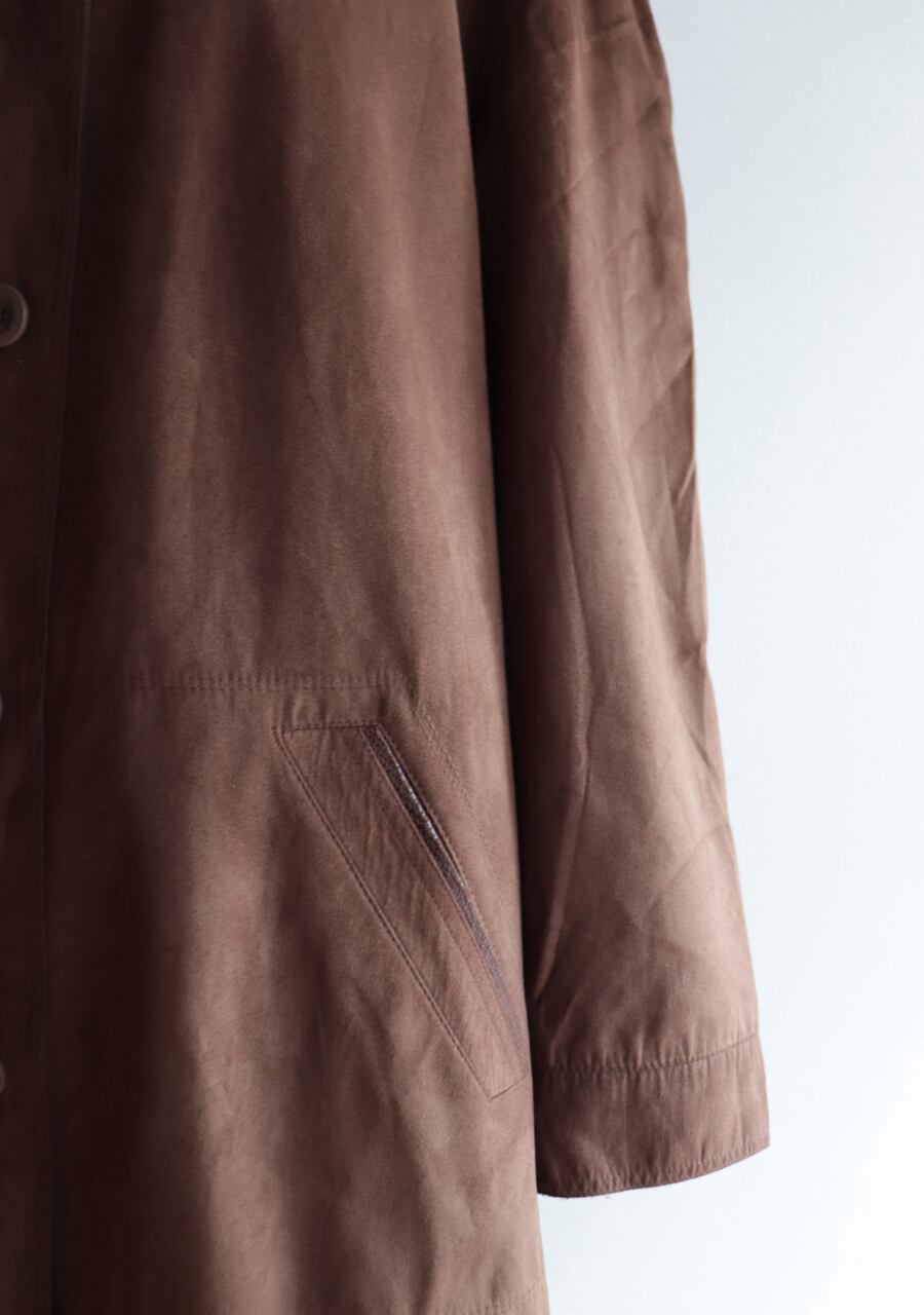 軽く柔らかくしなやかなスウェード調に加工されたポリエステル素材のコート。その素材の質感はまるで本物のスウェードそのもの。扱いやすいのもうれしい。軽くゆったりと羽織れるのでこの季節に一枚羽織れる優れたアイテムに。今季のトレンドをおさえたスタイリングが可能で機能性もありシンプルなデザインで活躍できるアイテム。色味も優しい印象のブラウンで上品にカジュアルにも。