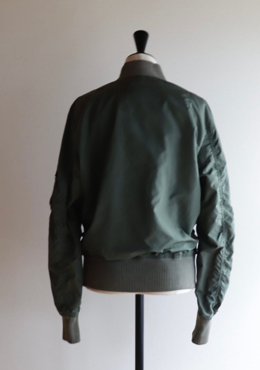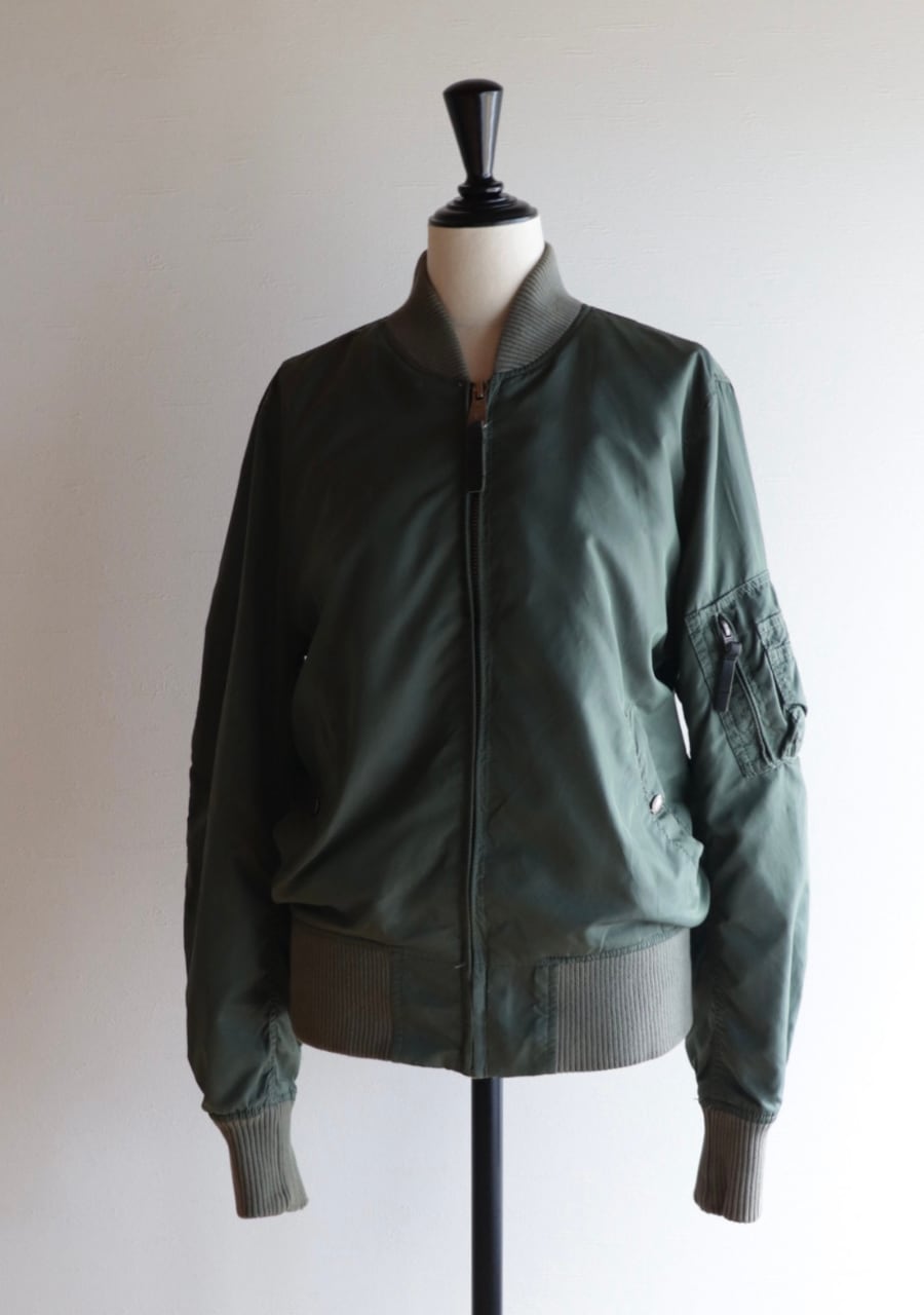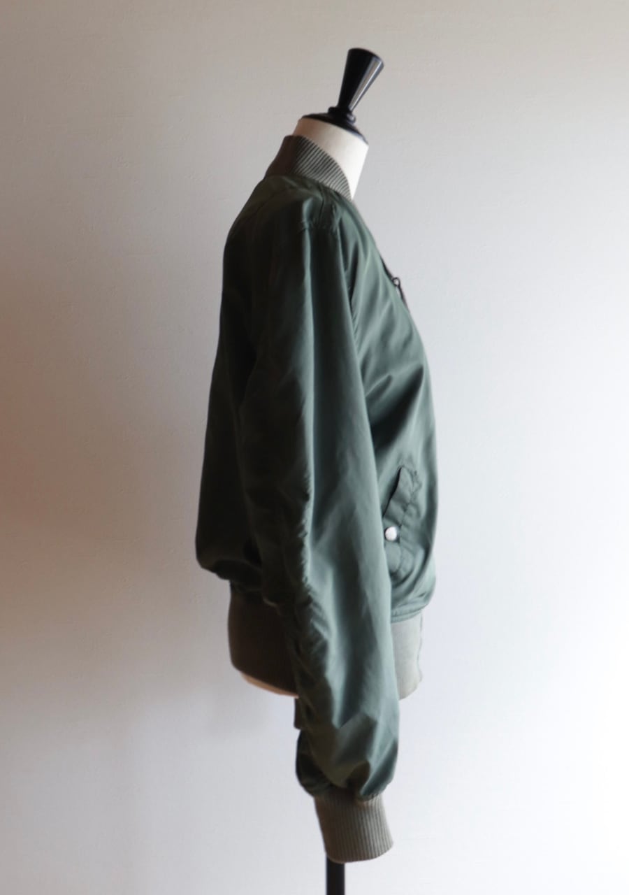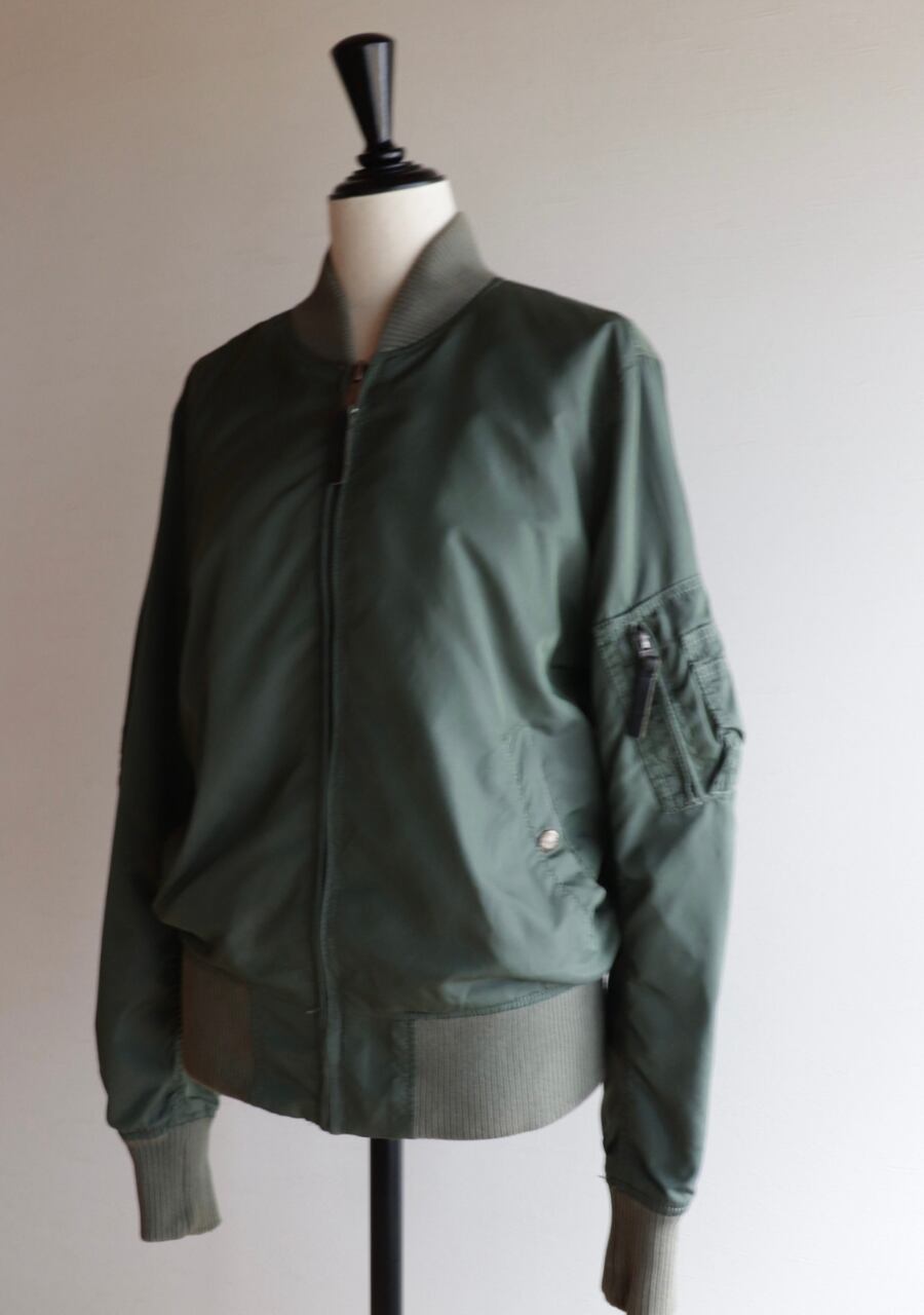 Alpha Industries 民間用MA-1中綿無し。やわらかいリブに背中からうでにかけて流石の動きやすい裁断と縫製でシルエットも素敵。女性が着用するのに良いサイズ感。色味は少し濃いめのsageカラー。春に活躍してくれるアイテム。