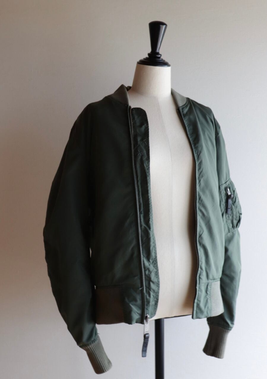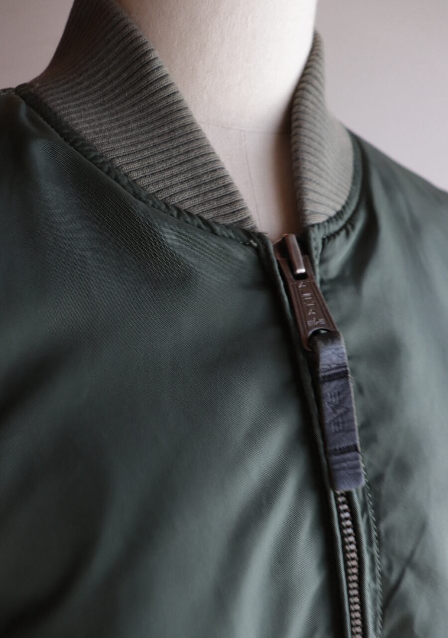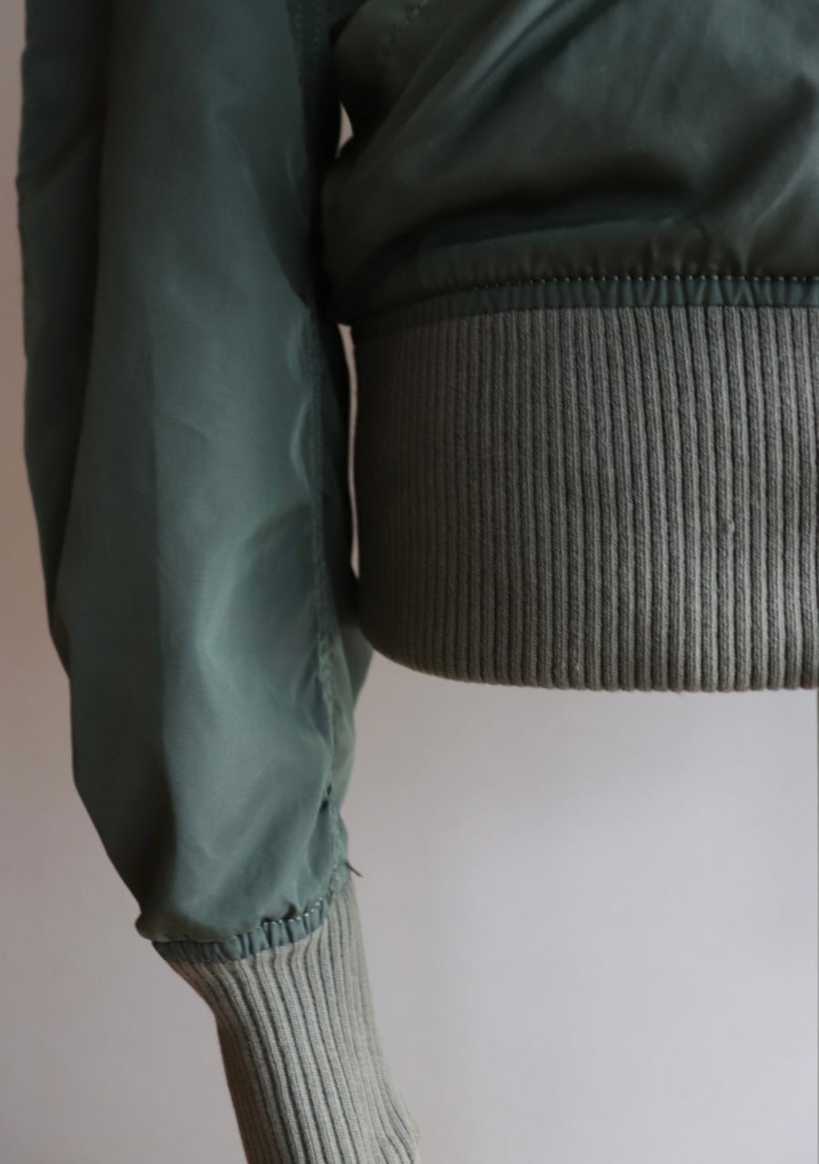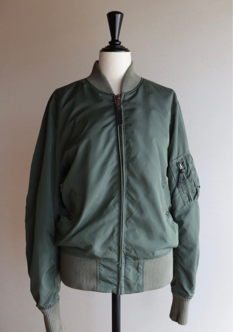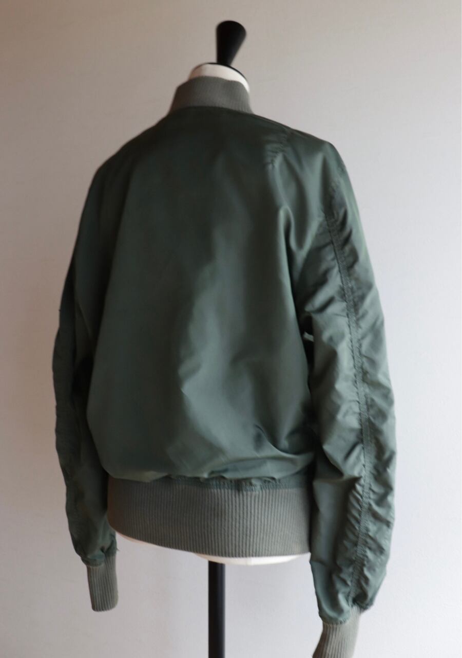 Alpha Industries 民間用MA-1中綿無し。やわらかいリブに背中からうでにかけて流石の動きやすい裁断と縫製でシルエットも素敵。女性が着用するのに良いサイズ感。色味は少し濃いめのsageカラー。春に活躍してくれるアイテム。