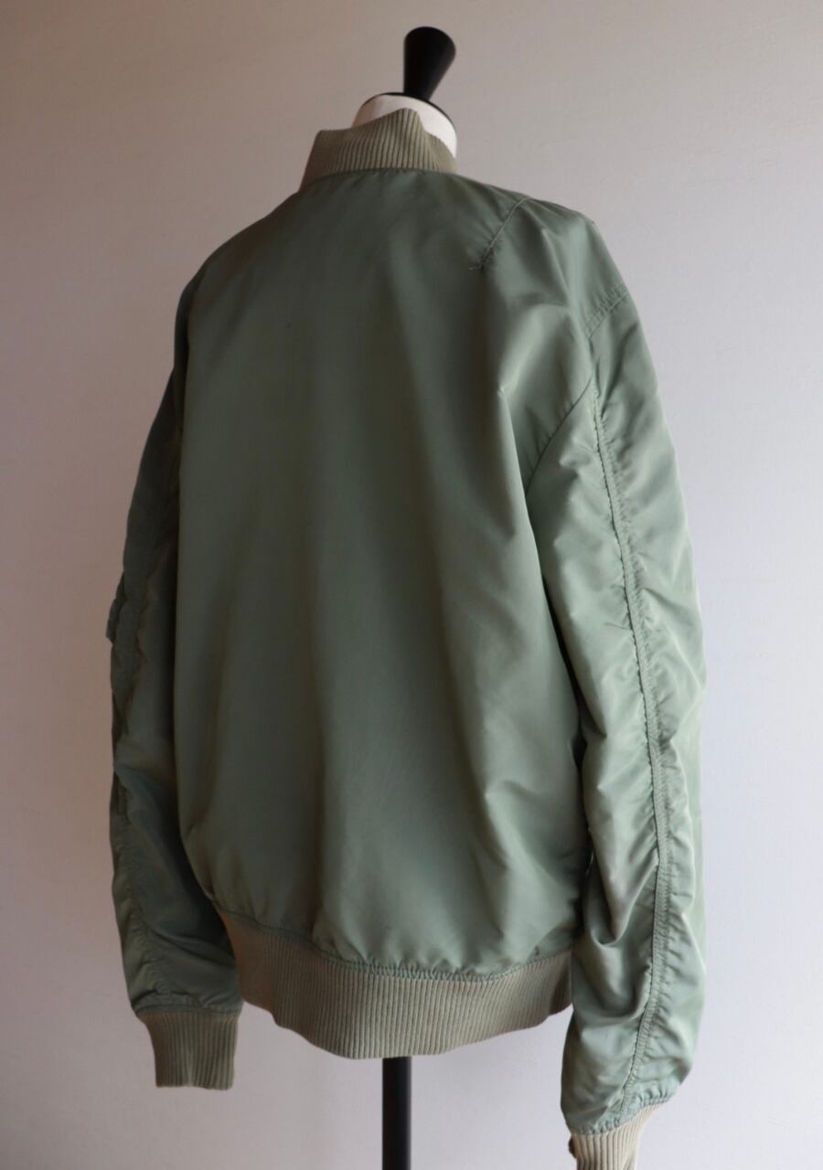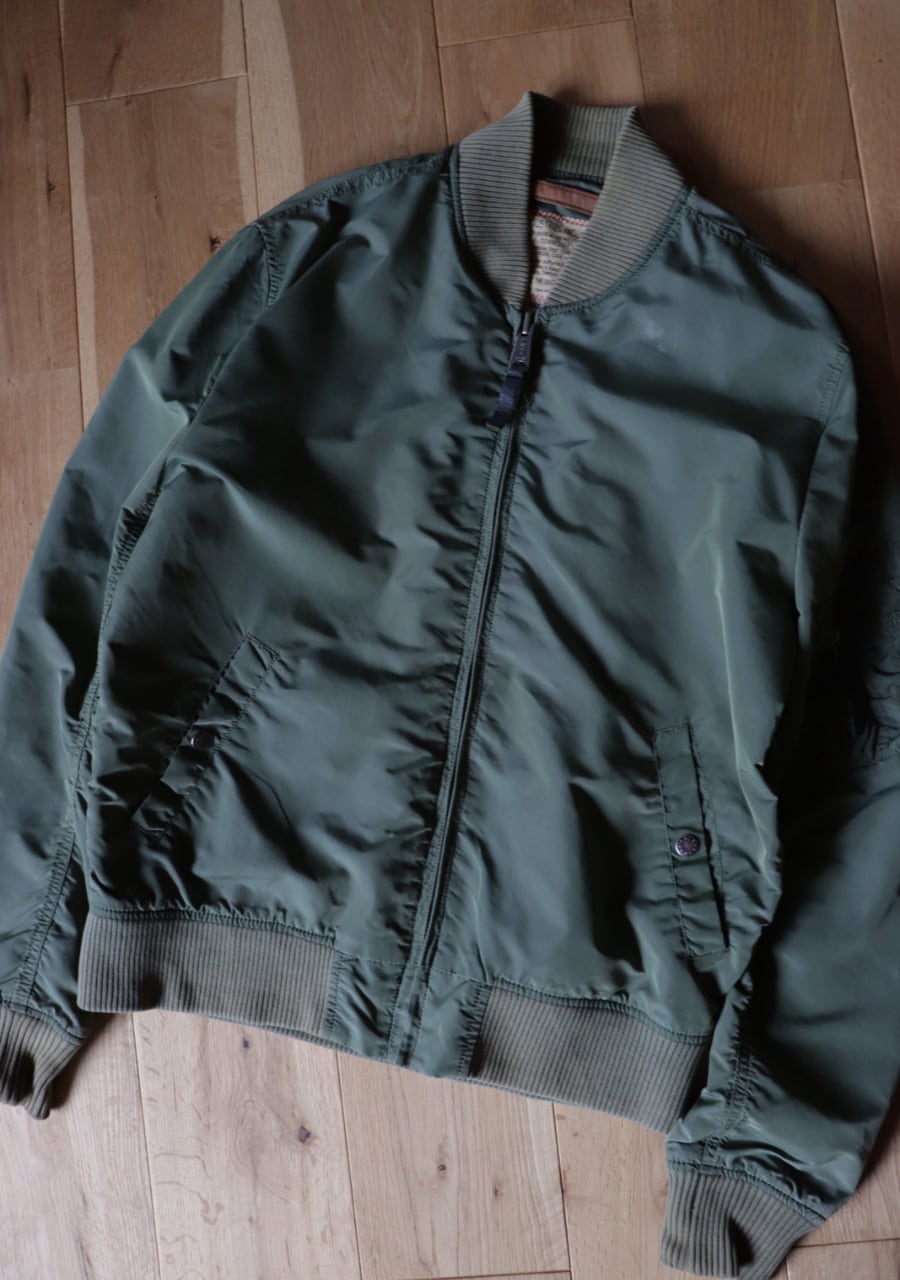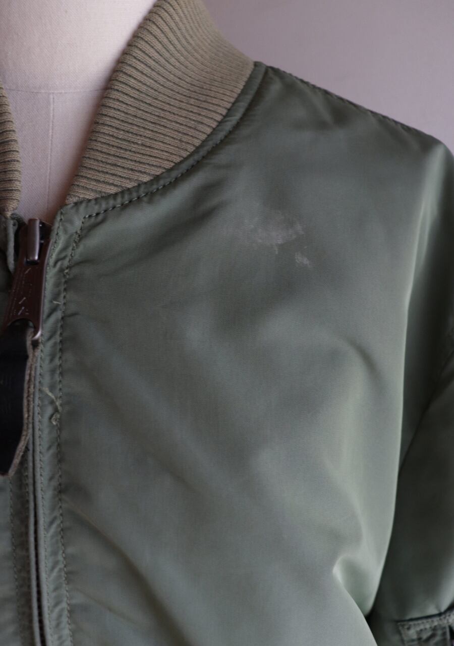 やや色味が優しく雰囲気抜群のAlpha Industries MA-1 。民間用中綿無しのタイプ。小さなキズや汚れ色あせが見られますが古着ならではの雰囲気があります。女性はややゆったり目に着用していただけるサイズ。機能性もあり季節の変わり目におしゃれを楽しんでいただける一着です。