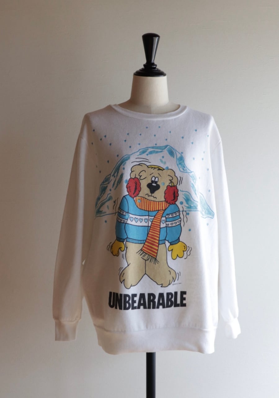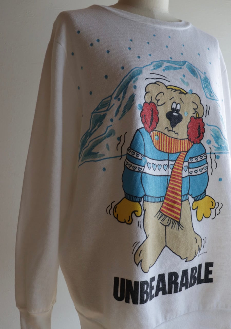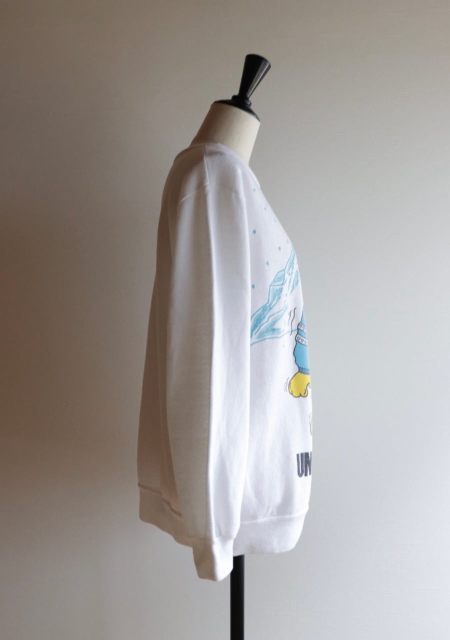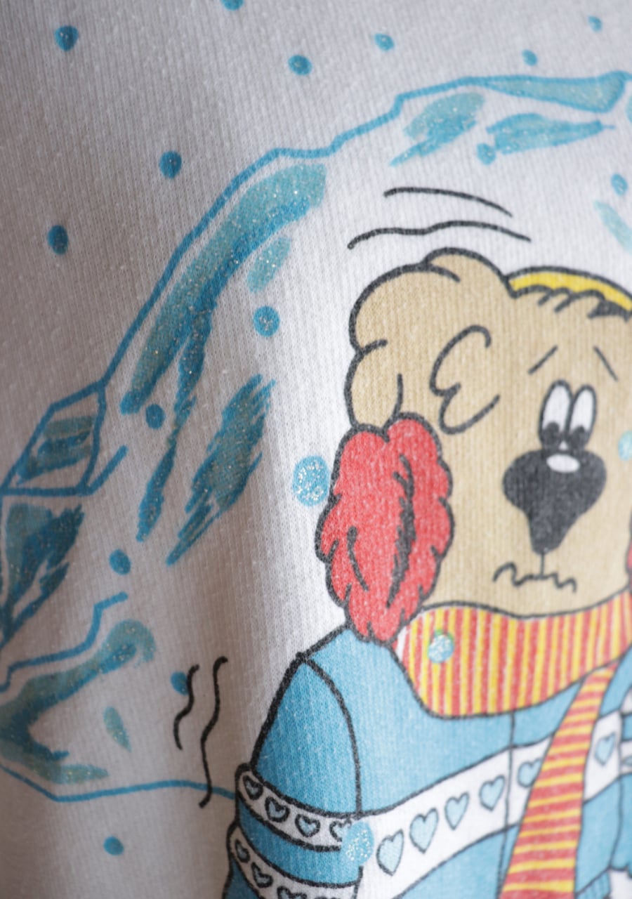 雪に凍える動物のプリントが可愛いスウェットシャツ。柔らかくやや薄手の生地感で裏起毛。