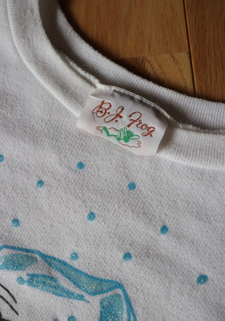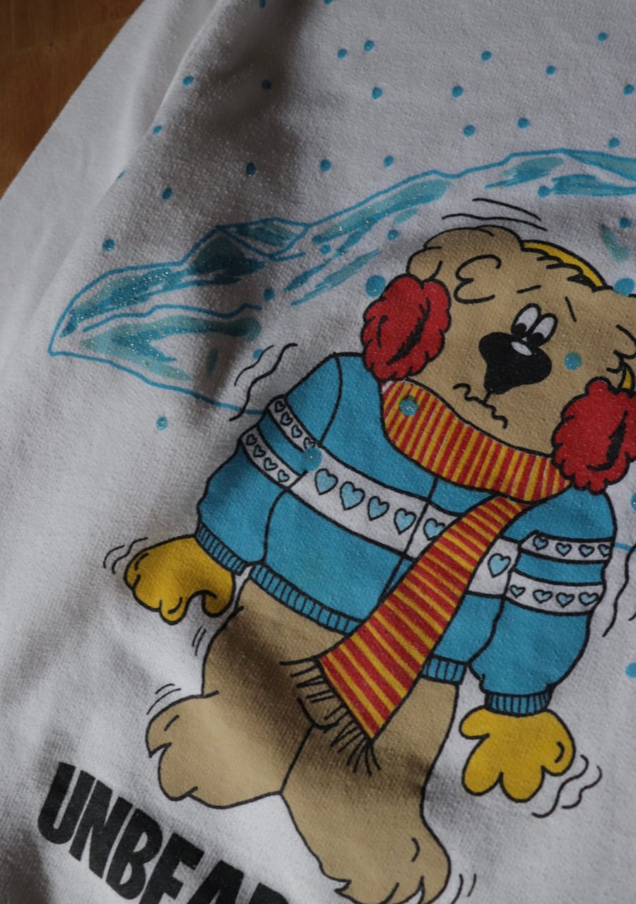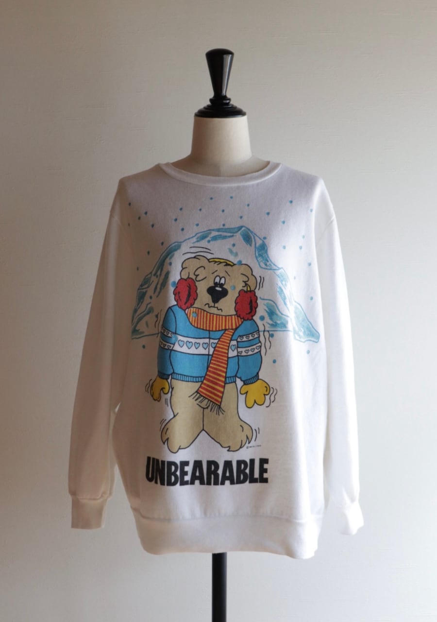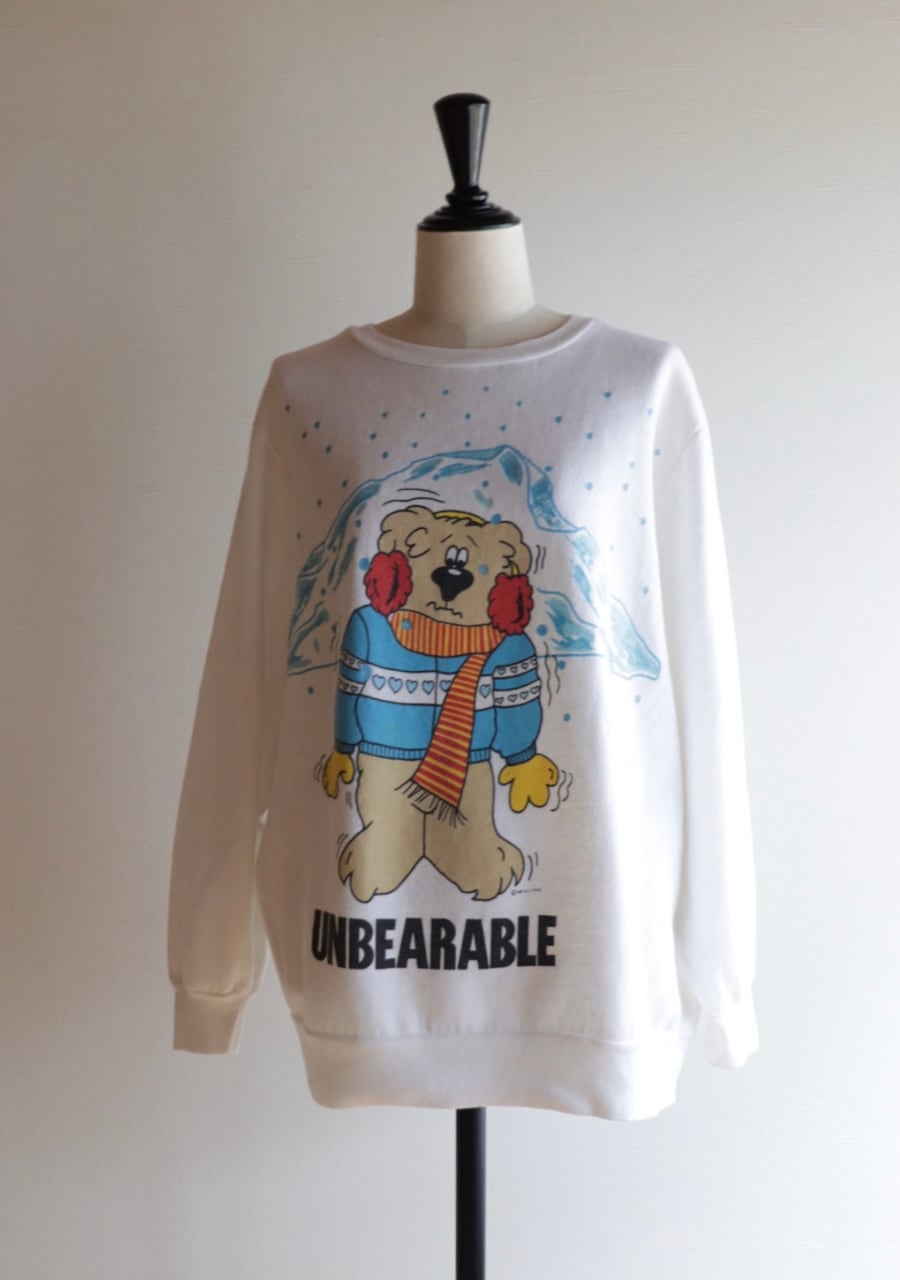 雪に凍える動物のプリントが可愛いスウェットシャツ。柔らかくやや薄手の生地感で裏起毛。