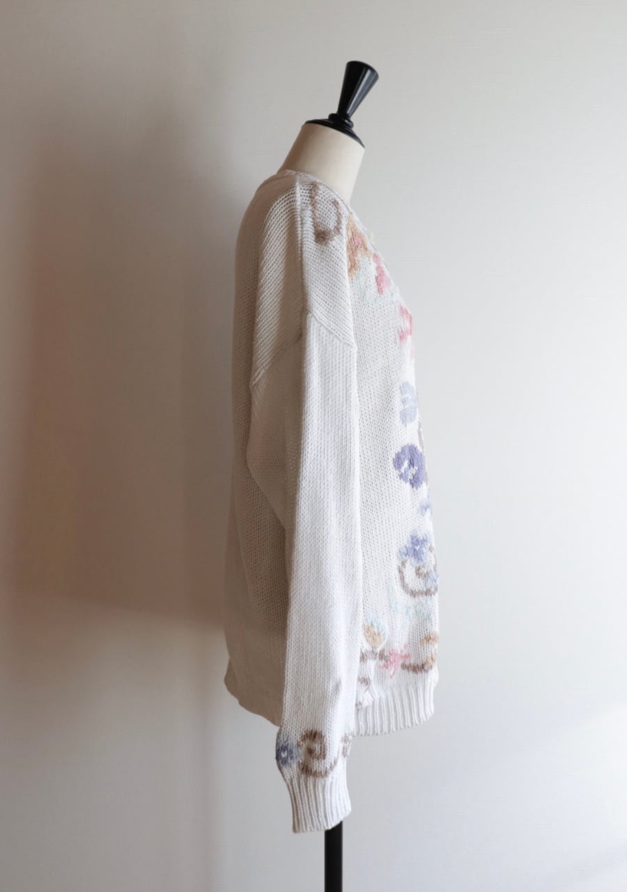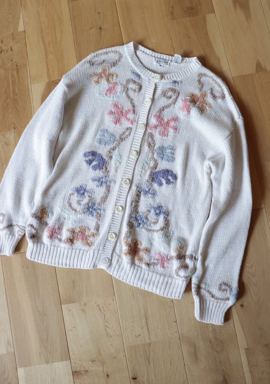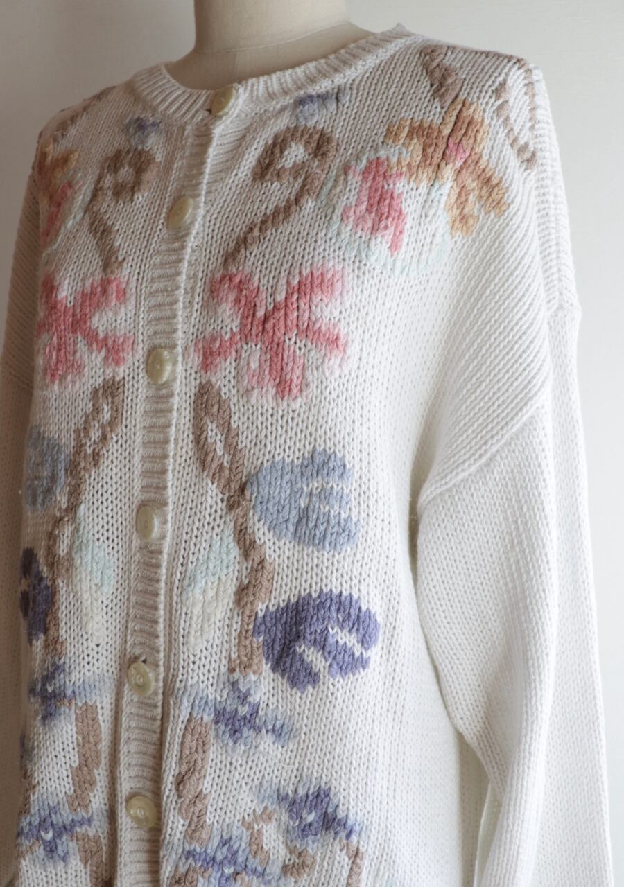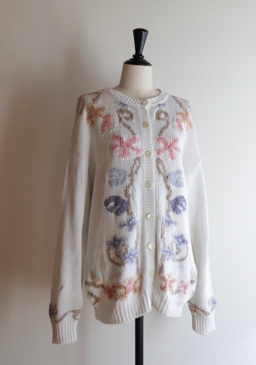 柔らかく肌触りの良いコットンカーディガン。フロントに淡いカラーで大振りの花柄がアクセント。ゆったりしたサイズで肩の落ち感袖のたまりがより優しい印象。159cm着用でお尻が隠れる丈感も癒されます。春の羽織りもので活躍してくれるアイテム。可愛い一着です。
