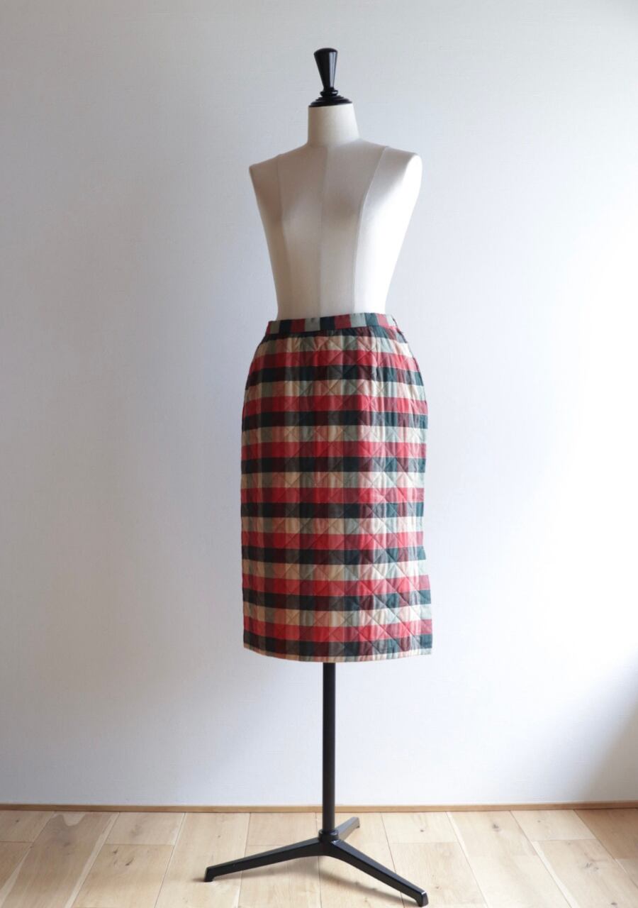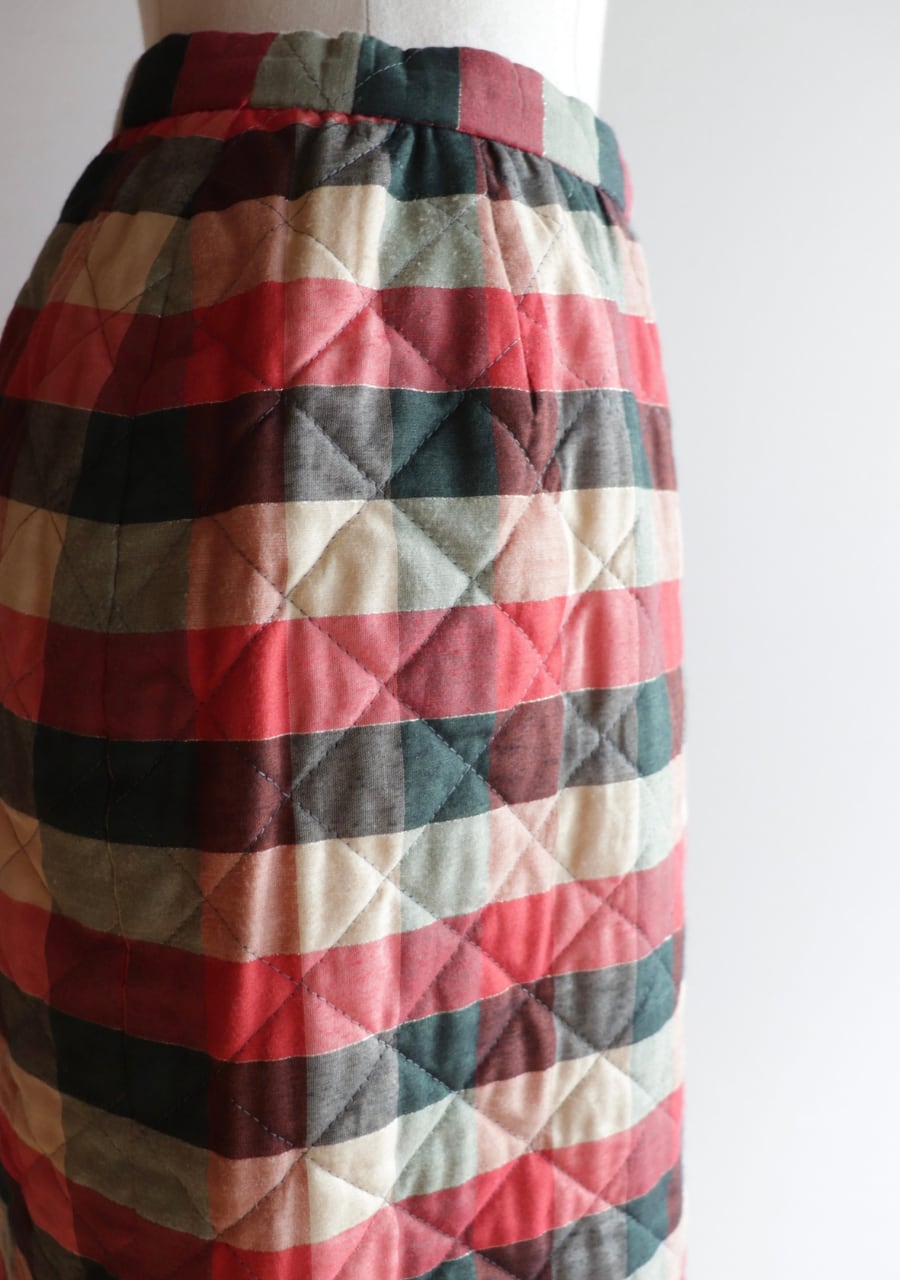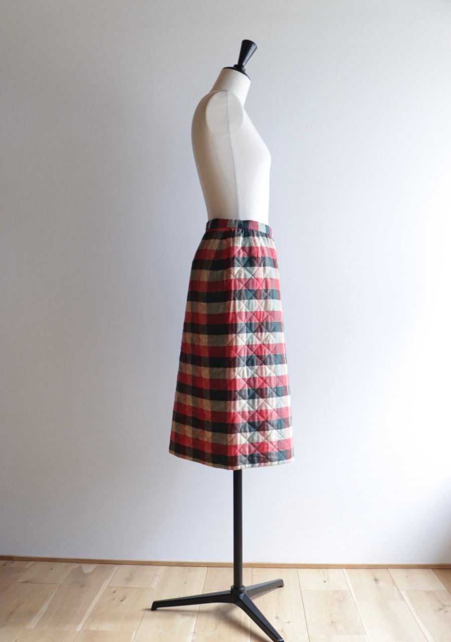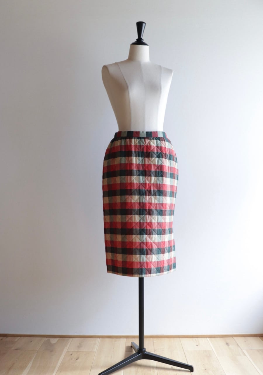 チェックの色味がかわいくキルティングのステッチが珍しいやや薄手のハンドメイドのスカート。細く入ったゴールドの糸で上品な華やかさもプラス。キルティングの質感が普通とは違う味のある一着です。裾にスリットも入っていて足捌きもよく綺麗なシルエット。レイヤードしても良しブーツやカラータイツとの合わせも可愛い。一味違ったスカートでコーディネートを楽しんでいただけます。
