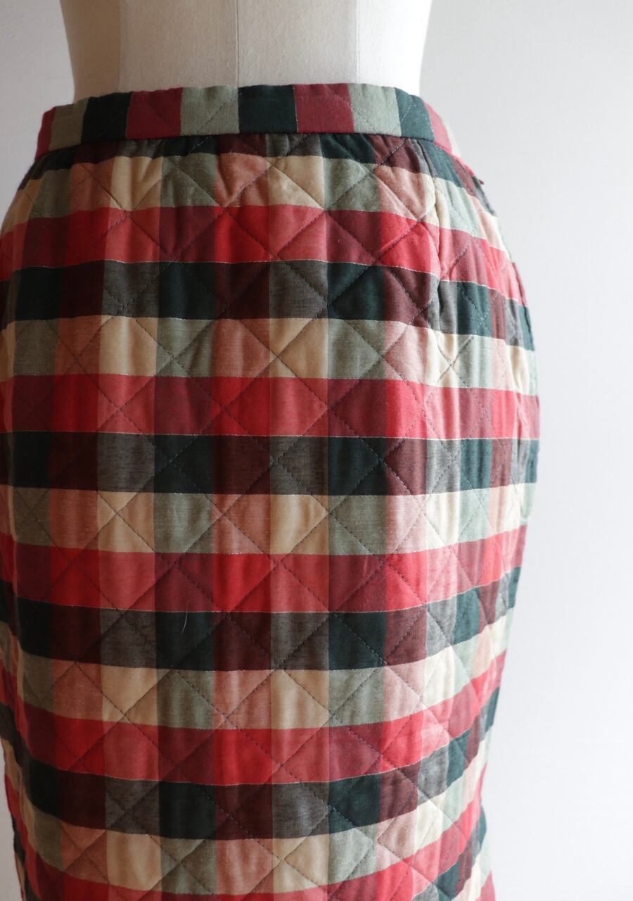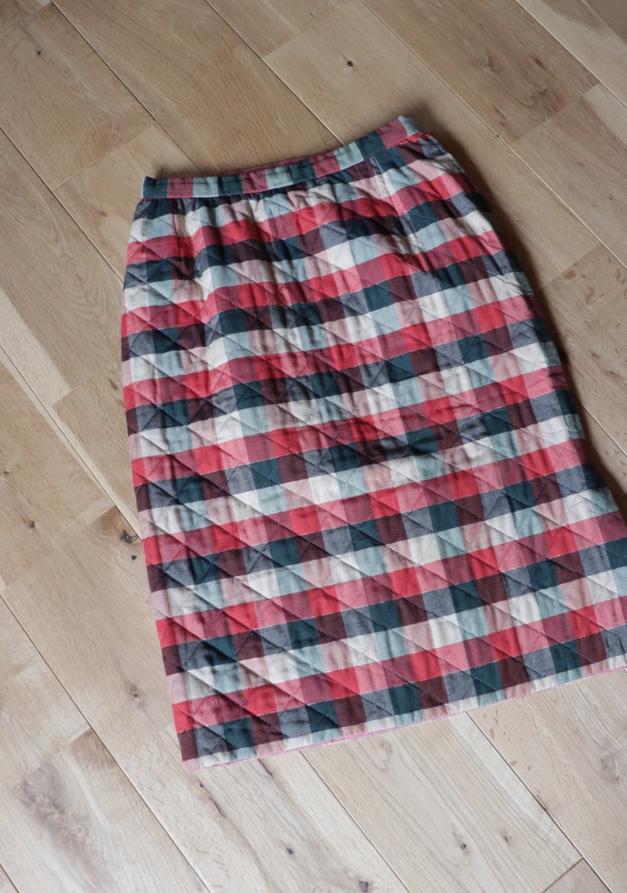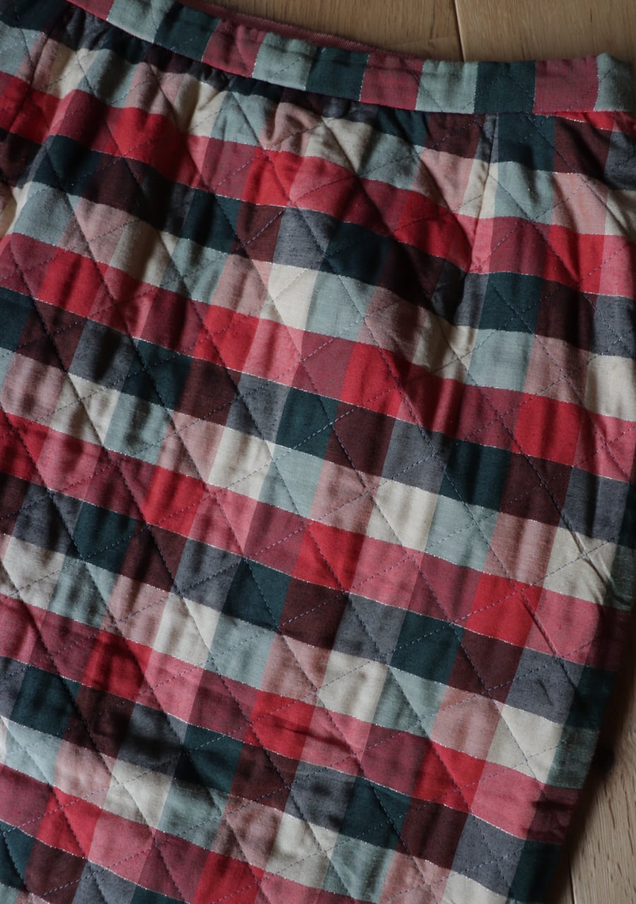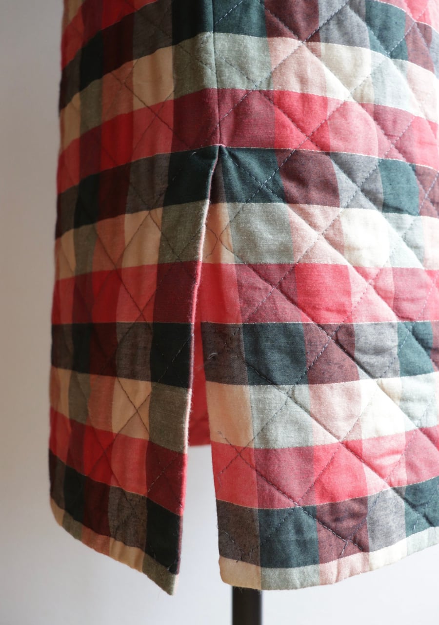チェックの色味がかわいくキルティングのステッチが珍しいやや薄手のハンドメイドのスカート。細く入ったゴールドの糸で上品な華やかさもプラス。キルティングの質感が普通とは違う味のある一着です。裾にスリットも入っていて足捌きもよく綺麗なシルエット。レイヤードしても良しブーツやカラータイツとの合わせも可愛い。一味違ったスカートでコーディネートを楽しんでいただけます。