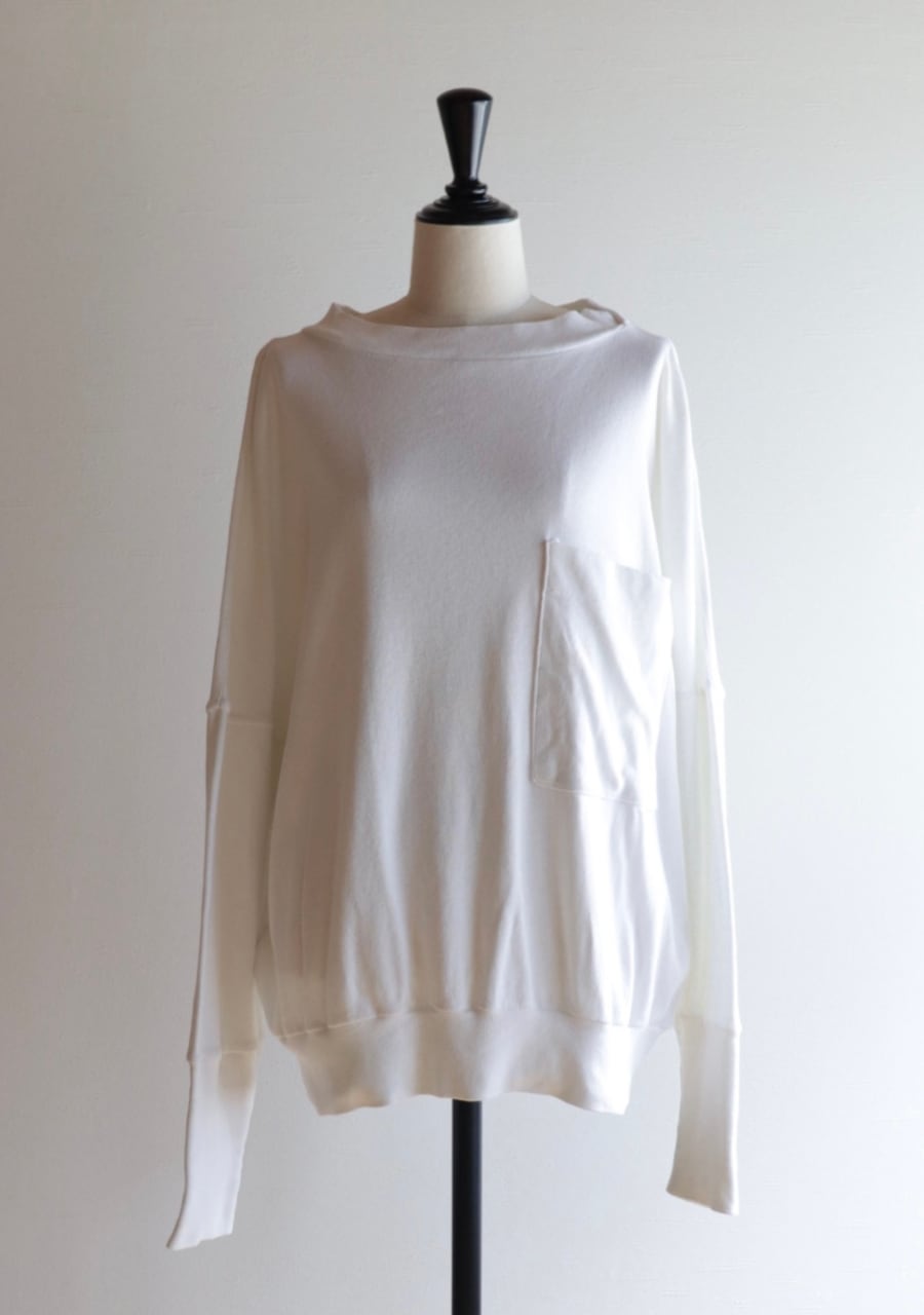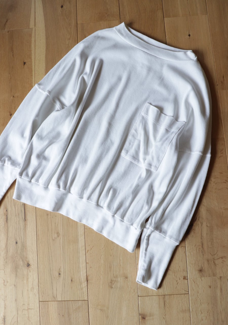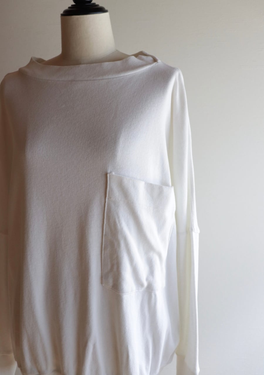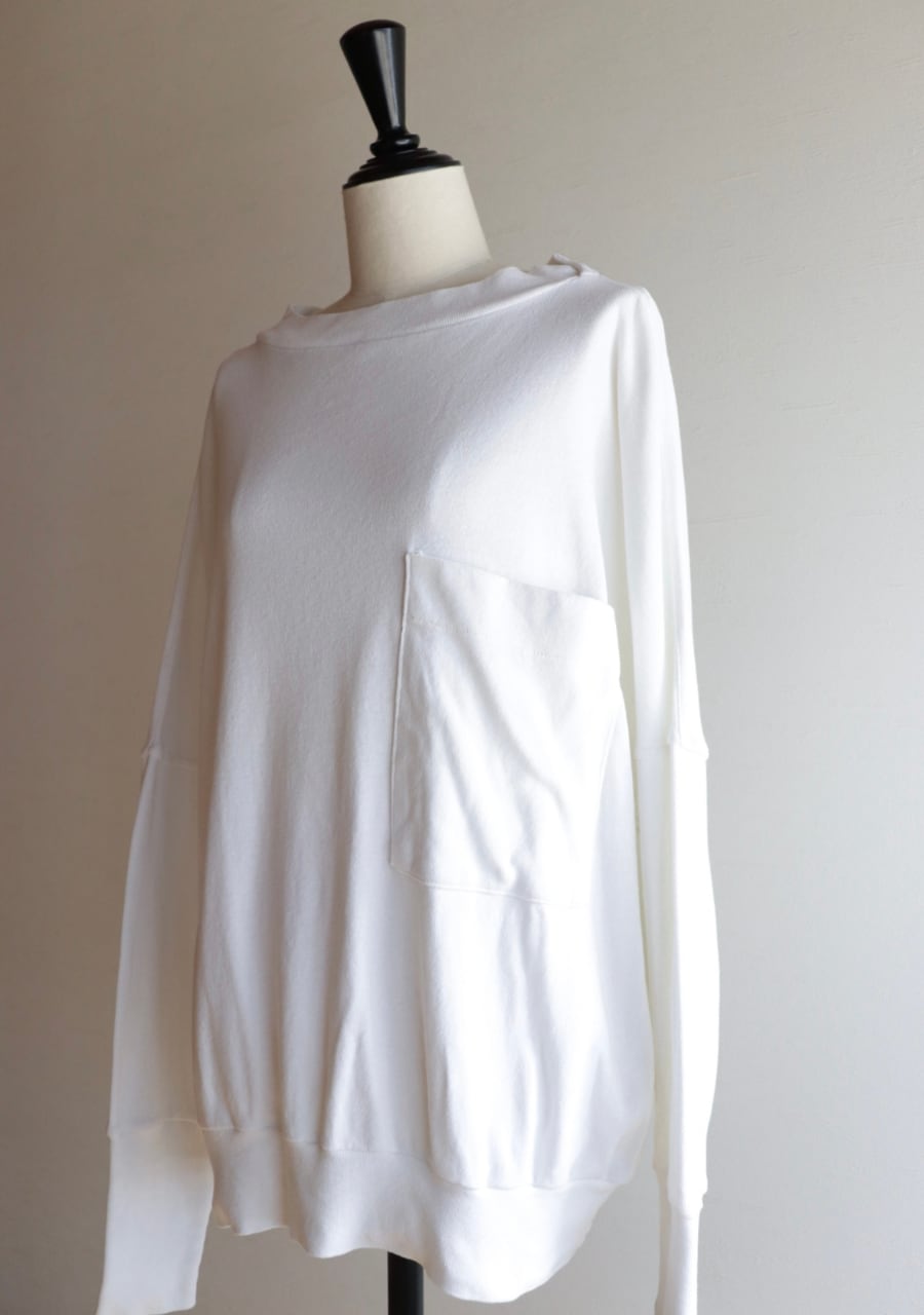 コットン素材のやや薄手の肌触りの良い生地。シンプルな中に首元は広めのボートネック、肩が大きく落ちて袖のリブが長め、フロントのポケットは大き目でいたるところのデザインが心掴まれるシャツ。こういうポイントがたまらなく合わせるボトムスも選ばず万能なアイテム。可愛いです。