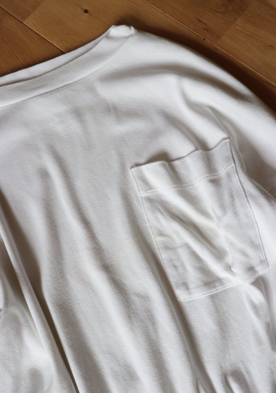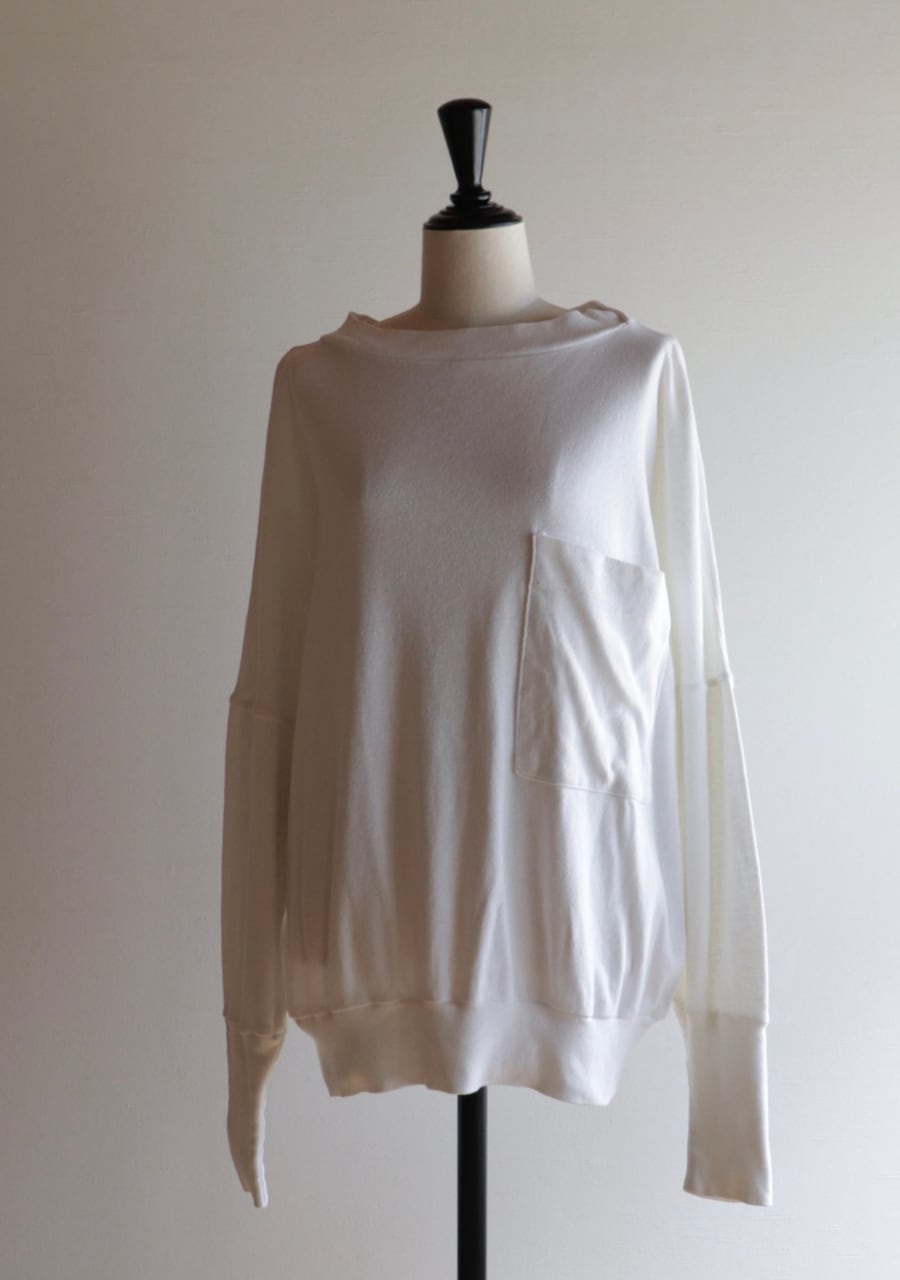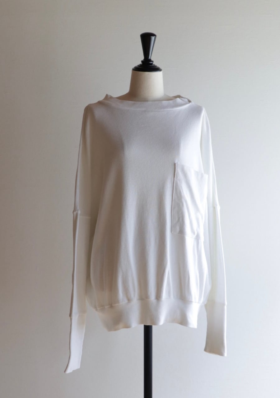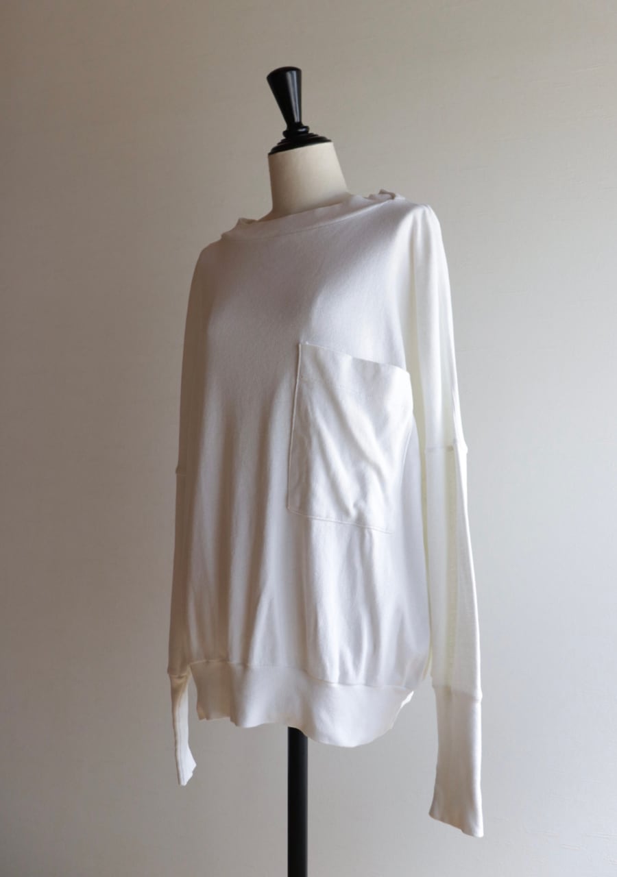 コットン素材のやや薄手の肌触りの良い生地。シンプルな中に首元は広めのボートネック、肩が大きく落ちて袖のリブが長め、フロントのポケットは大き目でいたるところのデザインが心掴まれるシャツ。こういうポイントがたまらなく合わせるボトムスも選ばず万能なアイテム。可愛いです。