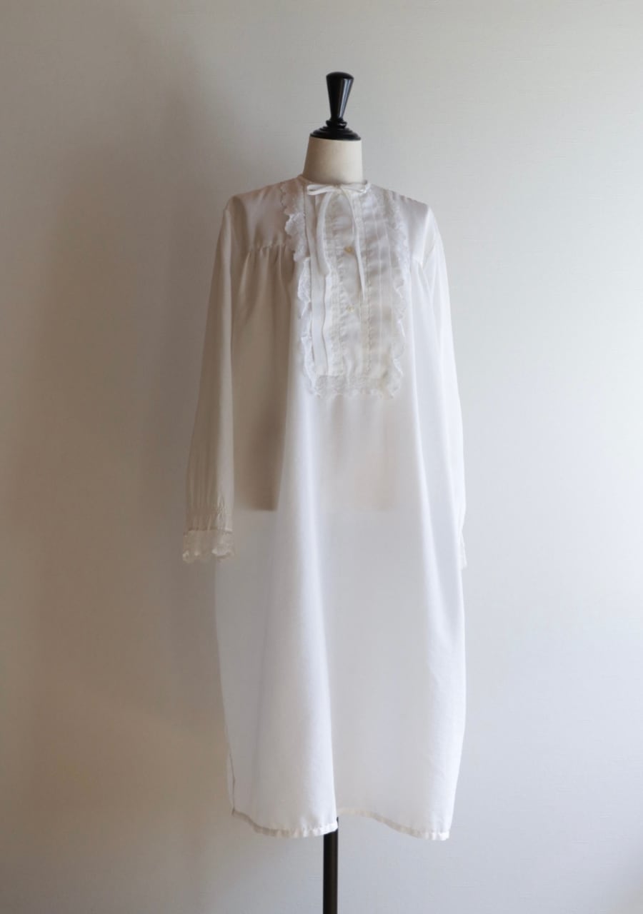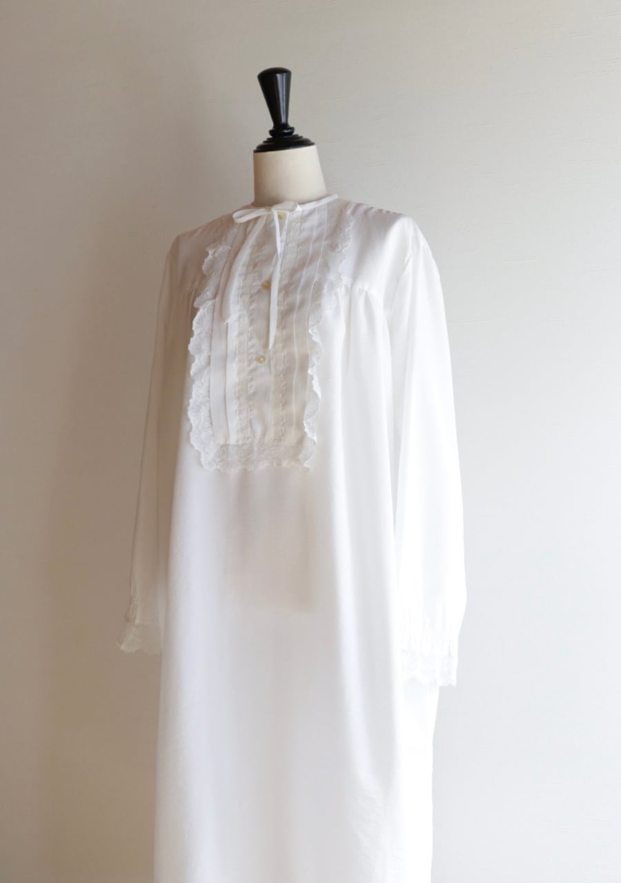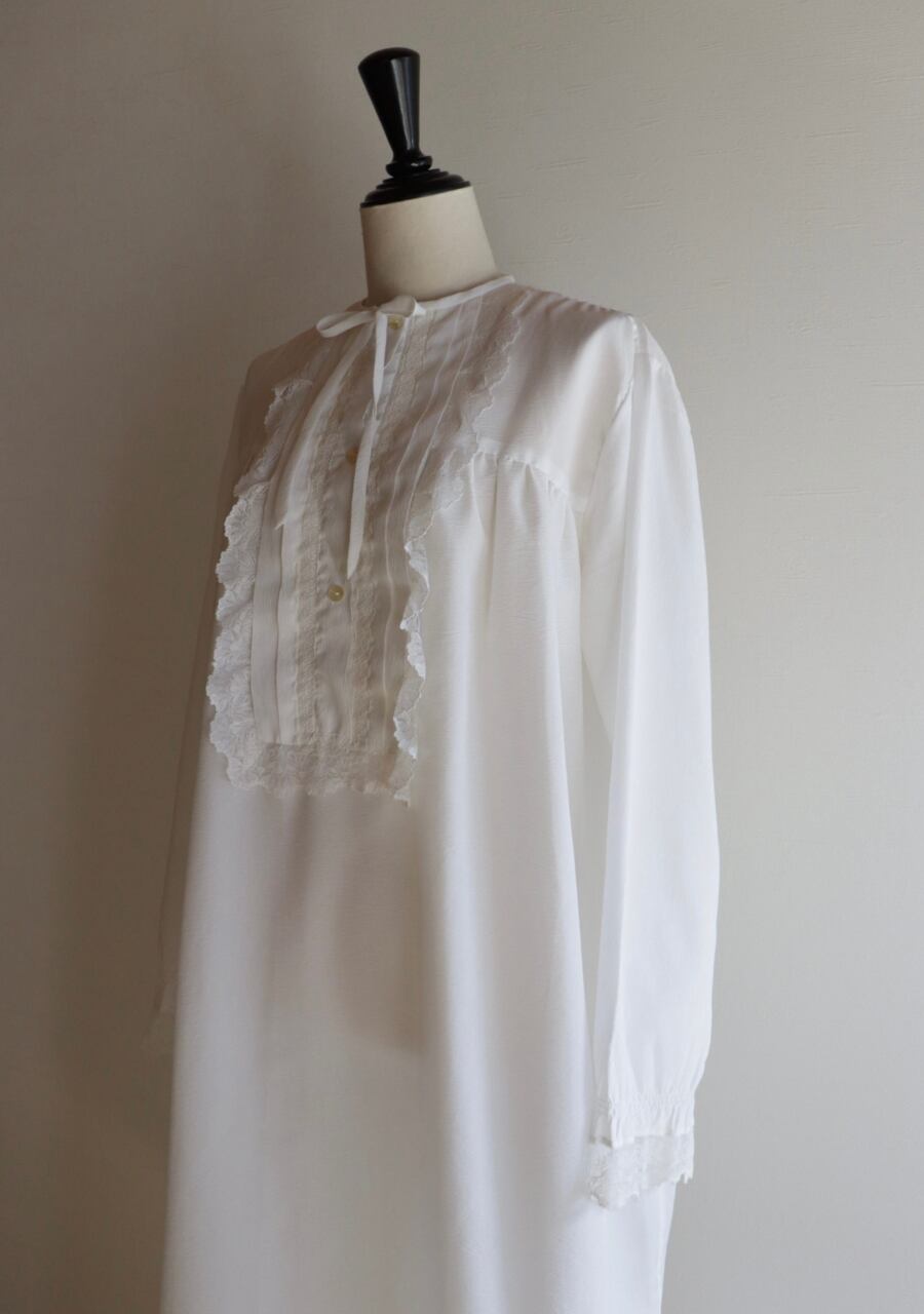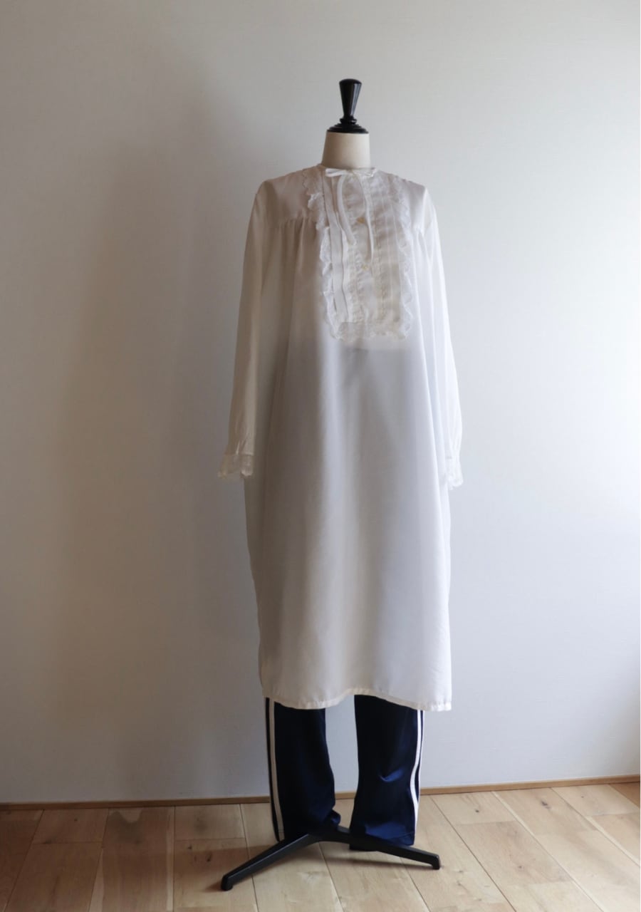 薄手の生地でやや透け感のあるドレス。胸元のリボンとレースがポイントでとてもガーリーで可愛いアイテム。袖にもレースでとても女性いらしい印象。軽く爽やかなでゆったりとした着心地。レイヤードしても良し。これからの季節にも活躍してくれるアイテム。