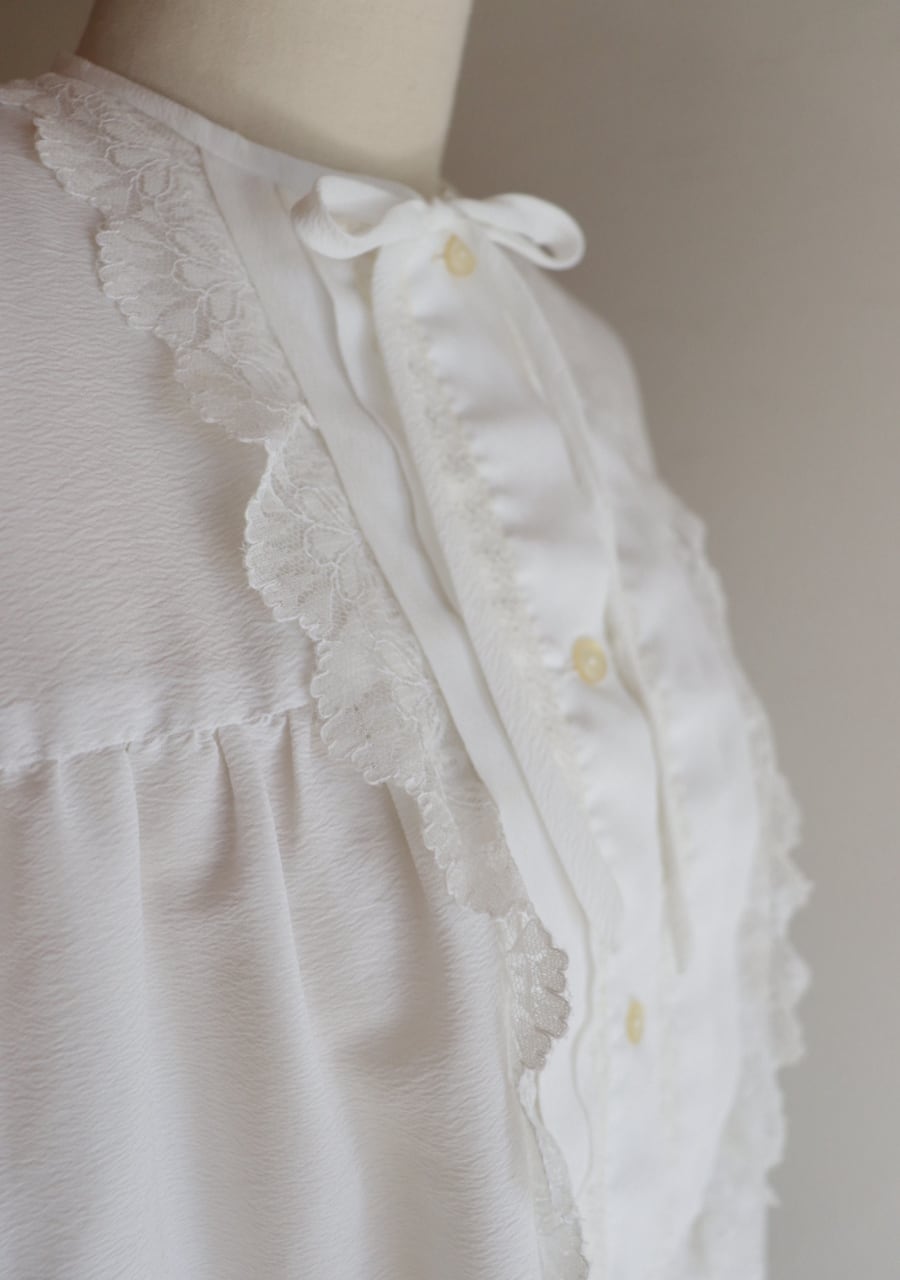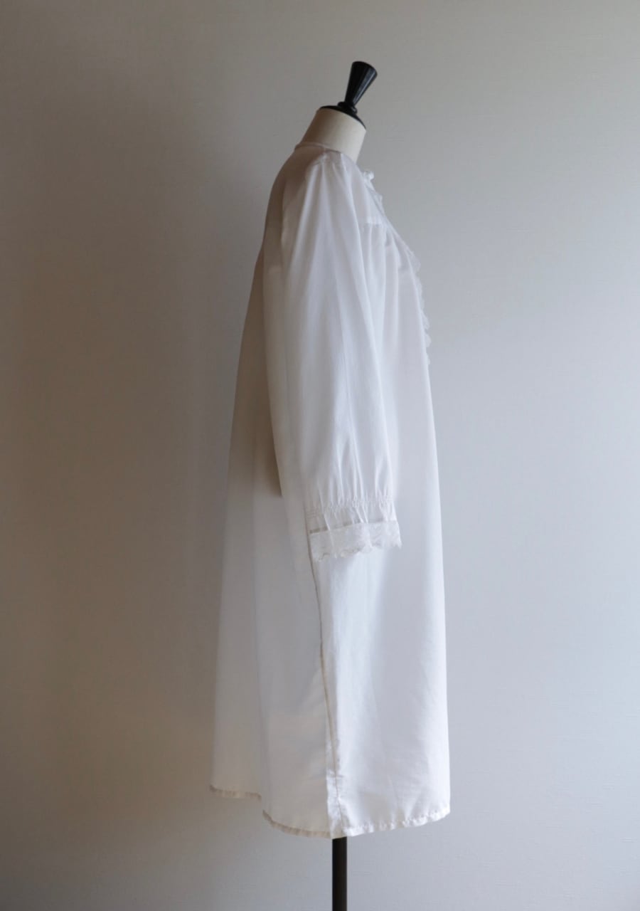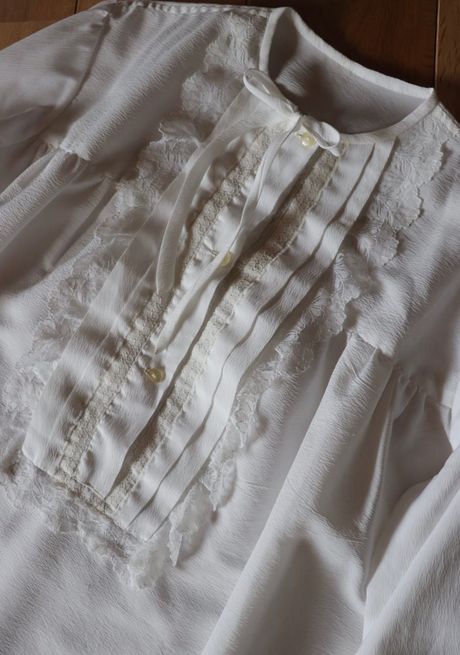 薄手の生地でやや透け感のあるドレス。胸元のリボンとレースがポイントでとてもガーリーで可愛いアイテム。袖にもレースでとても女性いらしい印象。軽く爽やかなでゆったりとした着心地。レイヤードしても良し。これからの季節にも活躍してくれるアイテム。