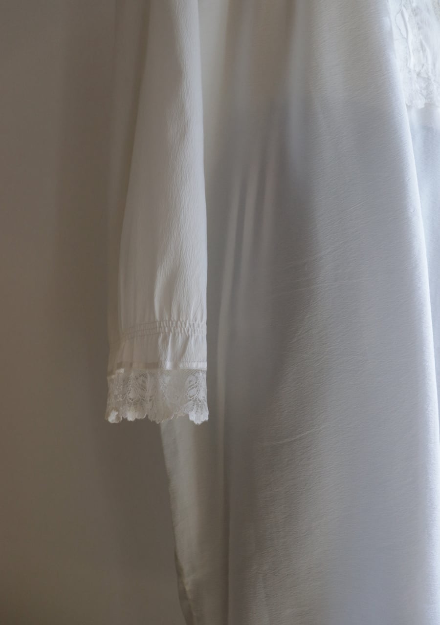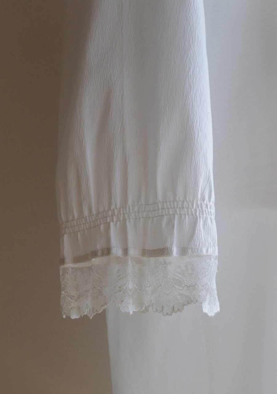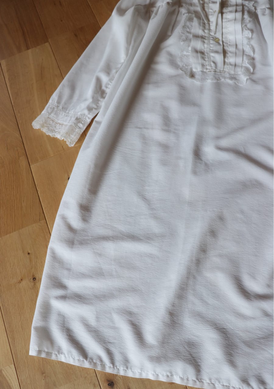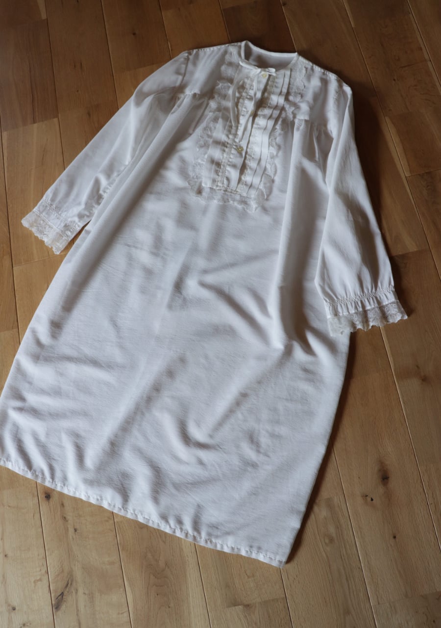 薄手の生地でやや透け感のあるドレス。胸元のリボンとレースがポイントでとてもガーリーで可愛いアイテム。袖にもレースでとても女性いらしい印象。軽く爽やかなでゆったりとした着心地。レイヤードしても良し。これからの季節にも活躍してくれるアイテム。