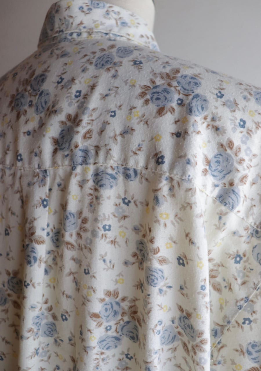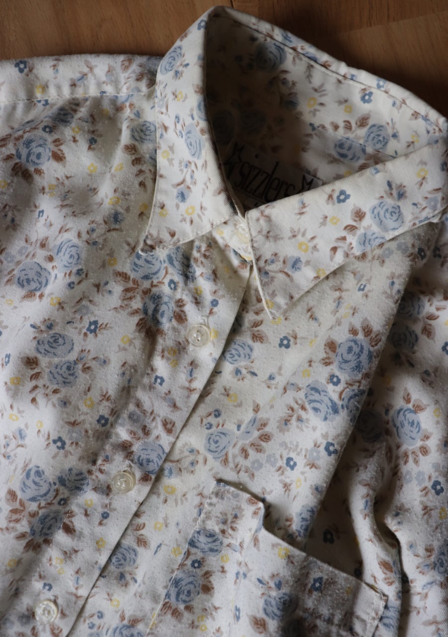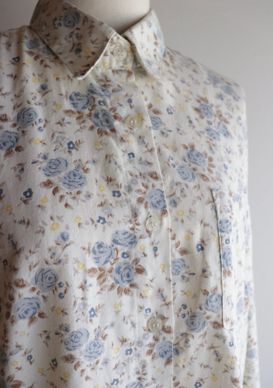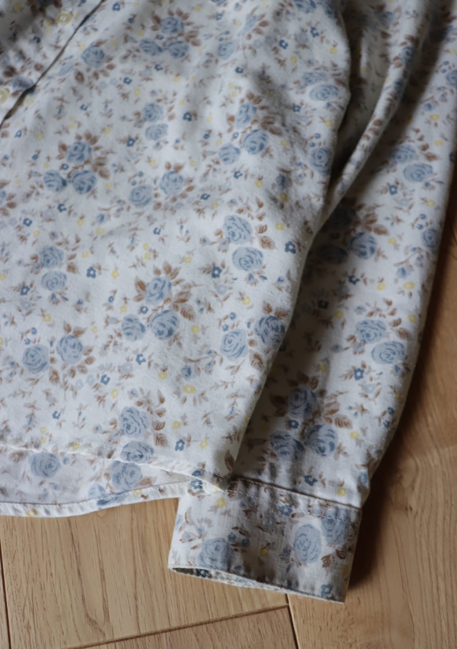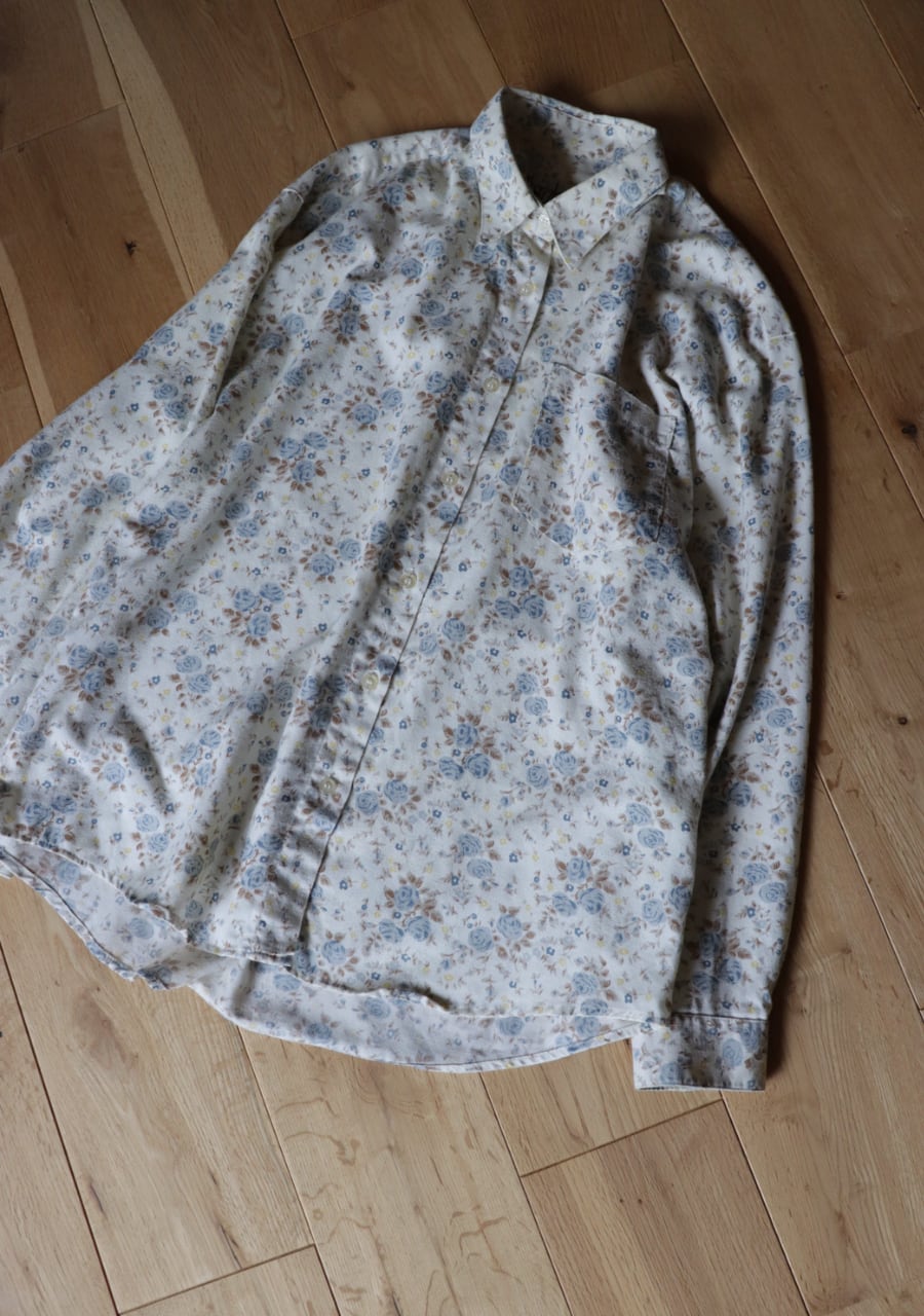 柔らかく薄手の生地で透け感は無し。爽やかな印象のブルーの花柄が涼し気なシャツ。これからの季節に大活躍していただけます。使用感がありますが古着ならではの雰囲気ある一着。