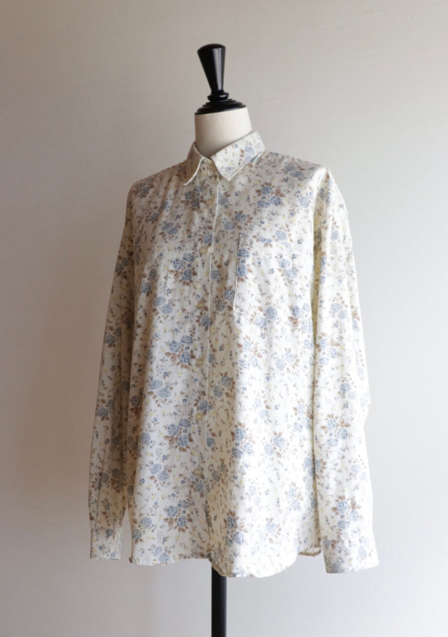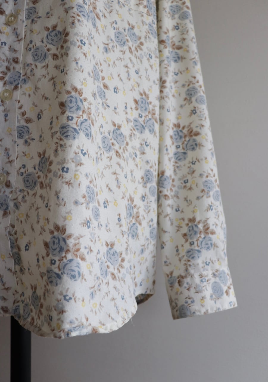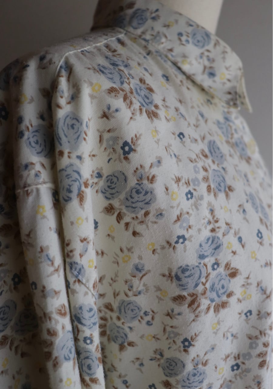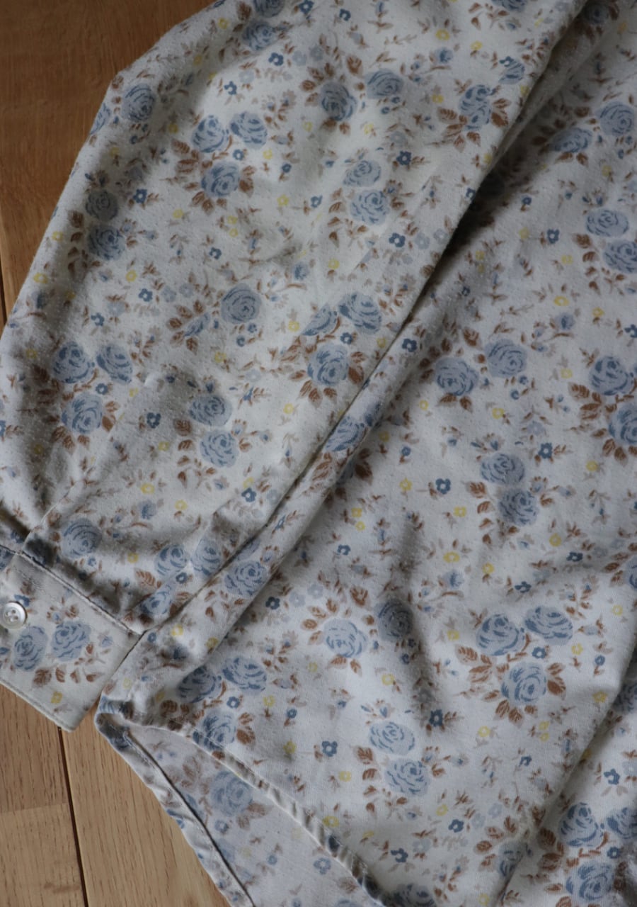 柔らかく薄手の生地で透け感は無し。爽やかな印象のブルーの花柄が涼し気なシャツ。これからの季節に大活躍していただけます。使用感がありますが古着ならではの雰囲気ある一着。