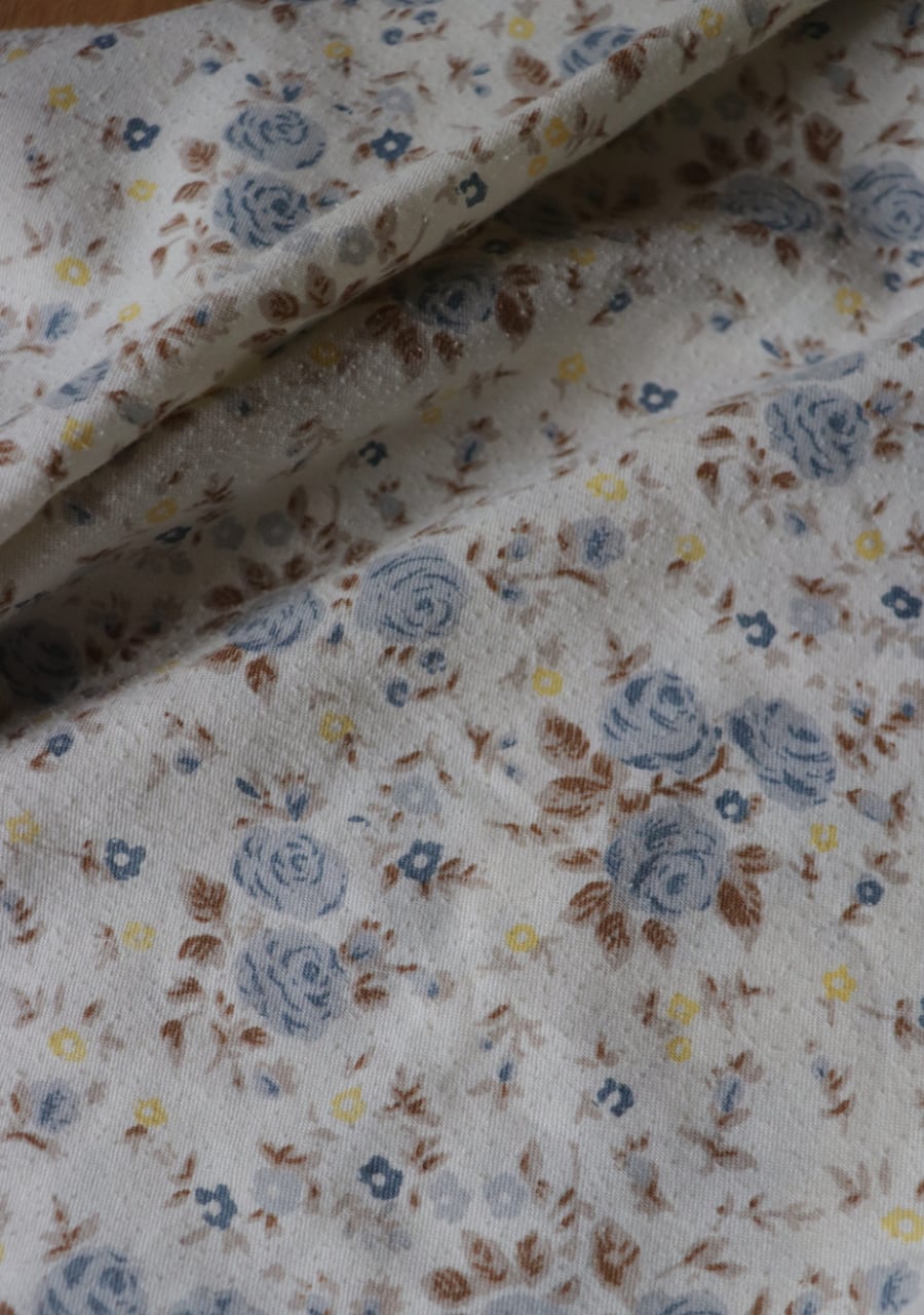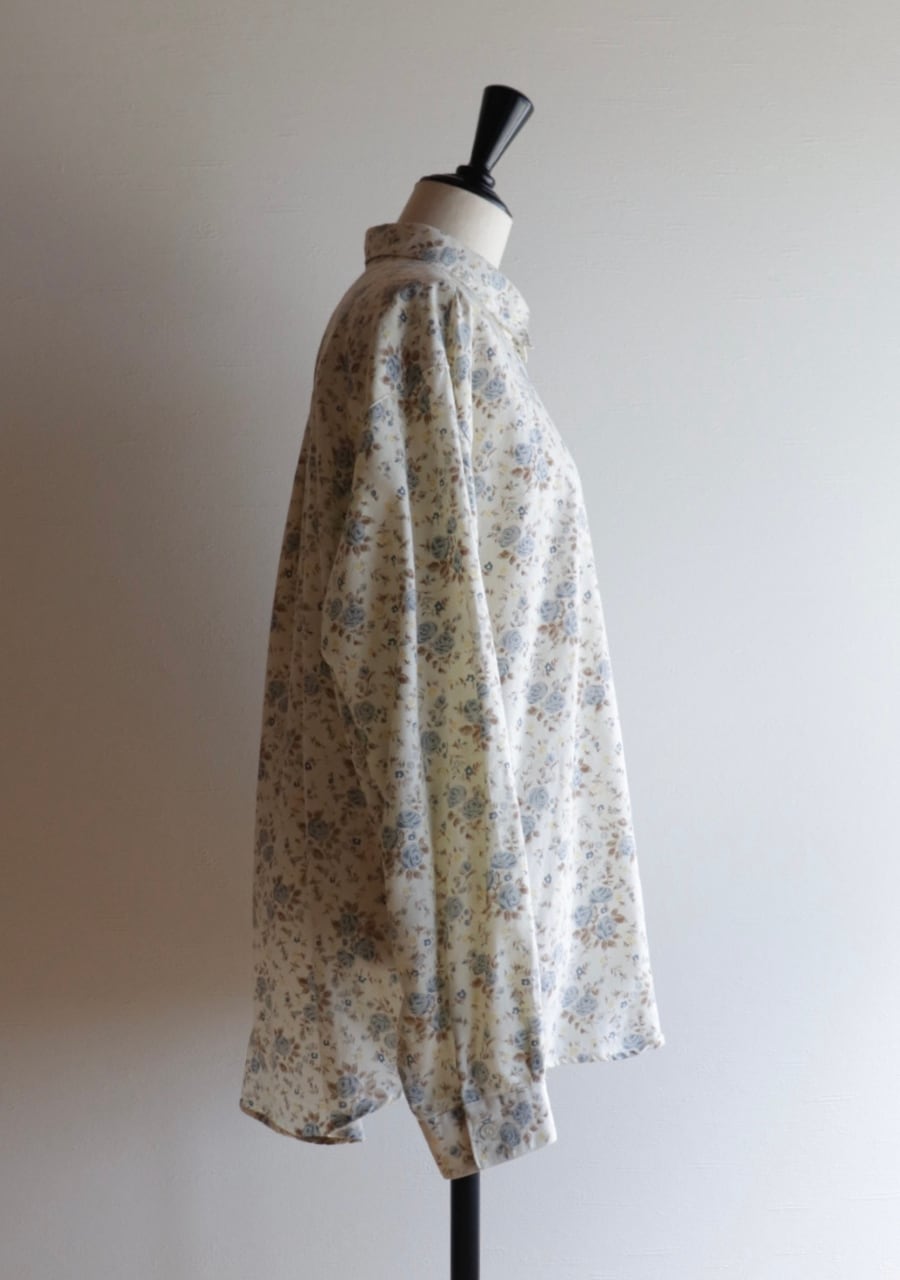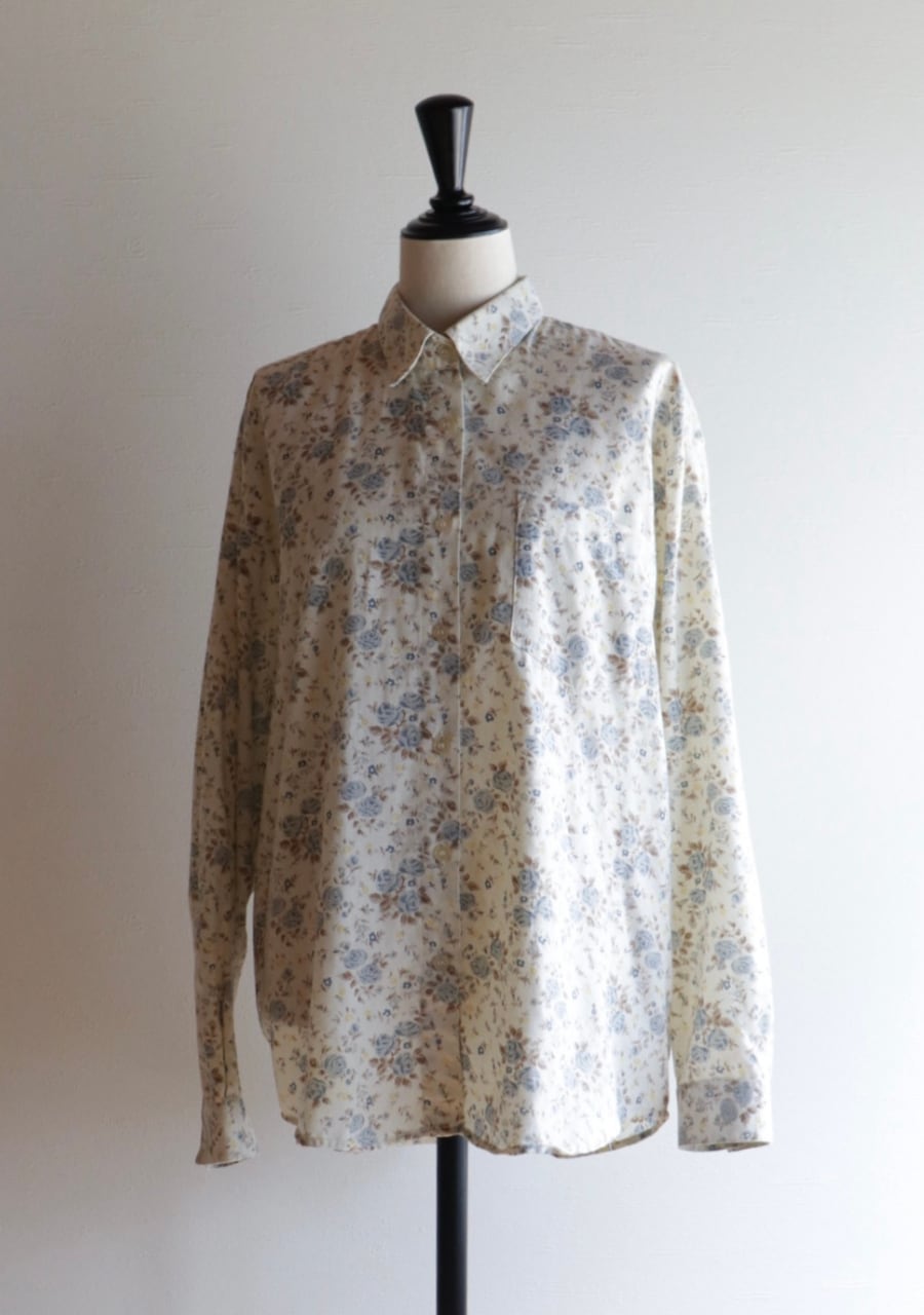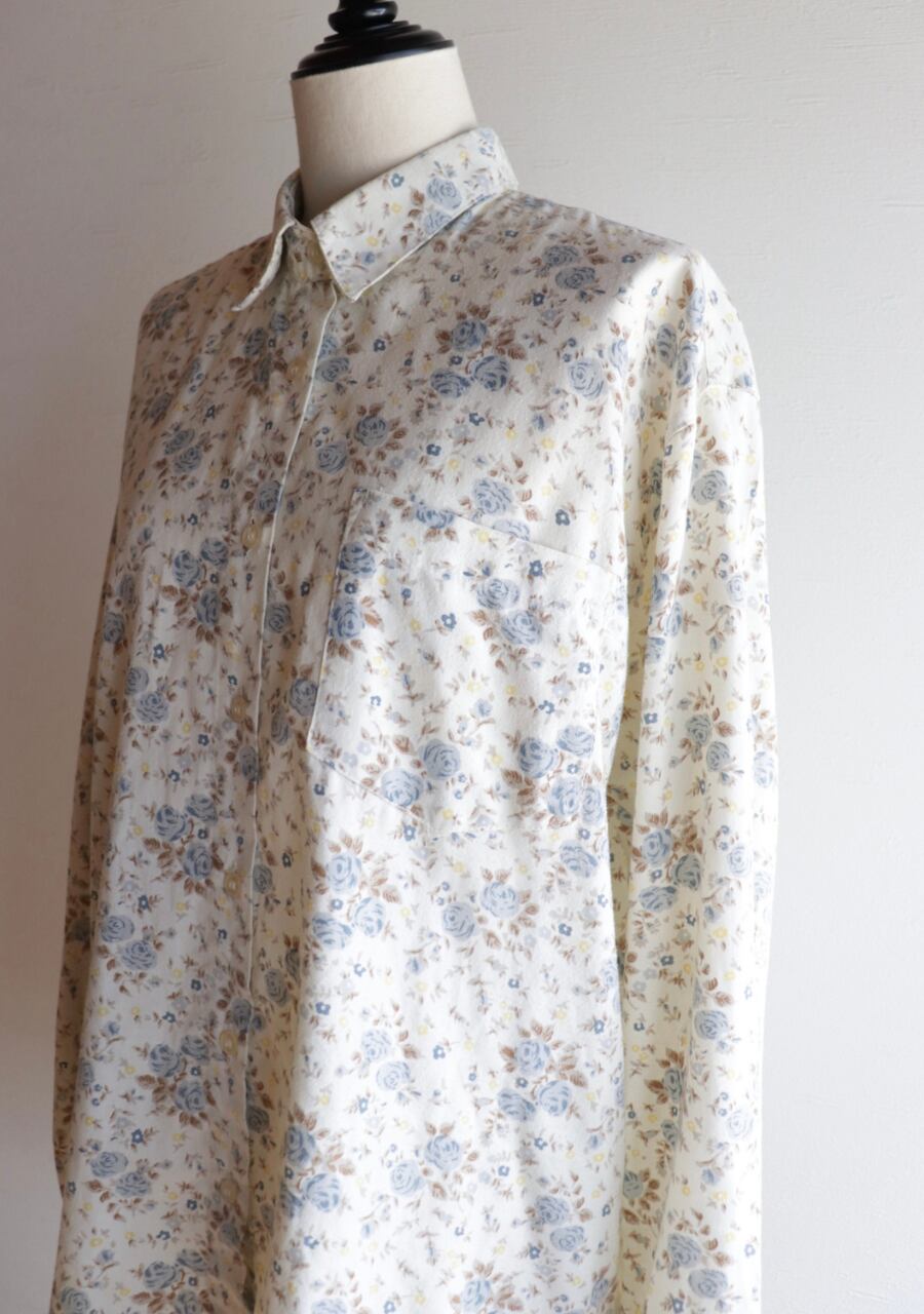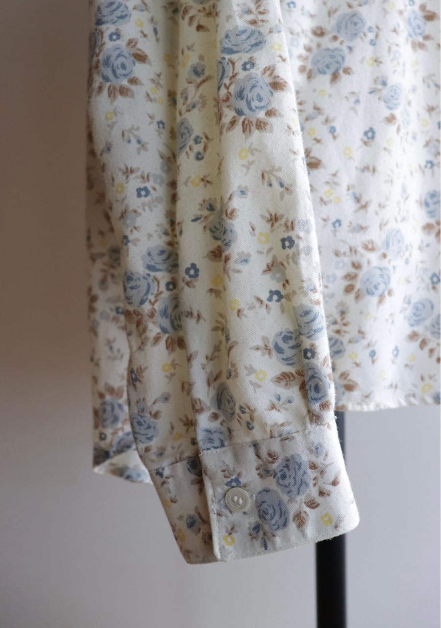 柔らかく薄手の生地で透け感は無し。爽やかな印象のブルーの花柄が涼し気なシャツ。これからの季節に大活躍していただけます。使用感がありますが古着ならではの雰囲気ある一着。