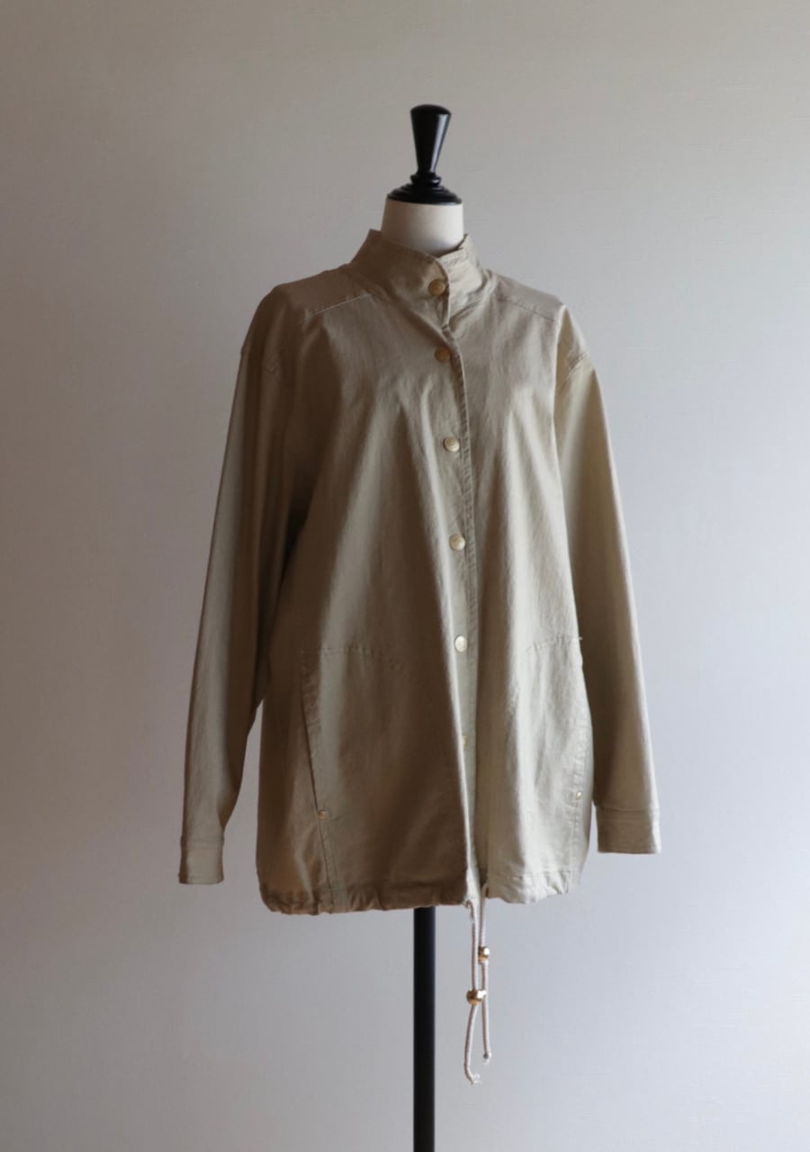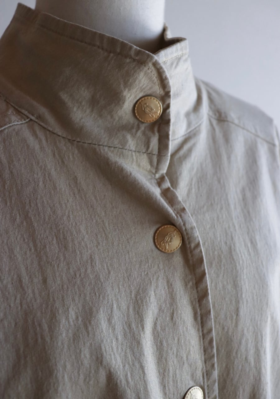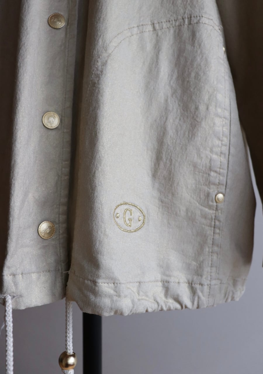 やや伸縮性がありベージュベースの生地にゴールドの糸で織られた生地は上品で女性らしく華やかなアウタージャケット。ぎらつきすぎず生地の表面加工も施された味わい深く素敵な生地。しわになりにくいのも嬉しく軽くてこの季節の良い一着。ゴールドのボタンもポイントでかなり素敵です。シルエットも良く大変おしゃれ。