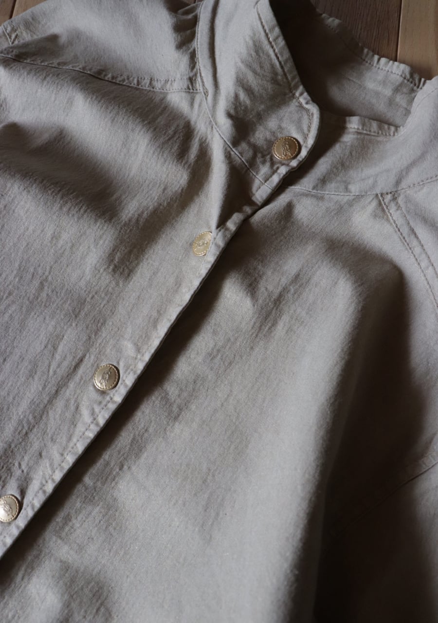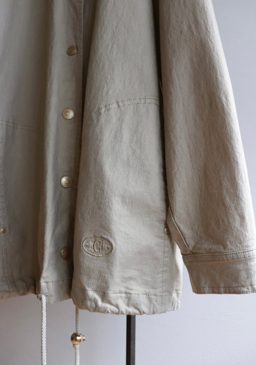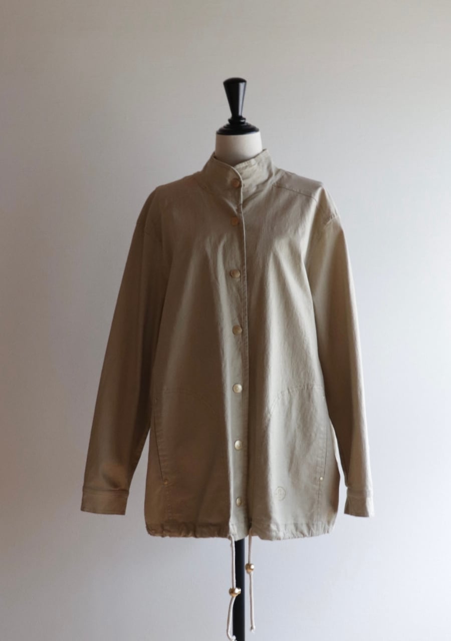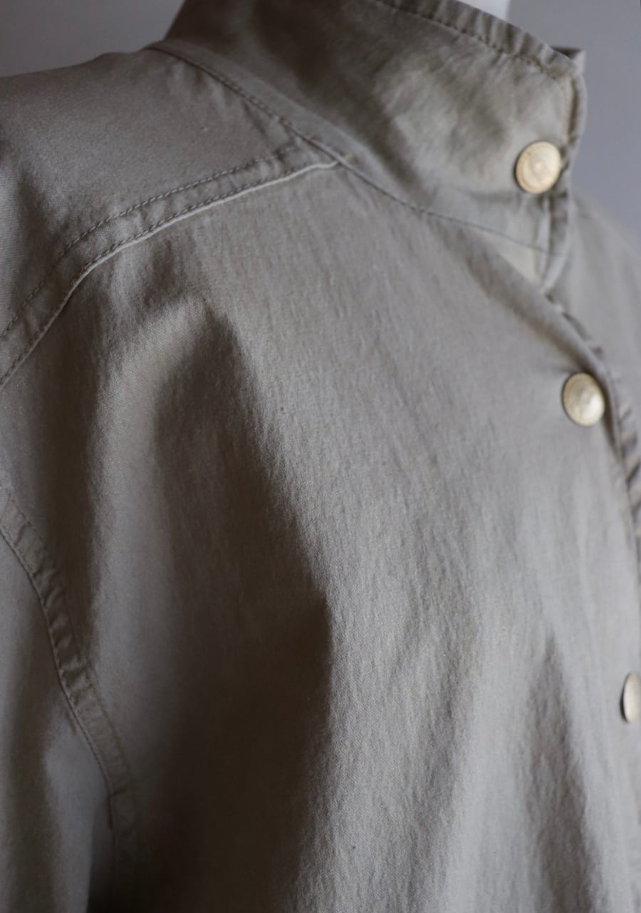 やや伸縮性がありベージュベースの生地にゴールドの糸で織られた生地は上品で女性らしく華やかなアウタージャケット。ぎらつきすぎず生地の表面加工も施された味わい深く素敵な生地。しわになりにくいのも嬉しく軽くてこの季節の良い一着。ゴールドのボタンもポイントでかなり素敵です。シルエットも良く大変おしゃれ。