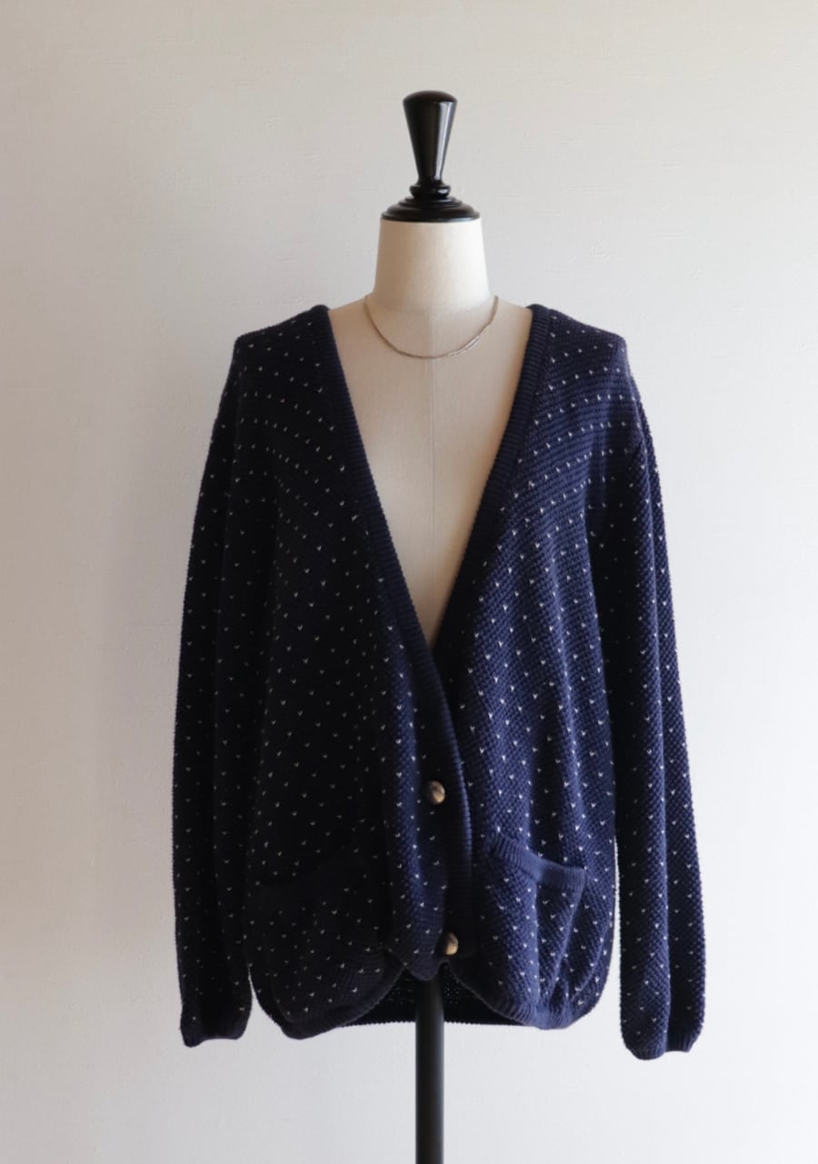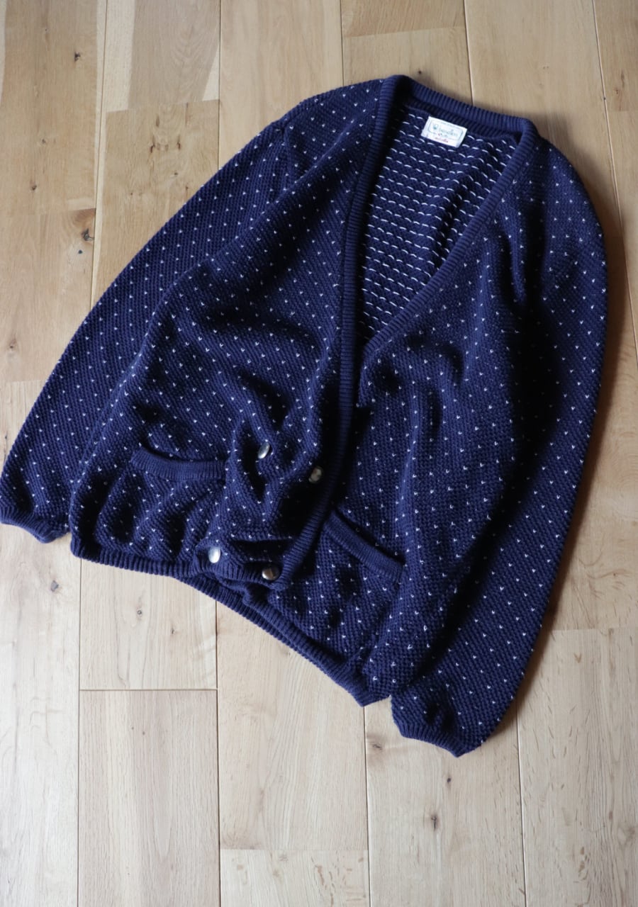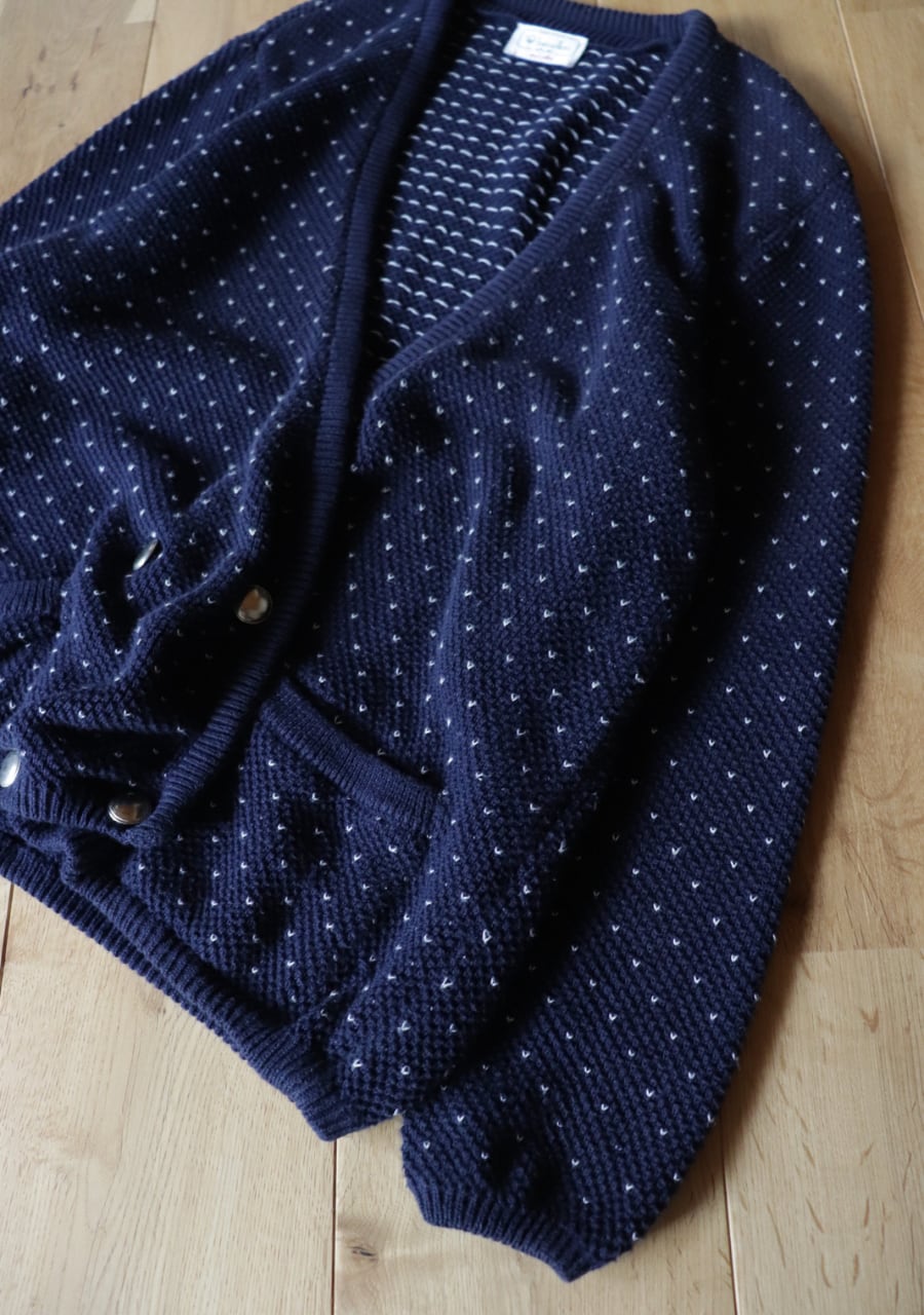 柔らかく伸縮性があり肌触りの良い生地。白のステッチが小さなハートのように見えて爽やかで可愛いアイテム。季節の変わり目に丁度良いカーディガンです。フロントの程よい開き具合と生地の柔らかさで抜け感あるスタイリングに。フロントのダブルのメタルボタンも可愛い。癒しのネービーカーディガンで活躍してくれるアイテム。