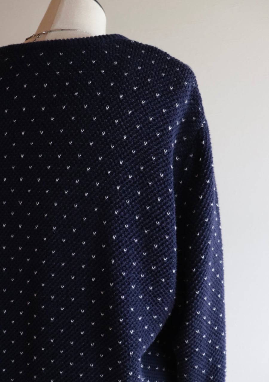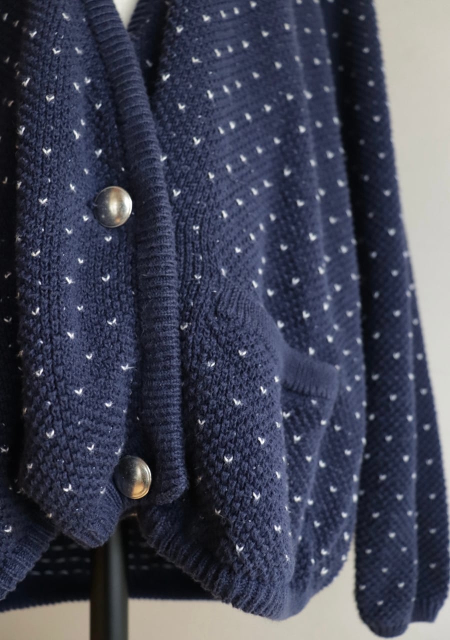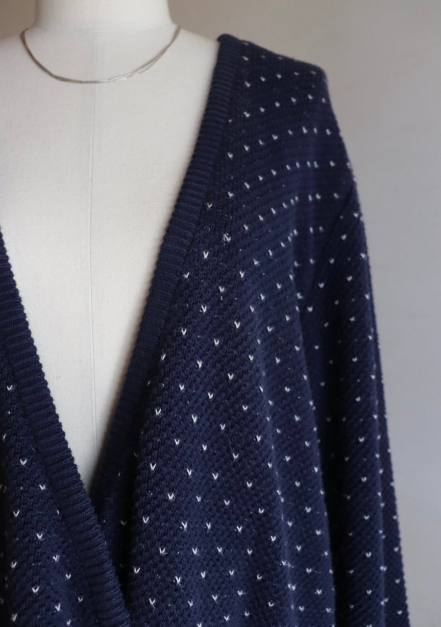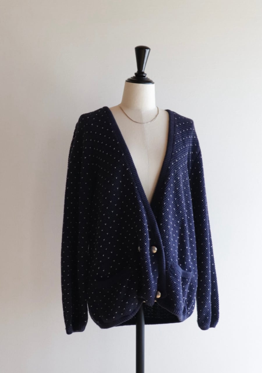 柔らかく伸縮性があり肌触りの良い生地。白のステッチが小さなハートのように見えて爽やかで可愛いアイテム。季節の変わり目に丁度良いカーディガンです。フロントの程よい開き具合と生地の柔らかさで抜け感あるスタイリングに。フロントのダブルのメタルボタンも可愛い。癒しのネービーカーディガンで活躍してくれるアイテム。