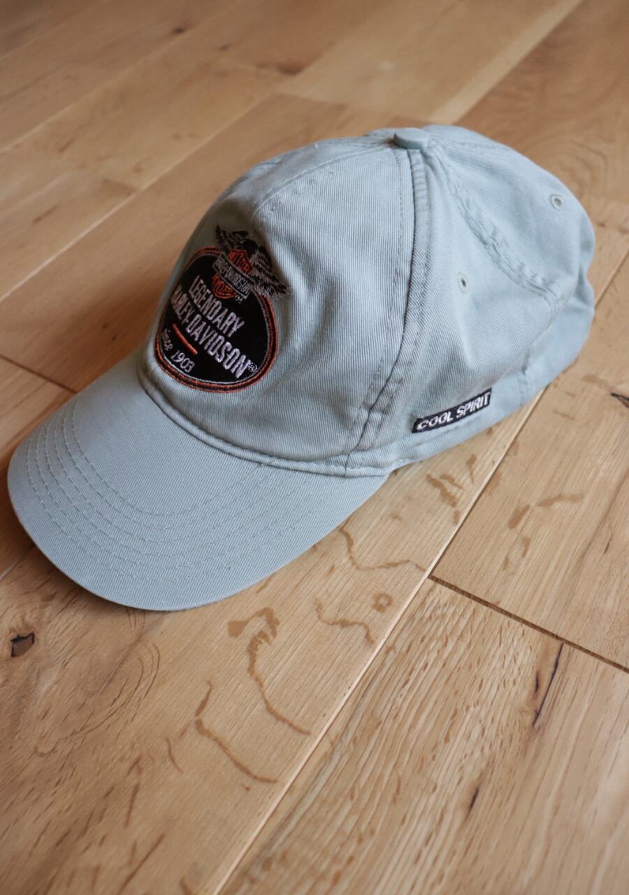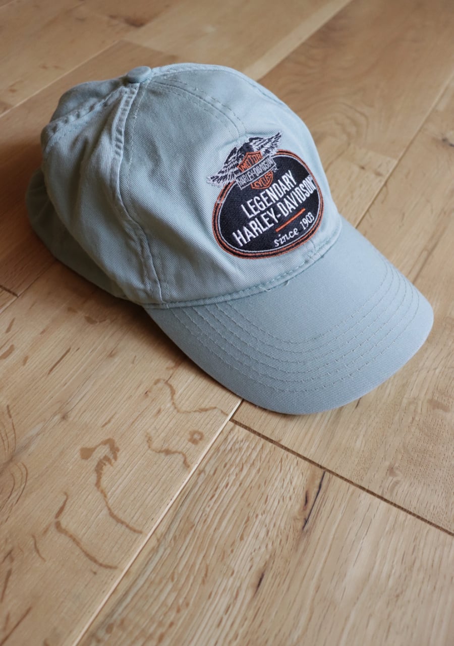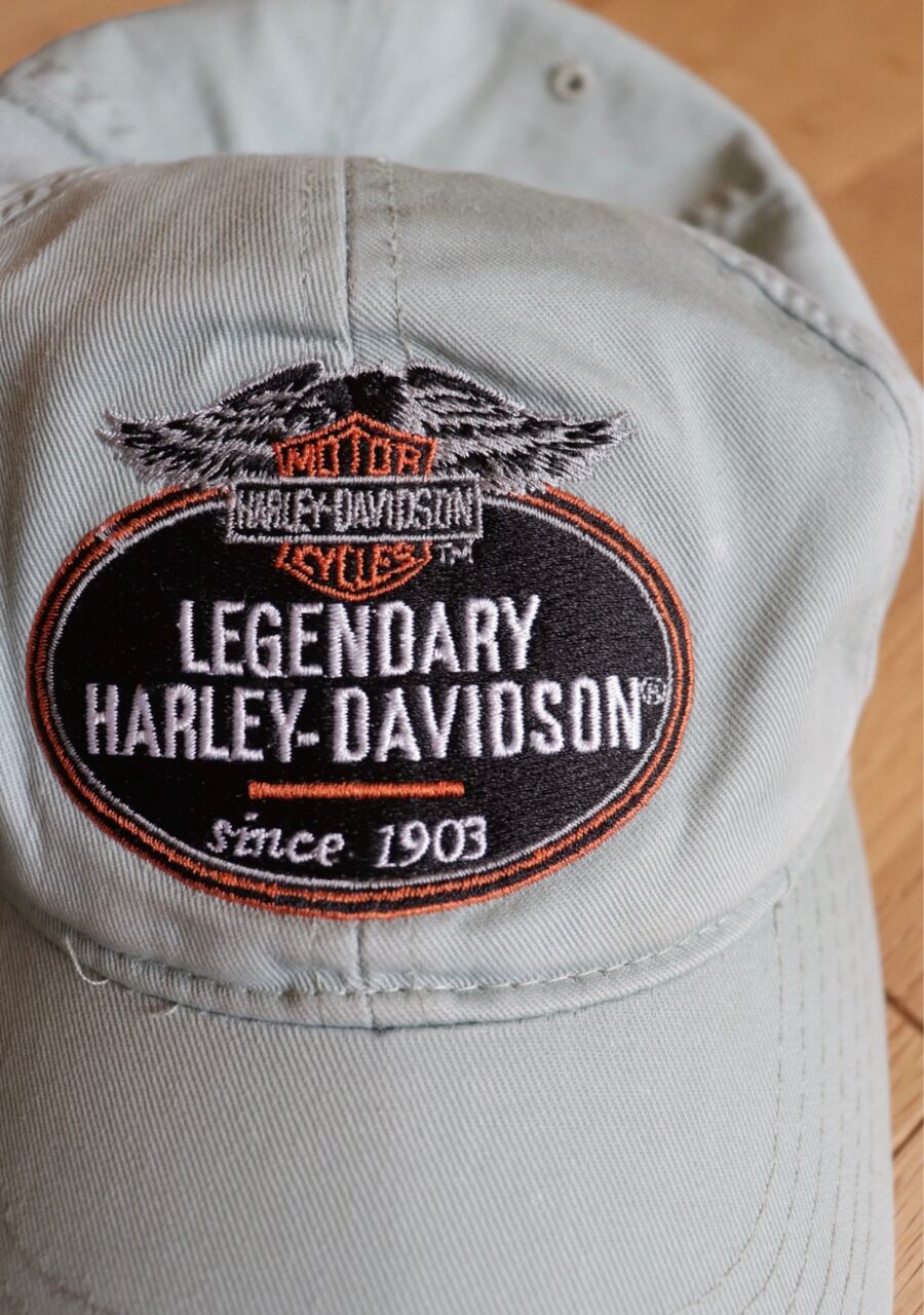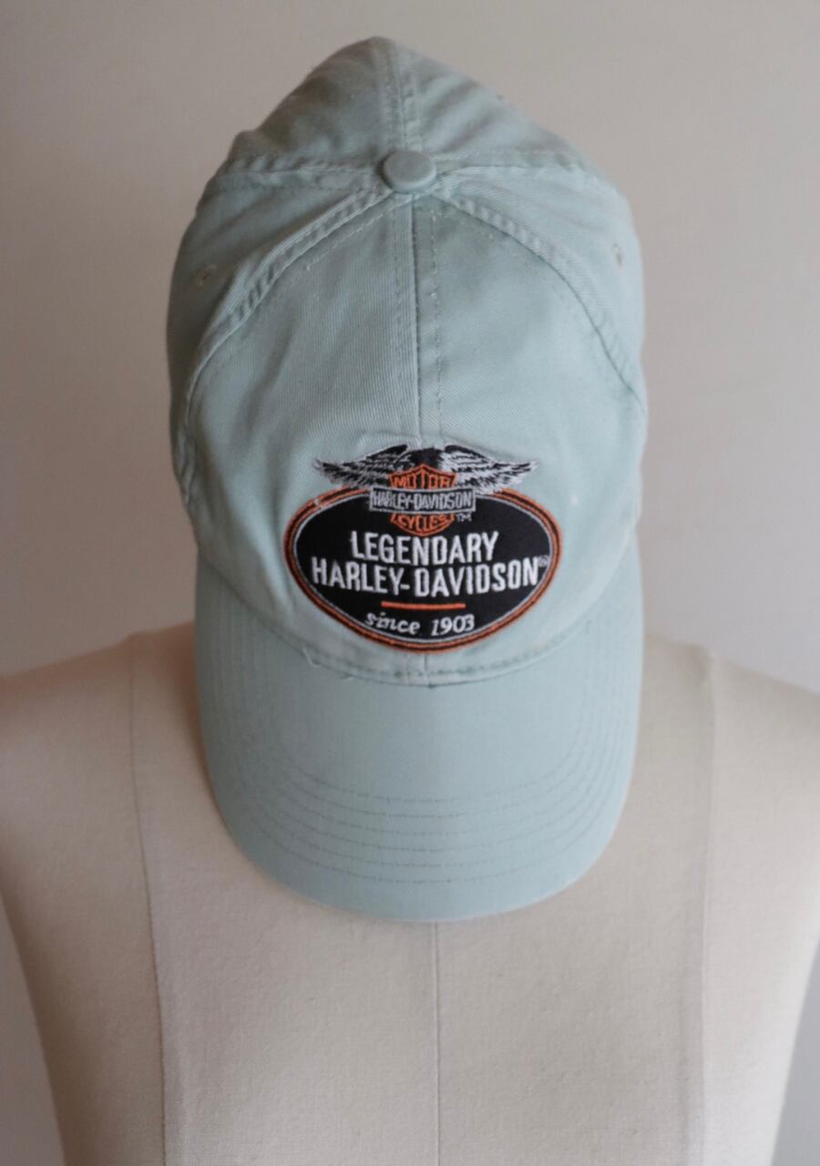 淡いミントカラーが爽やかな印象。薄手の生地もこれからの季節には嬉しい。ツバにダメージがありますがむしろ良い雰囲気に。ハーレダビットソンのカッコ良さを取り入れたおしゃれを楽しんでいただけるアイテム。