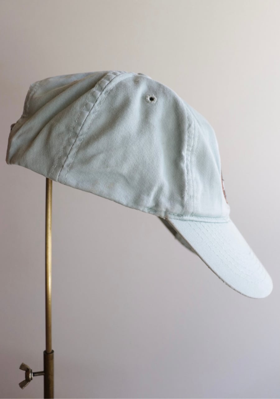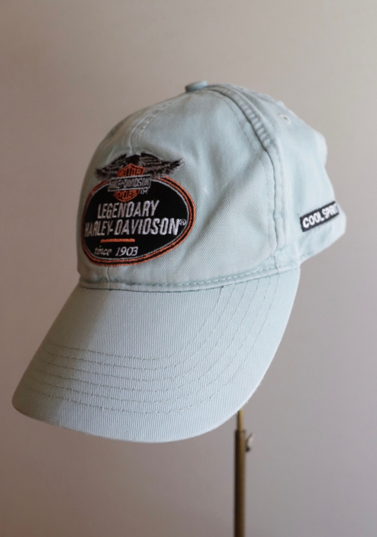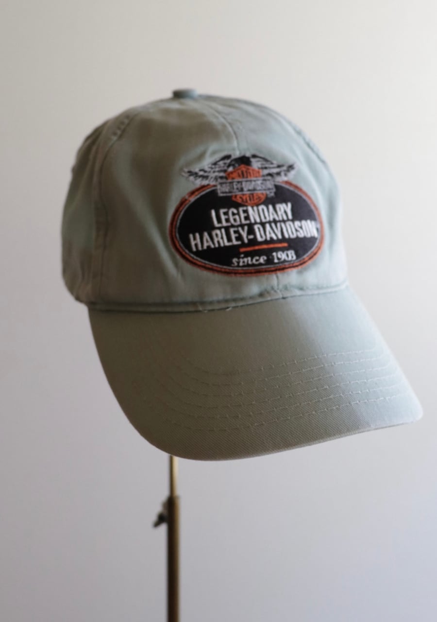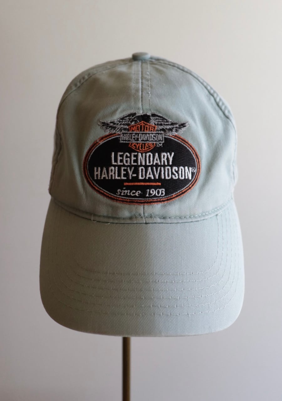 淡いミントカラーが爽やかな印象。薄手の生地もこれからの季節には嬉しい。ツバにダメージがありますがむしろ良い雰囲気に。ハーレダビットソンのカッコ良さを取り入れたおしゃれを楽しんでいただけるアイテム。