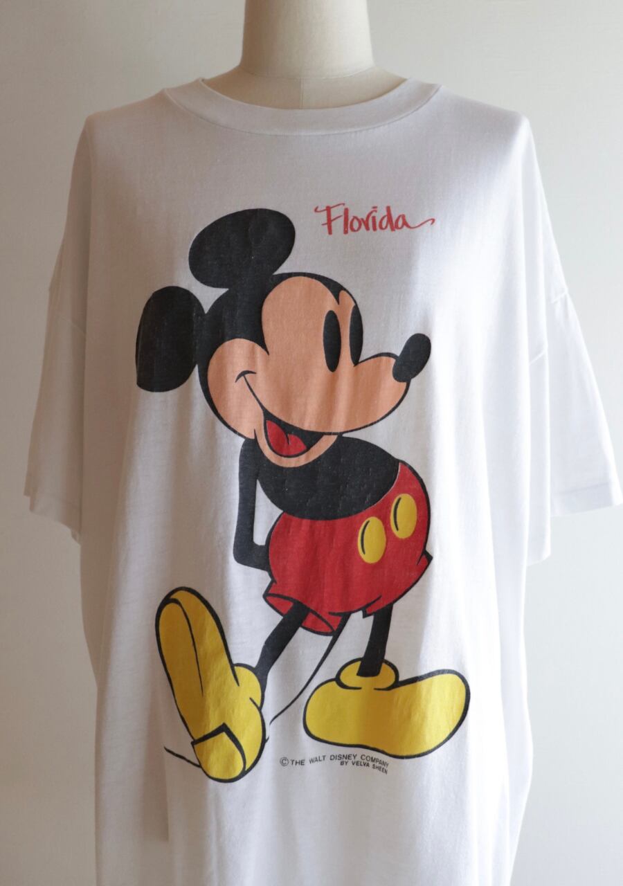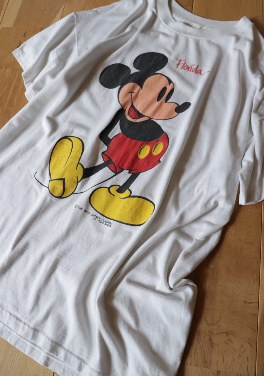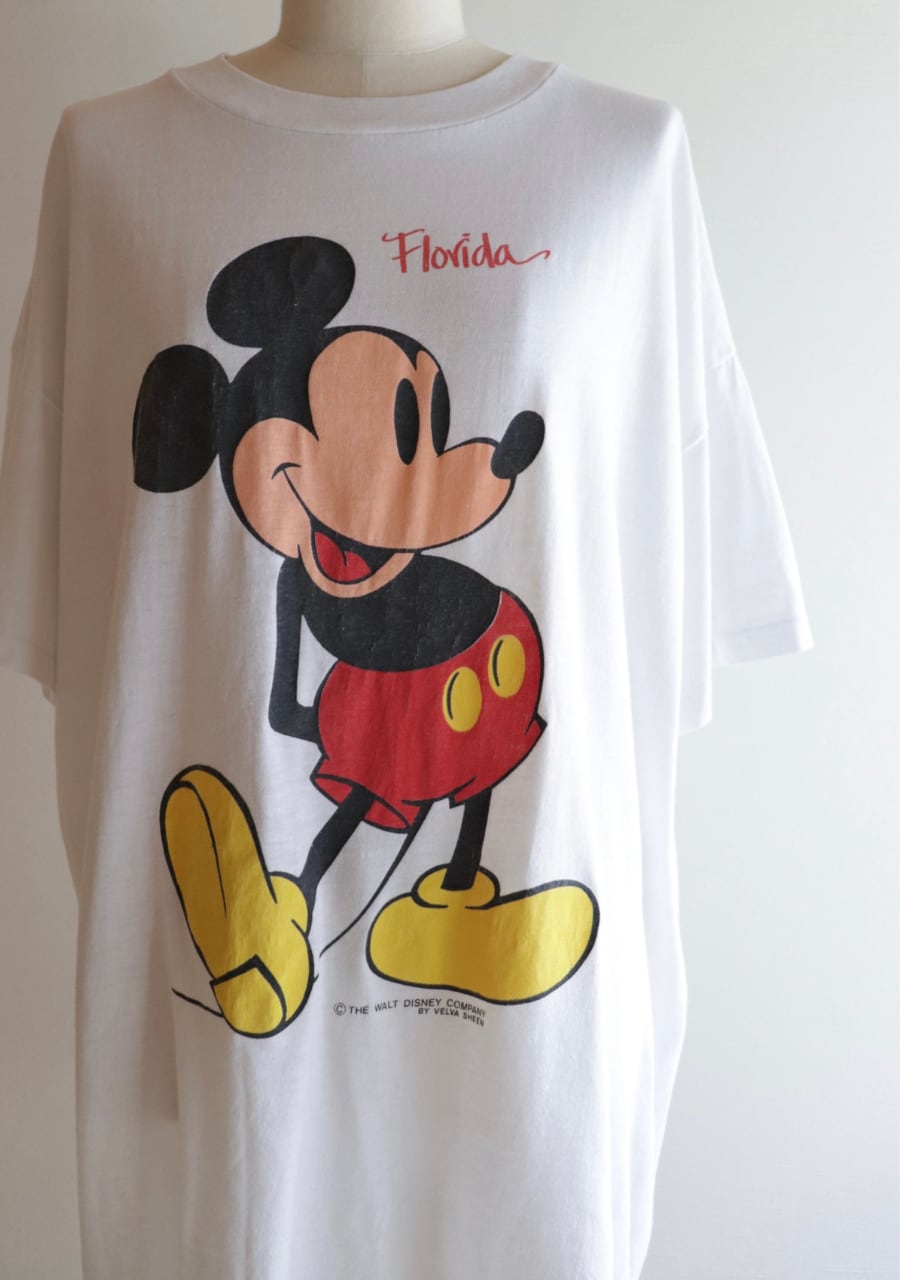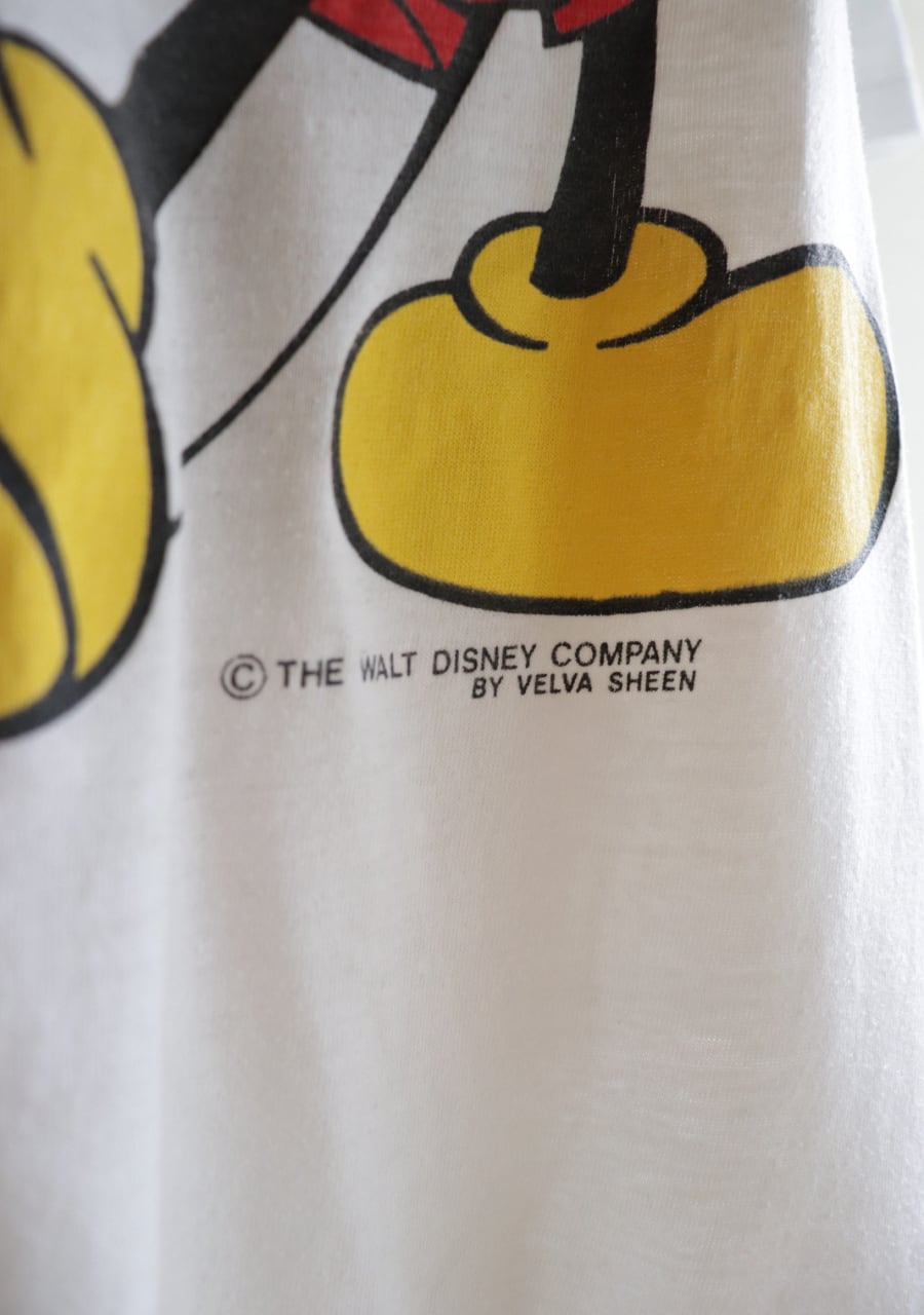 日に焼けたようなミッキーの顔の部分が染色されているスタンディングミッキー。観光用Tシャツとして人気のアイテムでVELVA SHEENのヴィンテージ。生地は古着ならではの柔らかく肌触りの良い味わいある生地。ダメージもなく大変良い状態です。