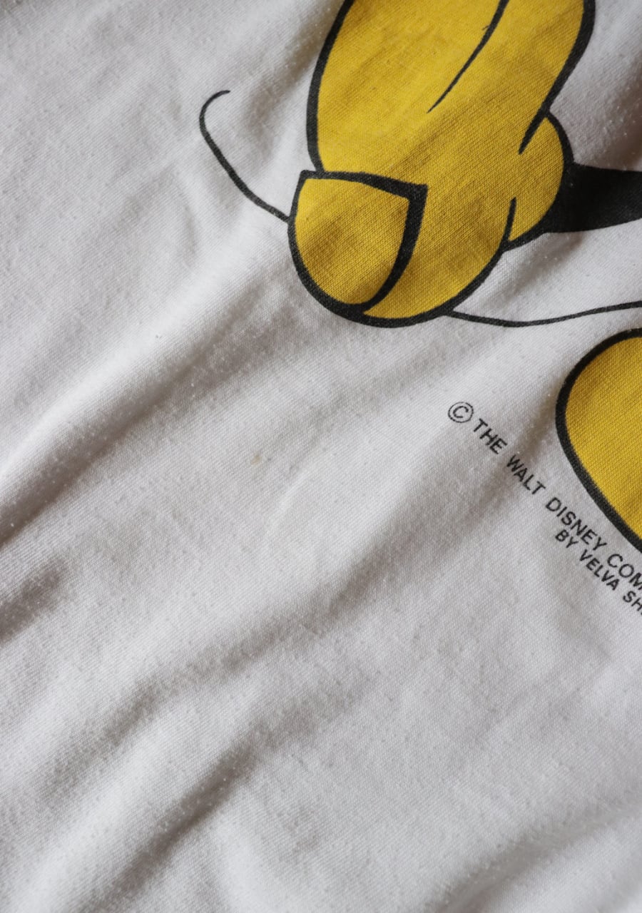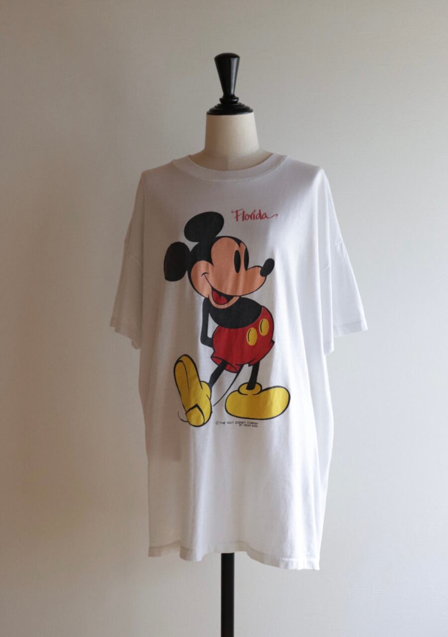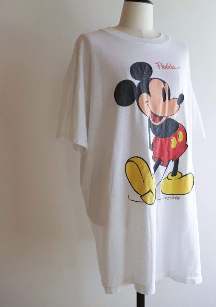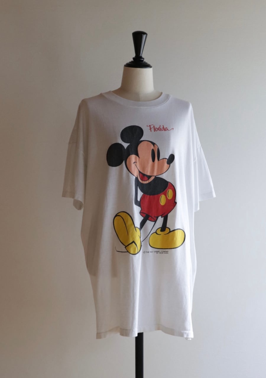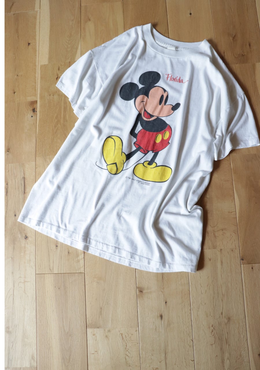 日に焼けたようなミッキーの顔の部分が染色されているスタンディングミッキー。観光用Tシャツとして人気のアイテムでVELVA SHEENのヴィンテージ。生地は古着ならではの柔らかく肌触りの良い味わいある生地。ダメージもなく大変良い状態です。