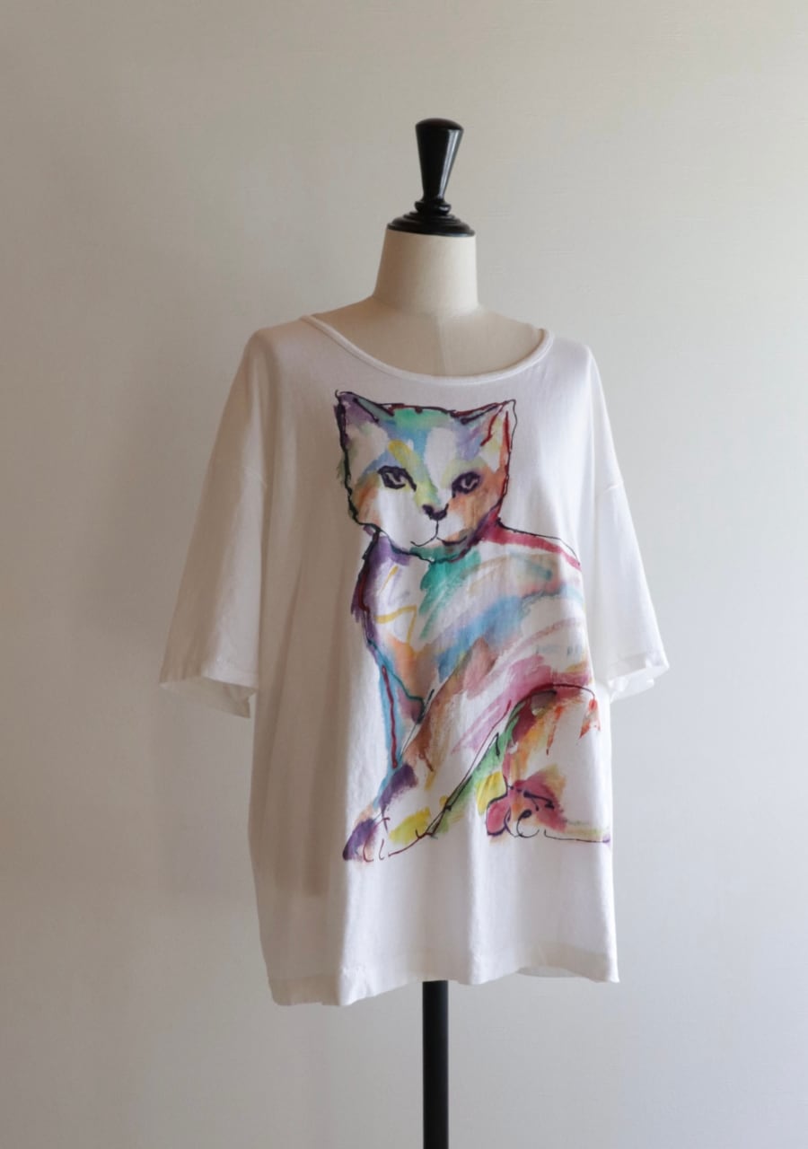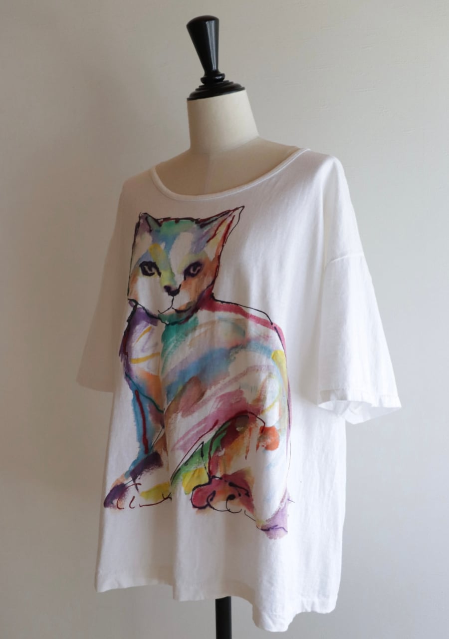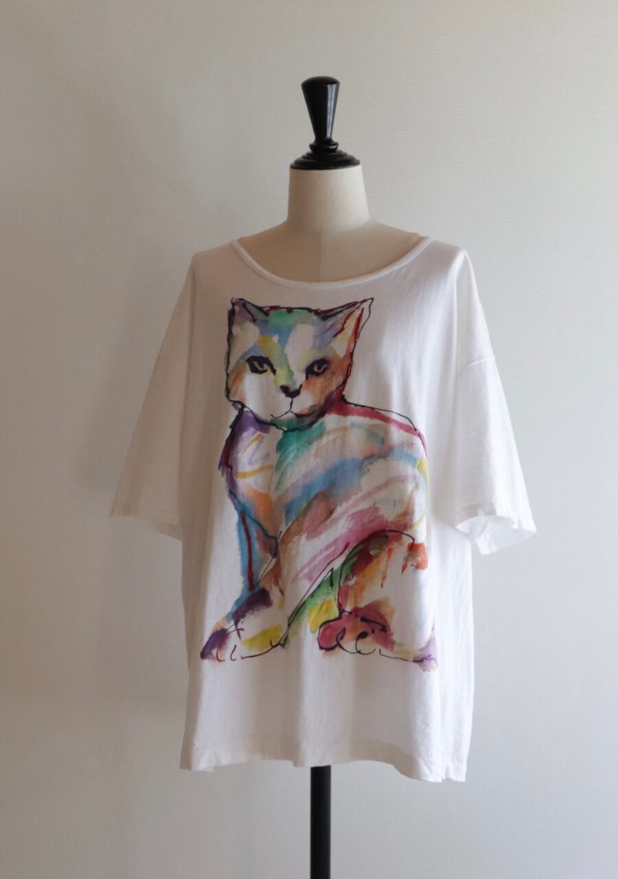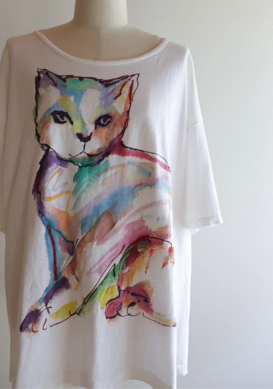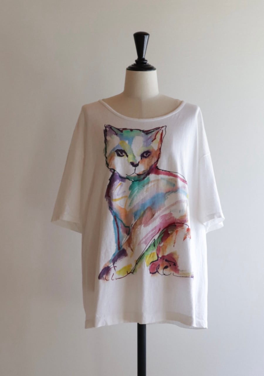 アーティステックな猫のプリントが可愛いTシャツ。サイズ感も良く女性らしく華やかな印象。さりげないバックのプリントも可愛い。コーディネートの主役になるアイテム。Tシャツなのに首元の細い幅でのラインが女性らしくカジュアル過ぎず、キレイ目合わせでカッコ良くも。これは大変おすすめ!