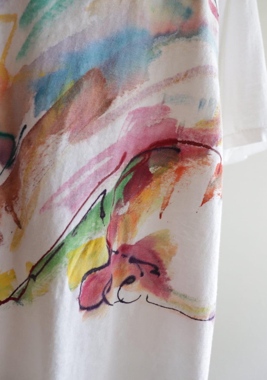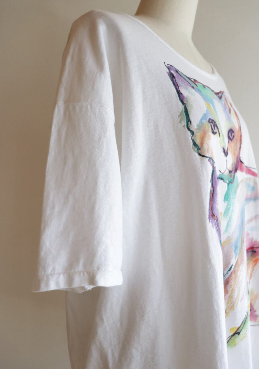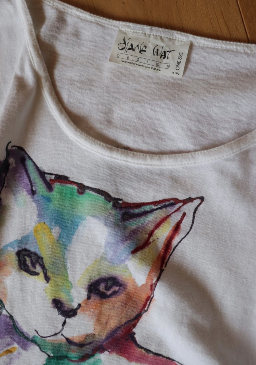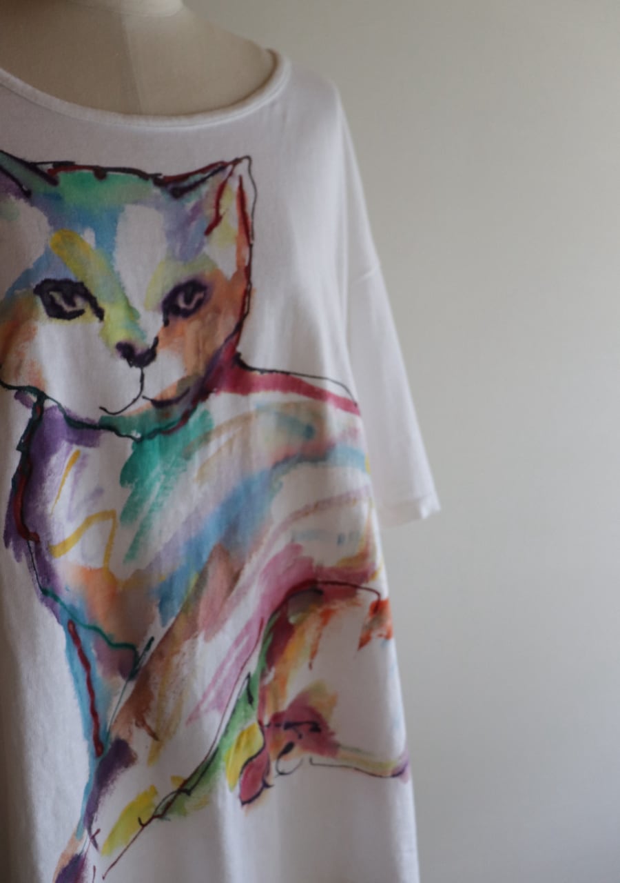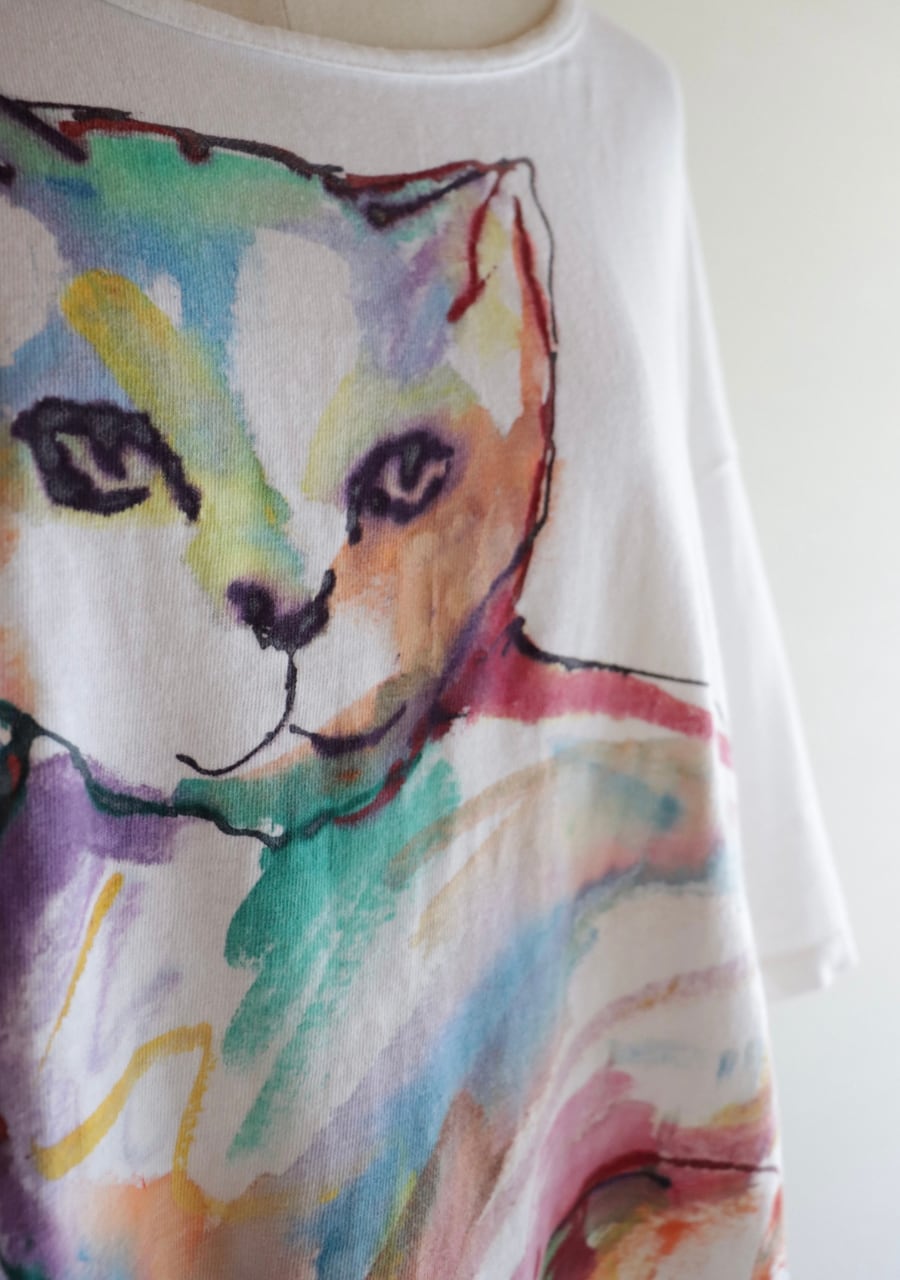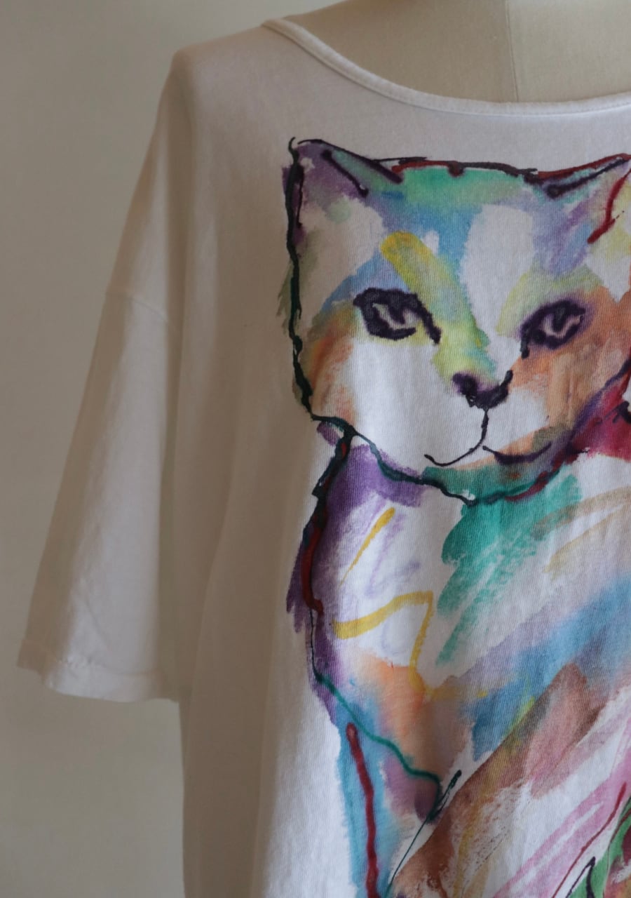 アーティステックな猫のプリントが可愛いTシャツ。サイズ感も良く女性らしく華やかな印象。さりげないバックのプリントも可愛い。コーディネートの主役になるアイテム。Tシャツなのに首元の細い幅でのラインが女性らしくカジュアル過ぎず、キレイ目合わせでカッコ良くも。これは大変おすすめ!