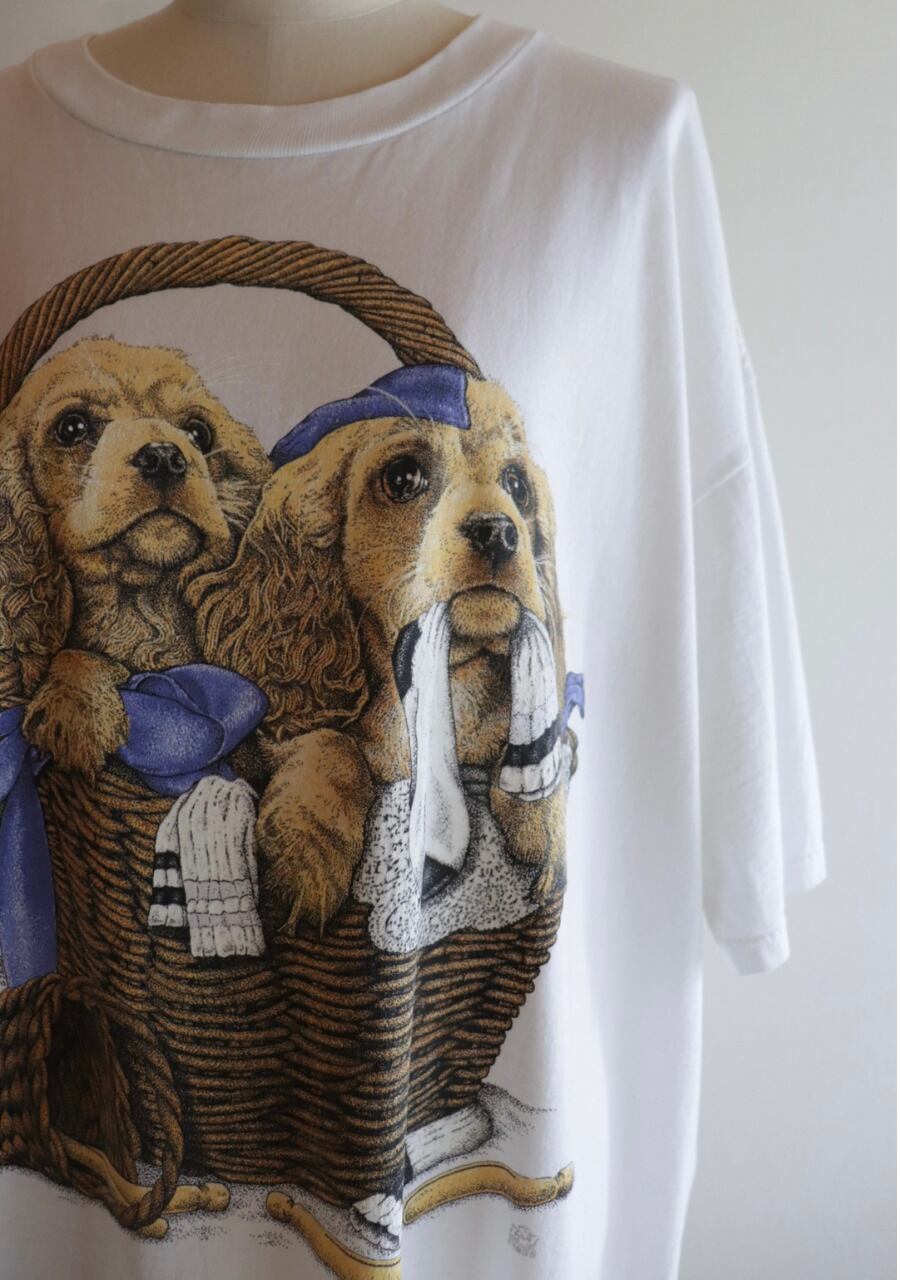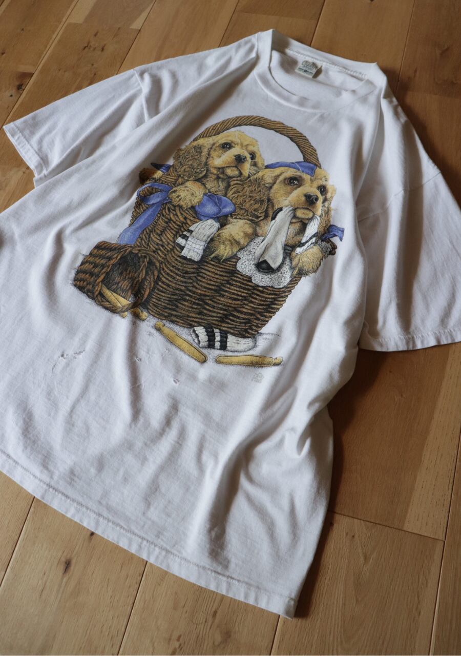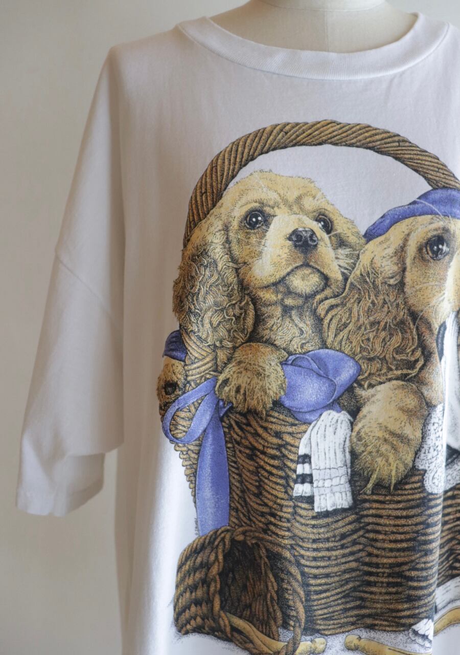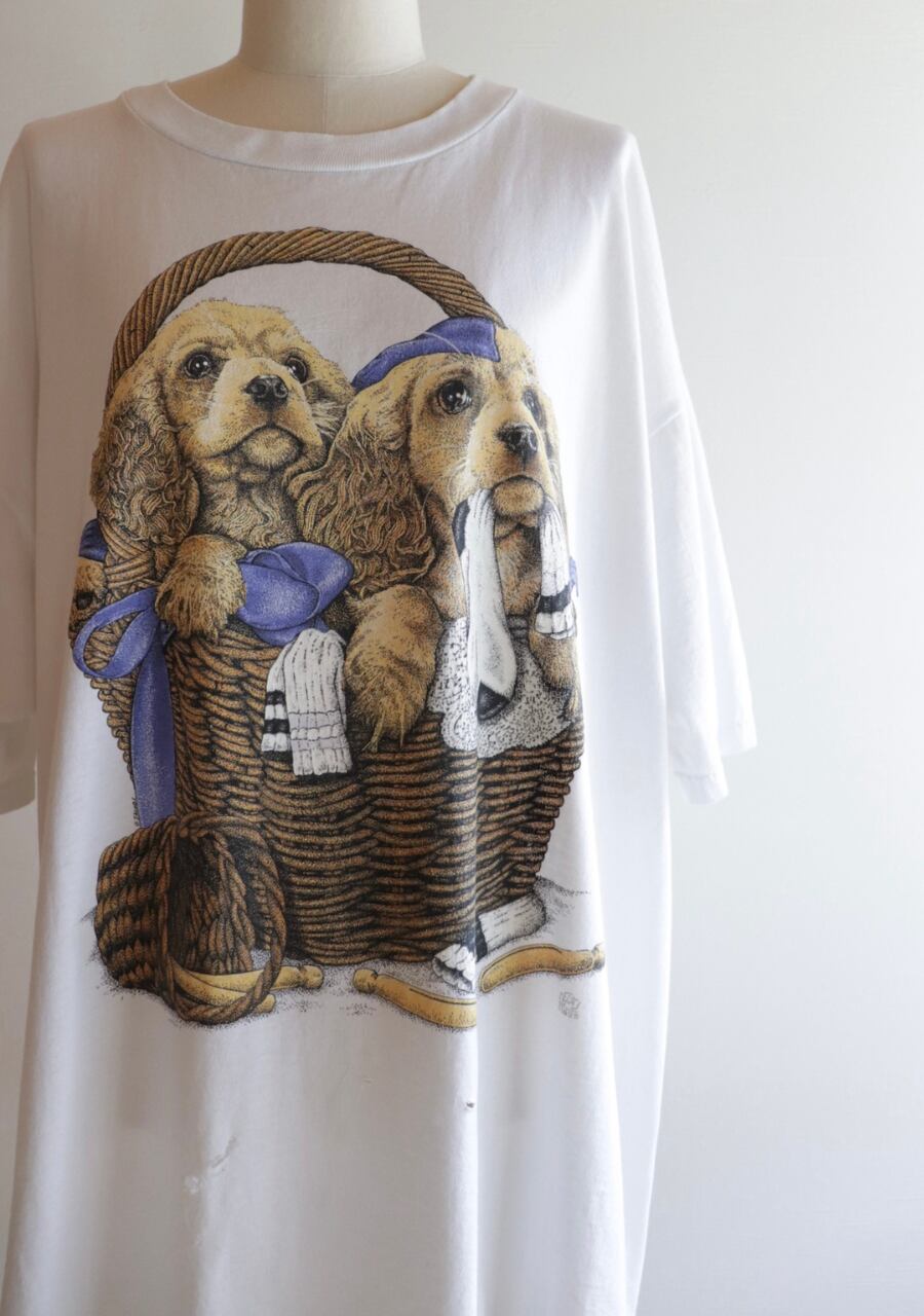 人気のあるドック柄。フロントにコッカー・スパニエルドックの大きなプリントが特徴で可愛い。ビックサイズが絶妙の首元の開き具合と肩の落ち、袖の長さと言い華奢で女性らしい首元で着用感がとても可愛い。抜け感さえあり抜群の雰囲気があります。キズも古着ならではの味わい。今からの季節にぴったりのおしゃれなTシャツです。