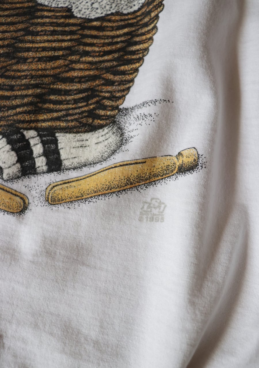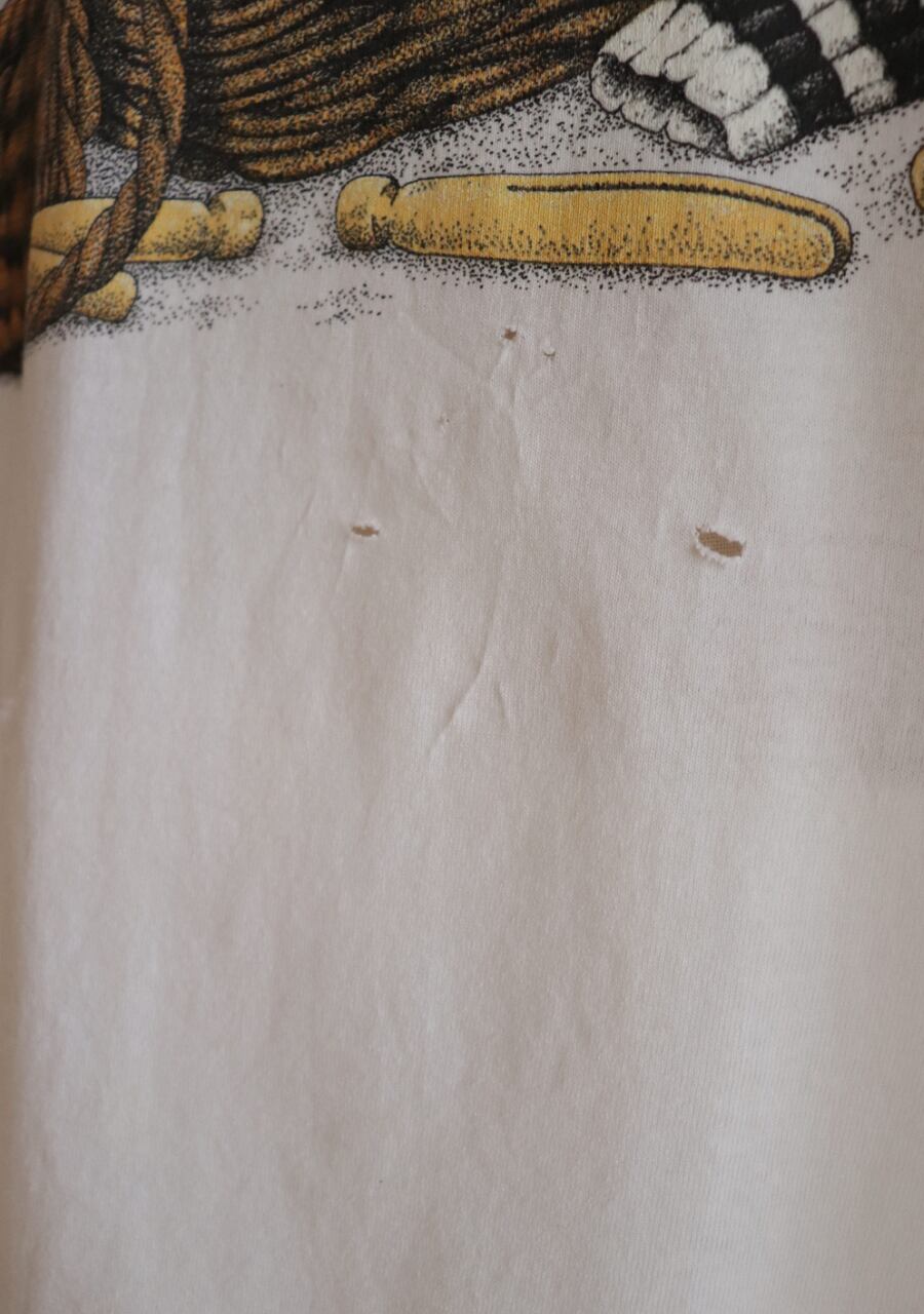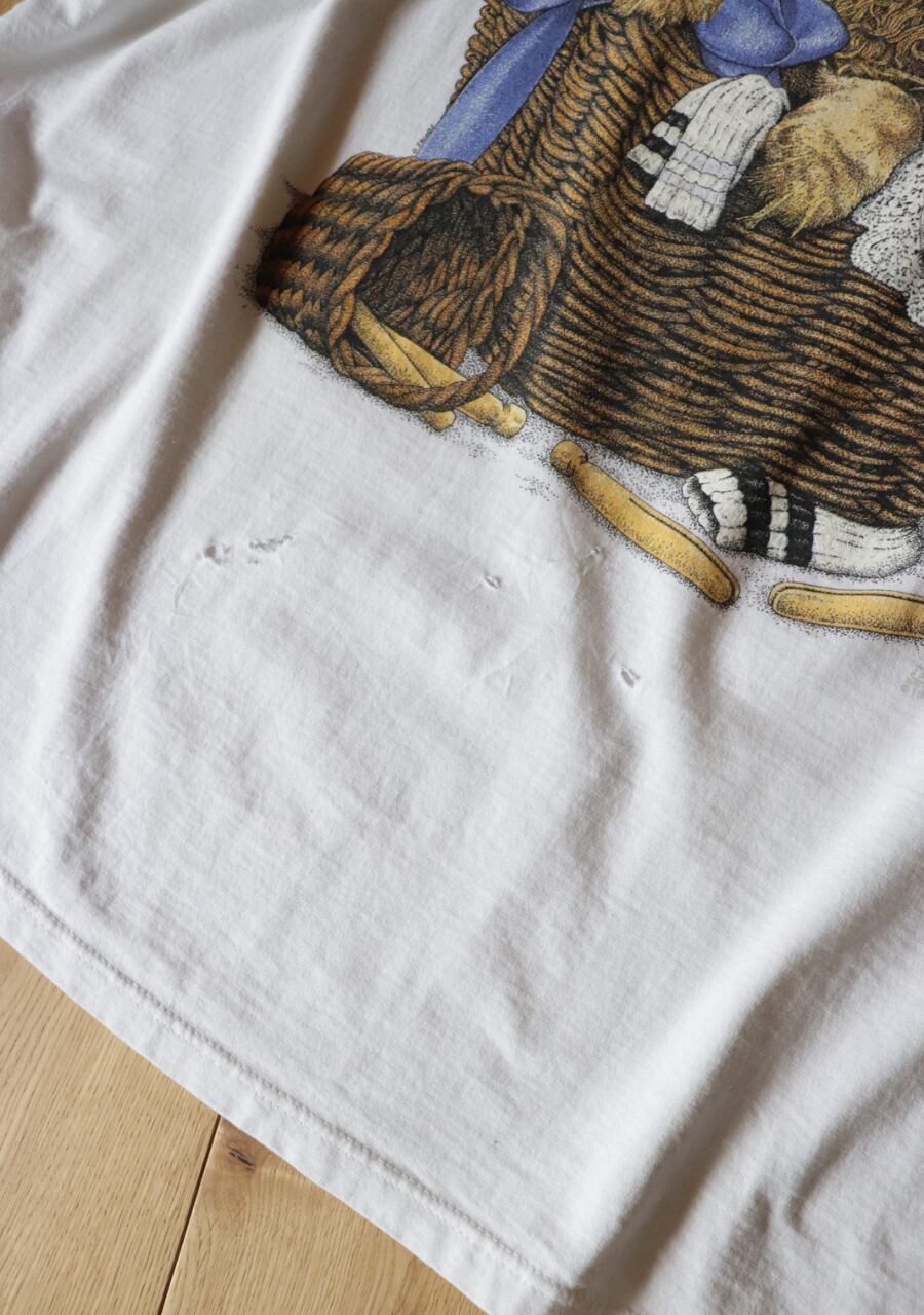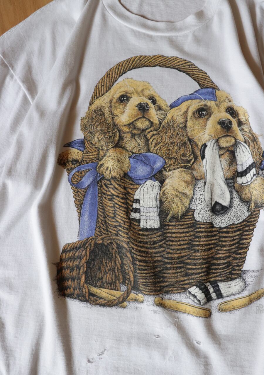 人気のあるドック柄。フロントにコッカー・スパニエルドックの大きなプリントが特徴で可愛い。ビックサイズが絶妙の首元の開き具合と肩の落ち、袖の長さと言い華奢で女性らしい首元で着用感がとても可愛い。抜け感さえあり抜群の雰囲気があります。キズも古着ならではの味わい。今からの季節にぴったりのおしゃれなTシャツです。