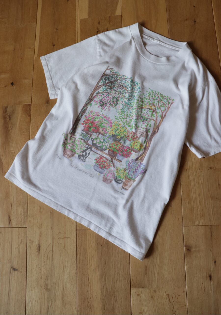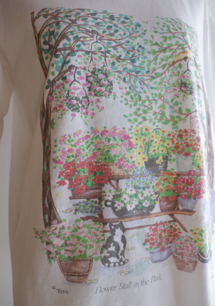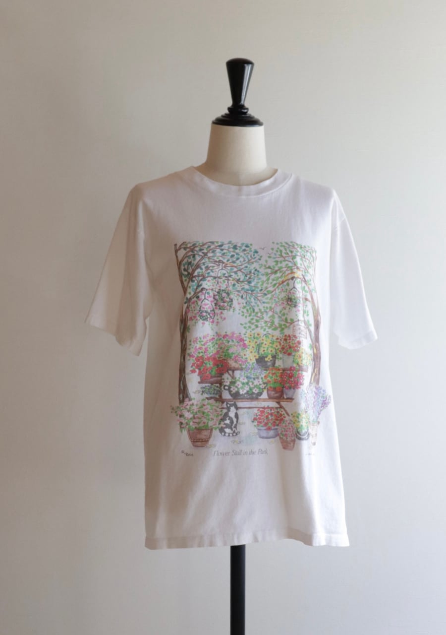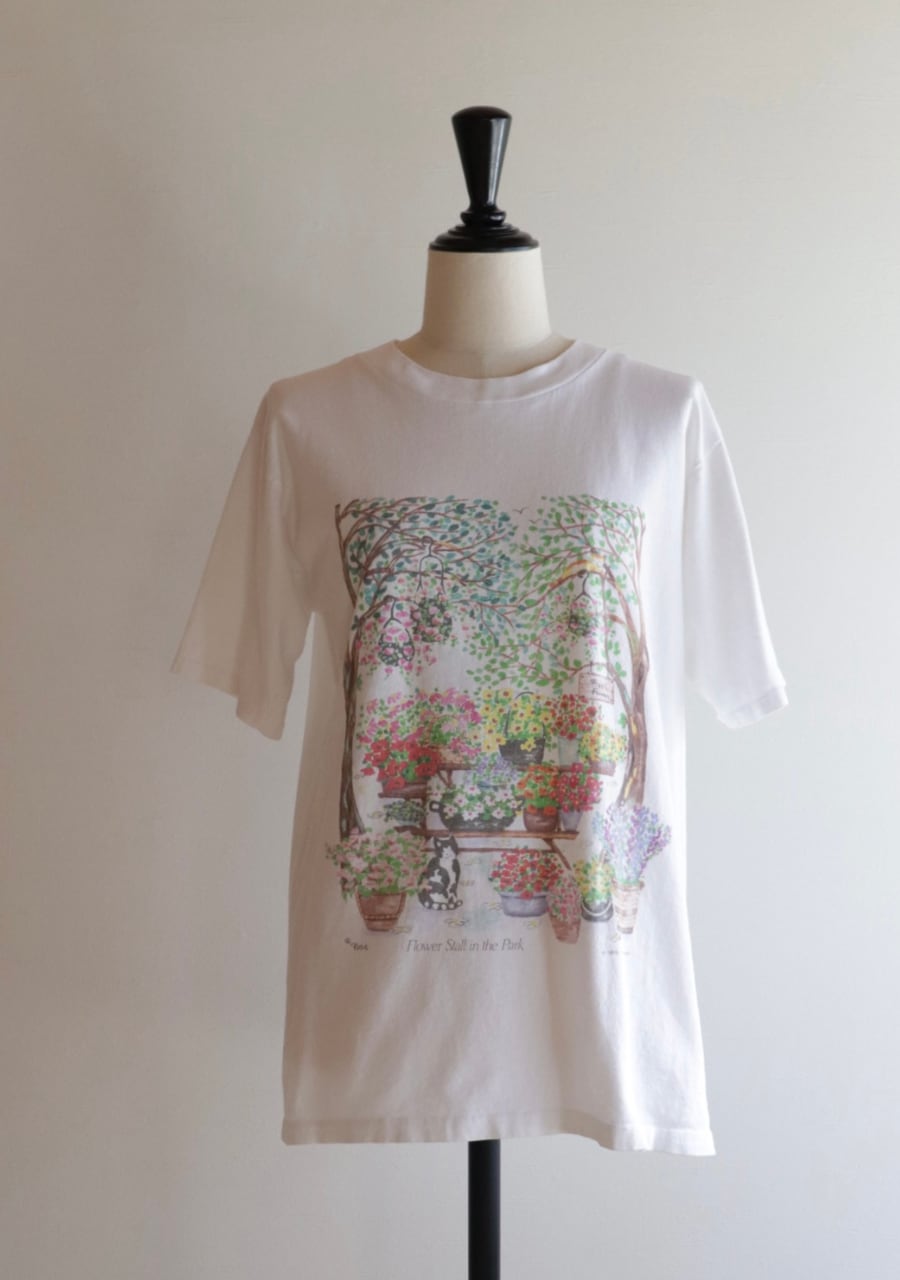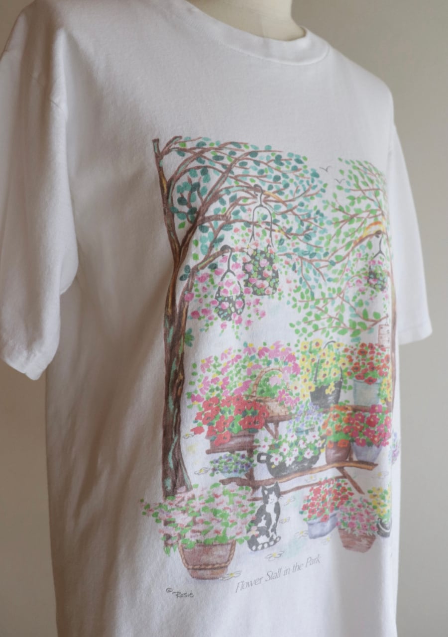 優しい木々と可愛い花鉢と猫のイラストが可愛いTシャツ。春らしいカラーで気分も明るくなるようなデザイン。コンパクトなサイズ感に大きくプリントされていて女性らしい印象で着用していただけます。
