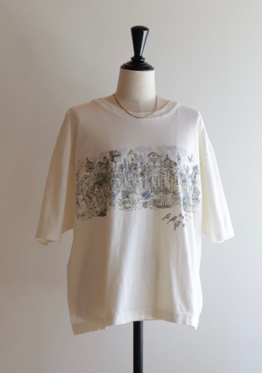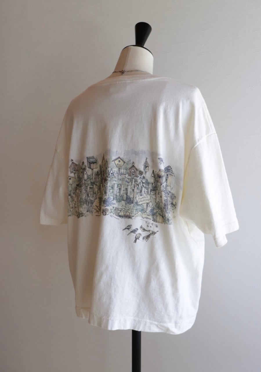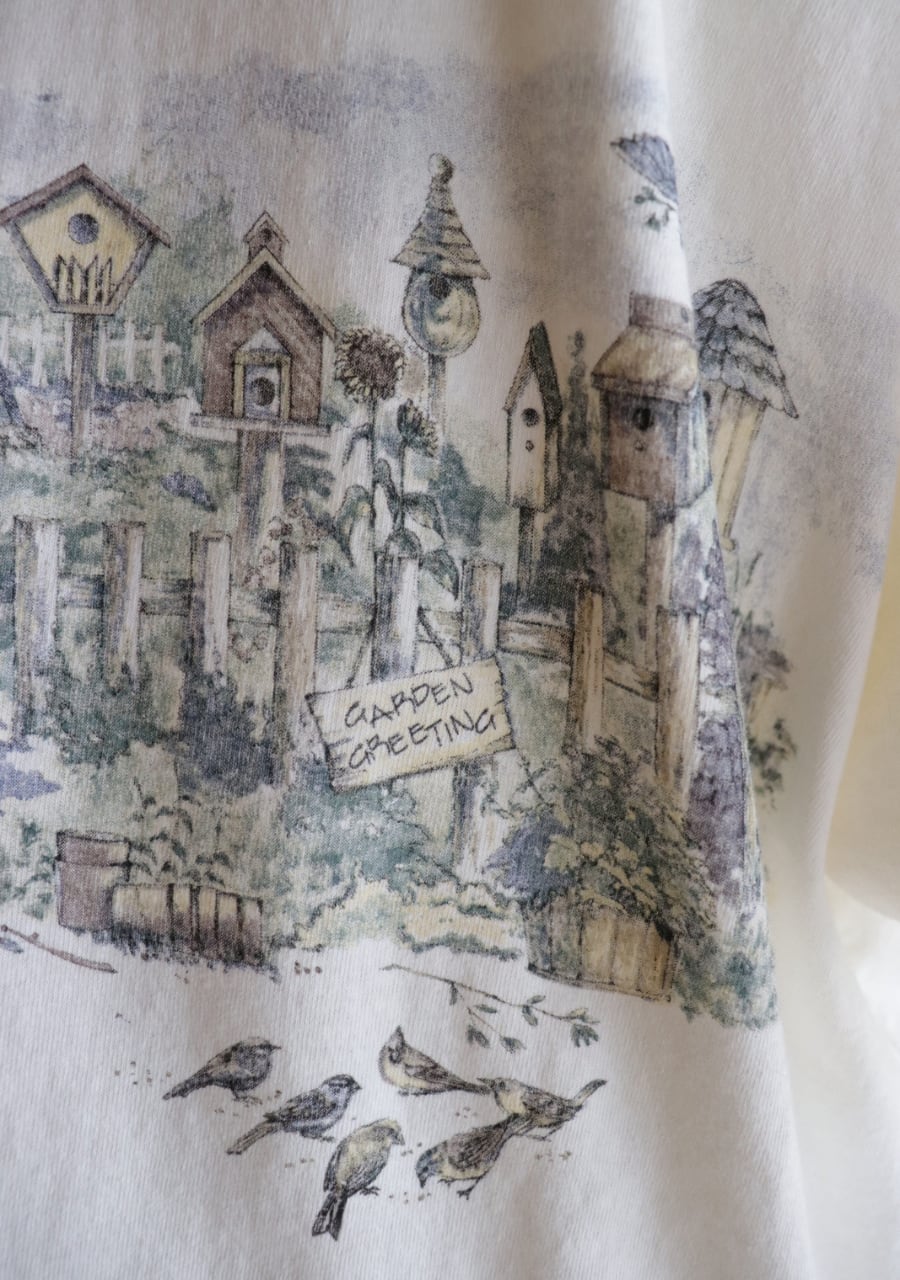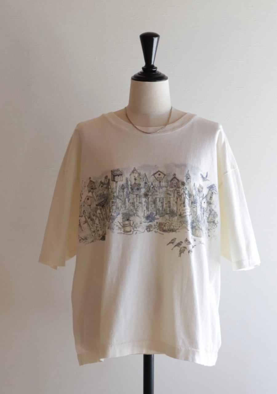 黄味がかった優しいキナリカラーのベースに庭に鳥の巣箱や小鳥が描かれたTシャツ。バックにも同じように描かれている。サイズは大き目だけど着丈が短く女性が着用するのにとても良いバランスで抜け感がありカジュアルな中にも合わせ方でこなれたシルエットが可能です。大人のおしゃれなTシャツコーディネートのポイントに大変おすすめの一着。