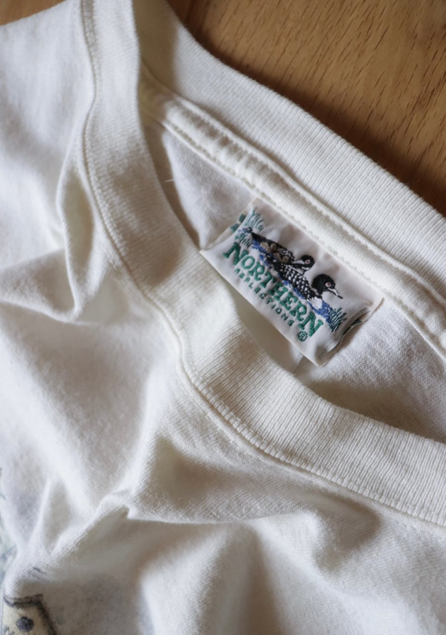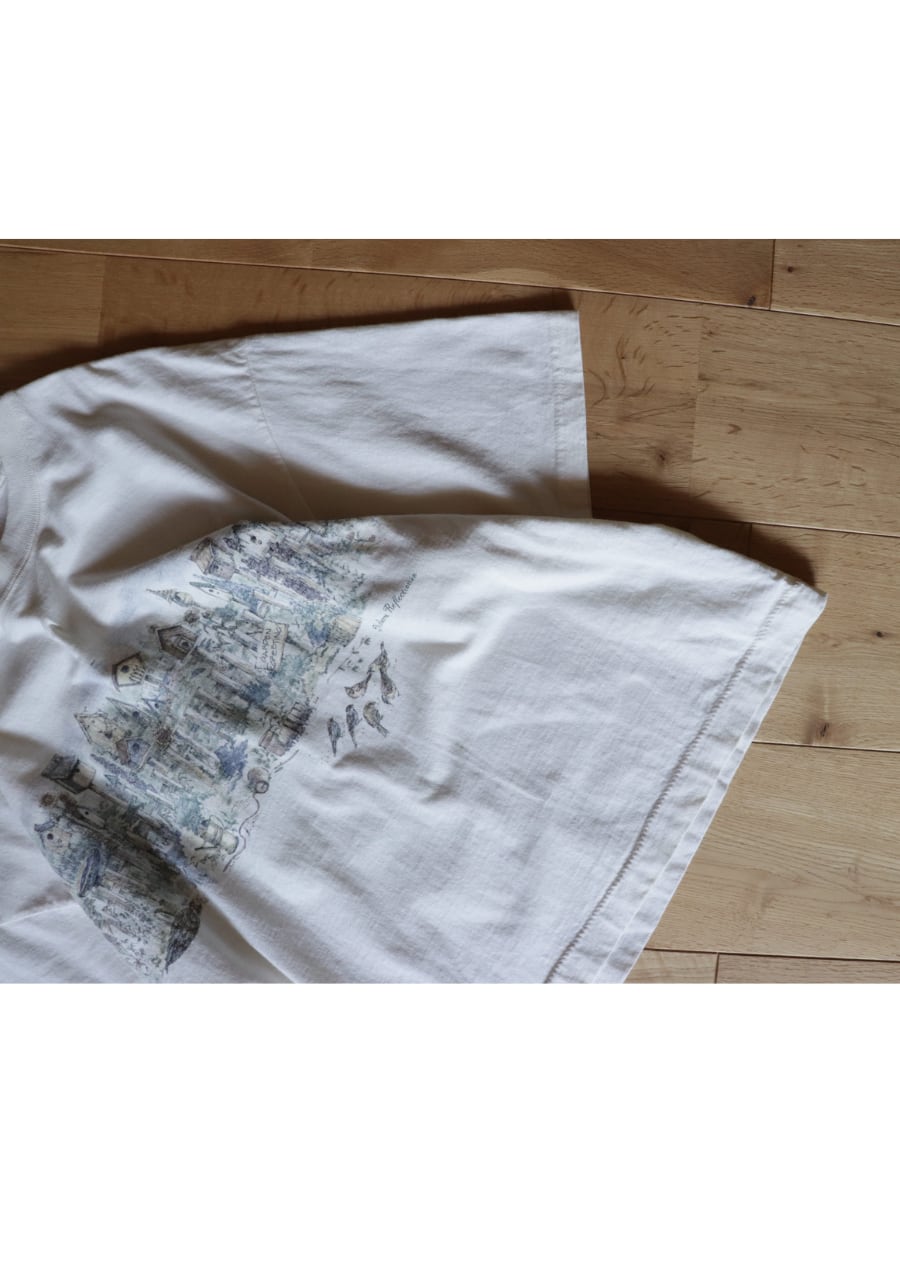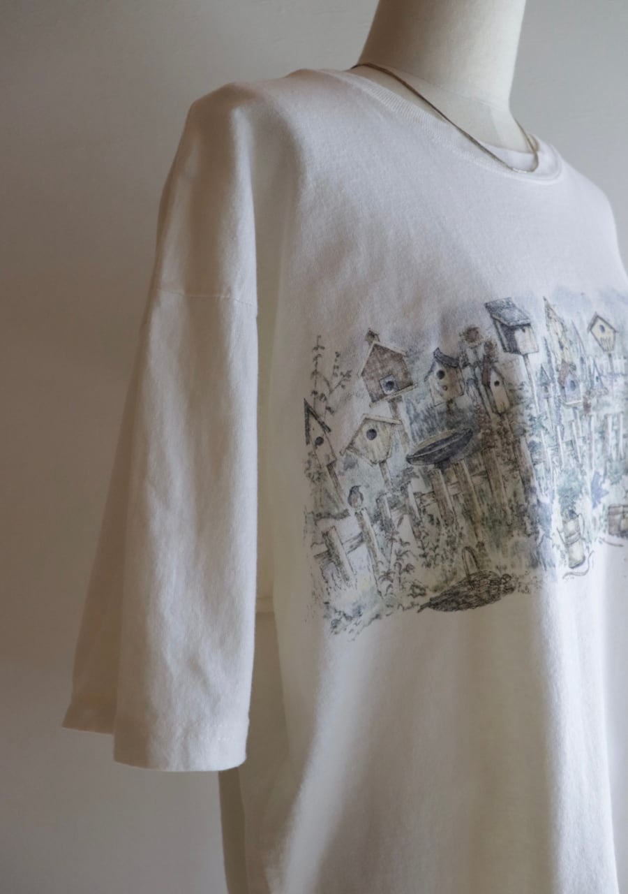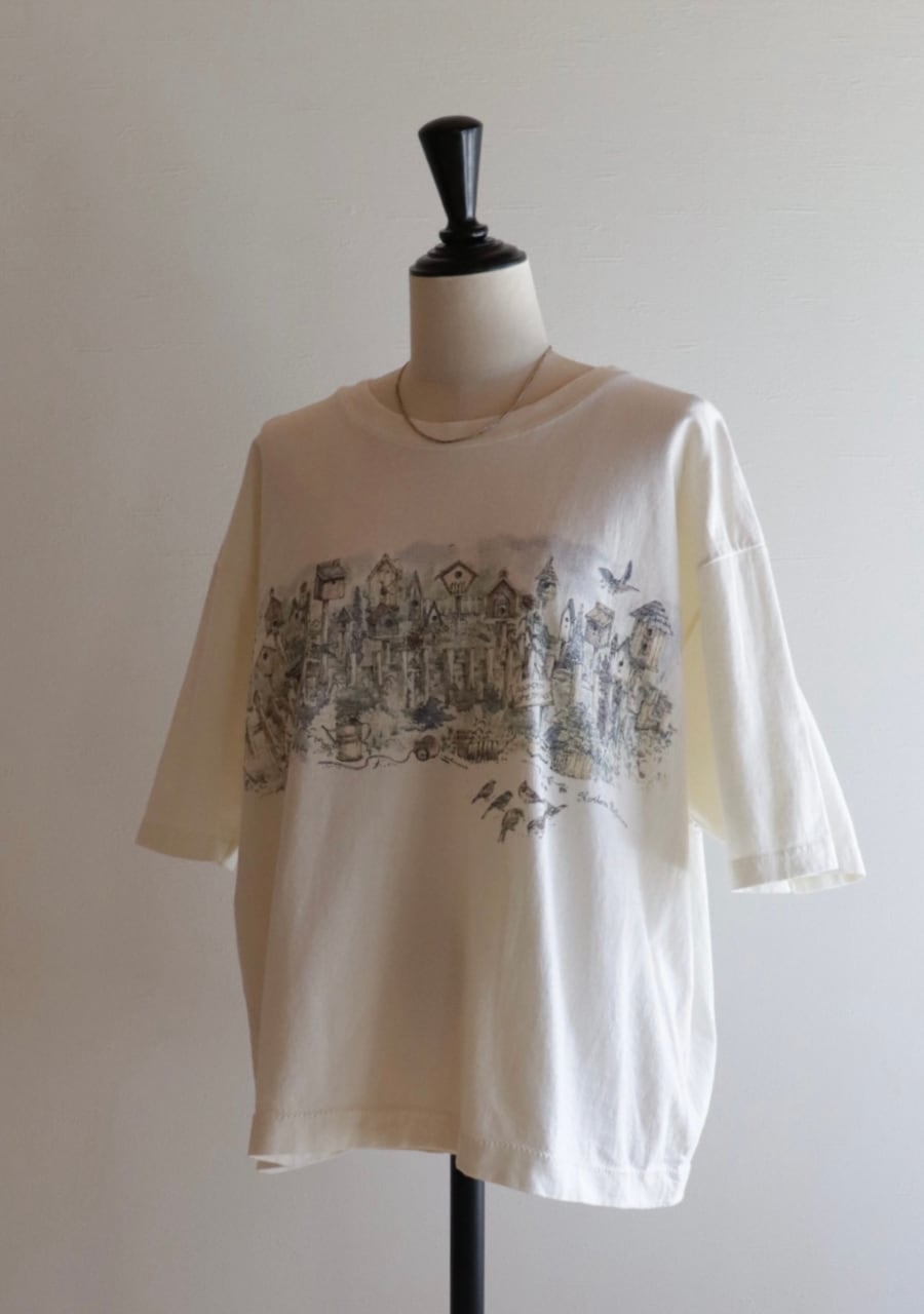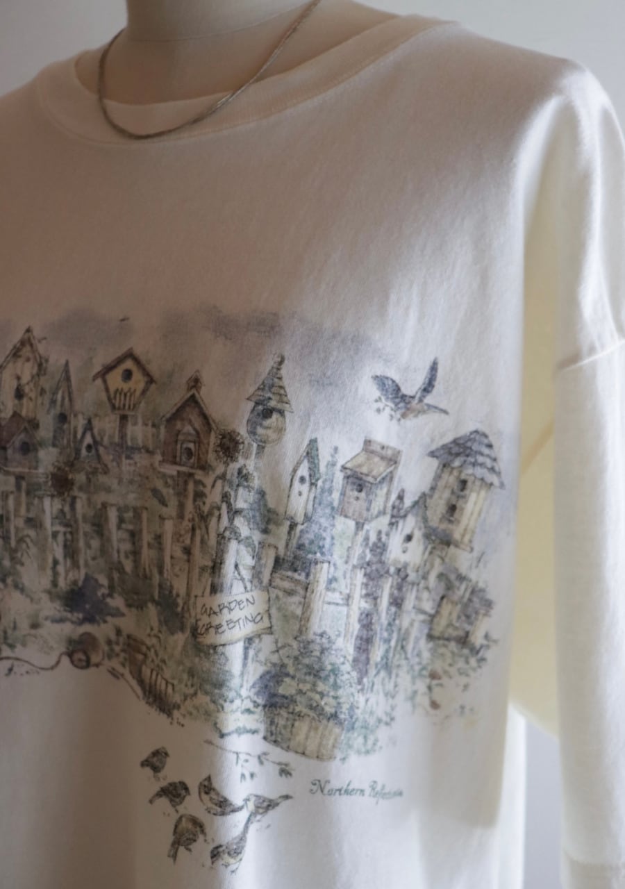 黄味がかった優しいキナリカラーのベースに庭に鳥の巣箱や小鳥が描かれたTシャツ。バックにも同じように描かれている。サイズは大き目だけど着丈が短く女性が着用するのにとても良いバランスで抜け感がありカジュアルな中にも合わせ方でこなれたシルエットが可能です。大人のおしゃれなTシャツコーディネートのポイントに大変おすすめの一着。