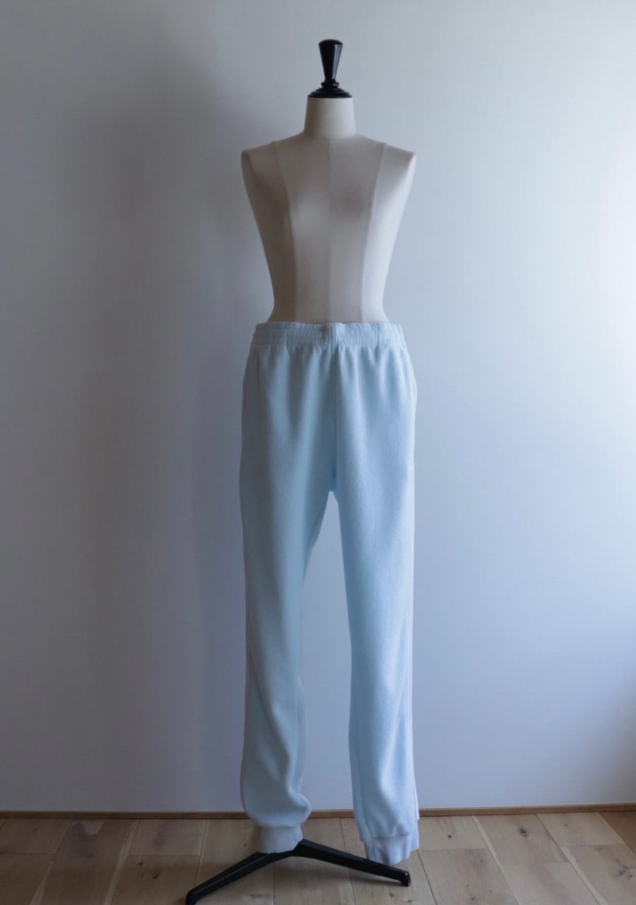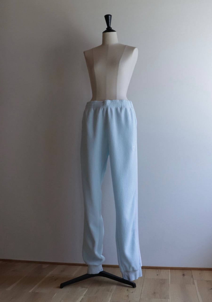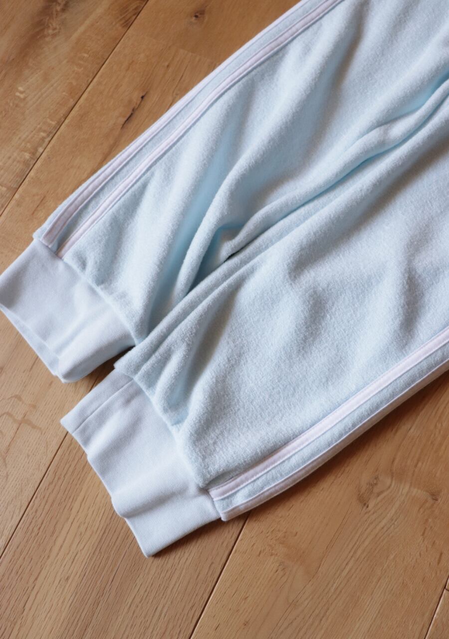 やや中厚の生地感で内側は起毛、表面はパイル地で内側外側ともにとても肌触りの良い生地。色味も爽やかな水色です。スポーツタイプな品も生地感とパステルの色味で可愛くファッションに取り入れてやすいアイテム。2022/05製造と比較的最近の物になります。使用感もなくとても綺麗なお品となります。