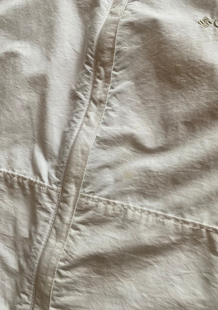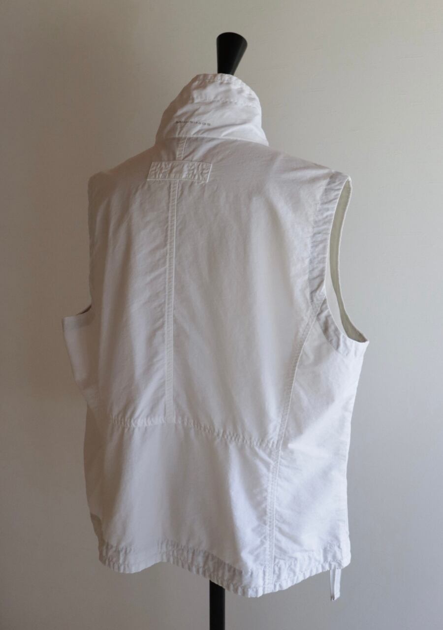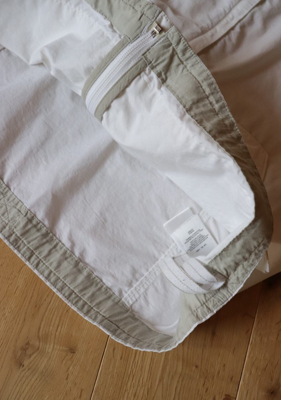 薄手で透け感はなし。柔らかいくややハリのある肌触りの良い生地です。ナイロン混のコットン素材で側管性に優れた生地はこの季節にぴったりで春から秋にかけてとちゃくようしていただけます。裾は紐で絞りシルエットに変化をつけることも可能。ファッションに取り入れやすいホワイトカラーも良しで大変おすすめの一着です。