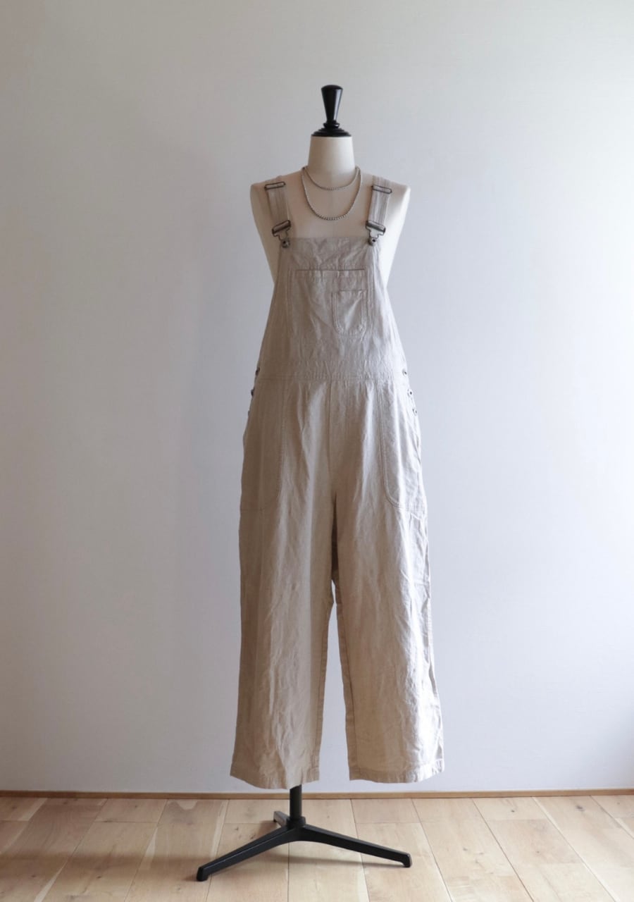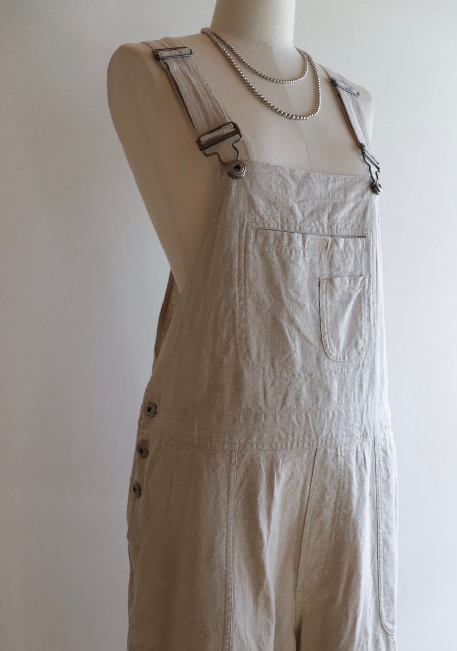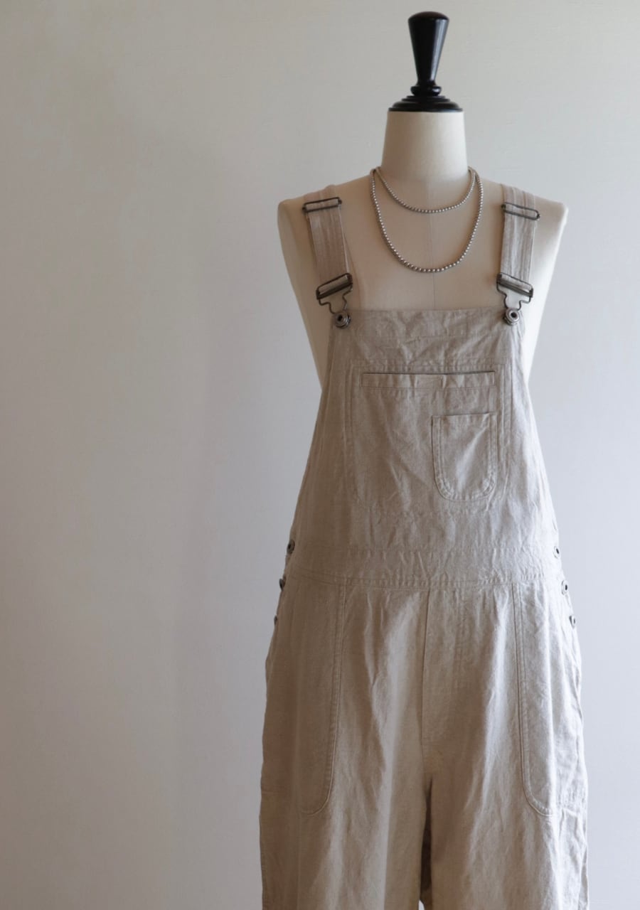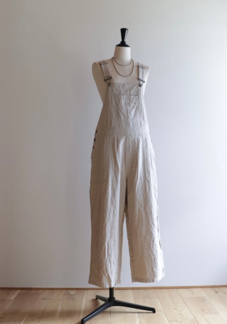 薄手で肌触りの良いリネンコットン生地で透け感は無し。丈の短いオーバーオールで足首をしっかり見せるコーディネートがポイント。今のムードにあったスタイリングが可能で、腰回りもバックで結んでシルエットに変化も楽しめるアイテム。ナチュラルなカラーにシルバ―のボタンが爽やかで可愛い。涼しくゆったり可愛く癒されるスタイリングが良い感じです。とても可愛いアイテム。