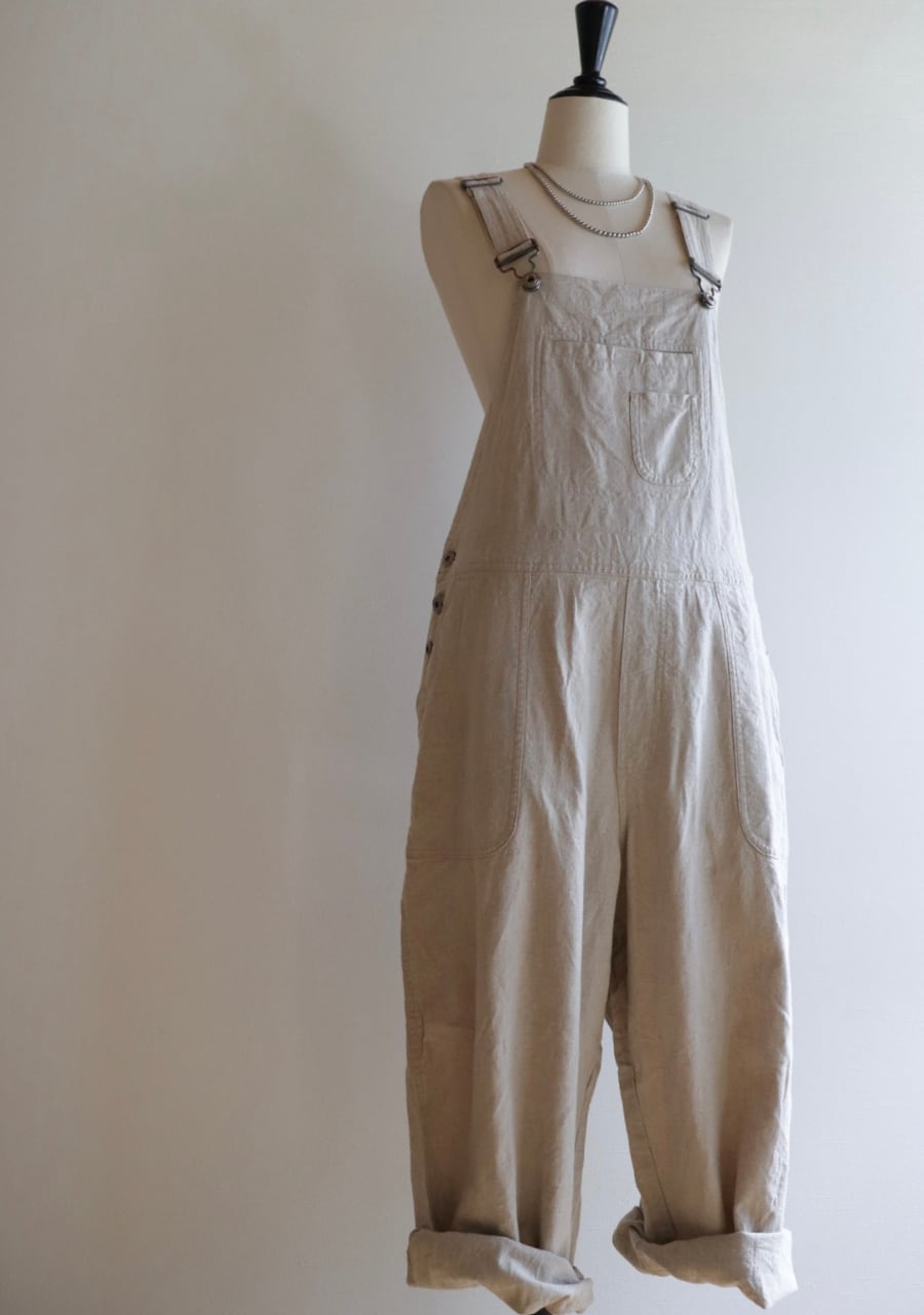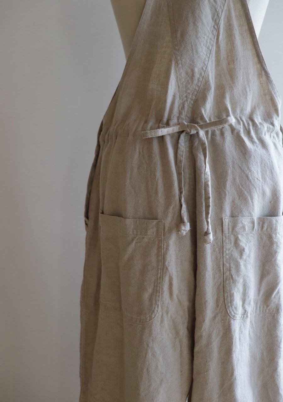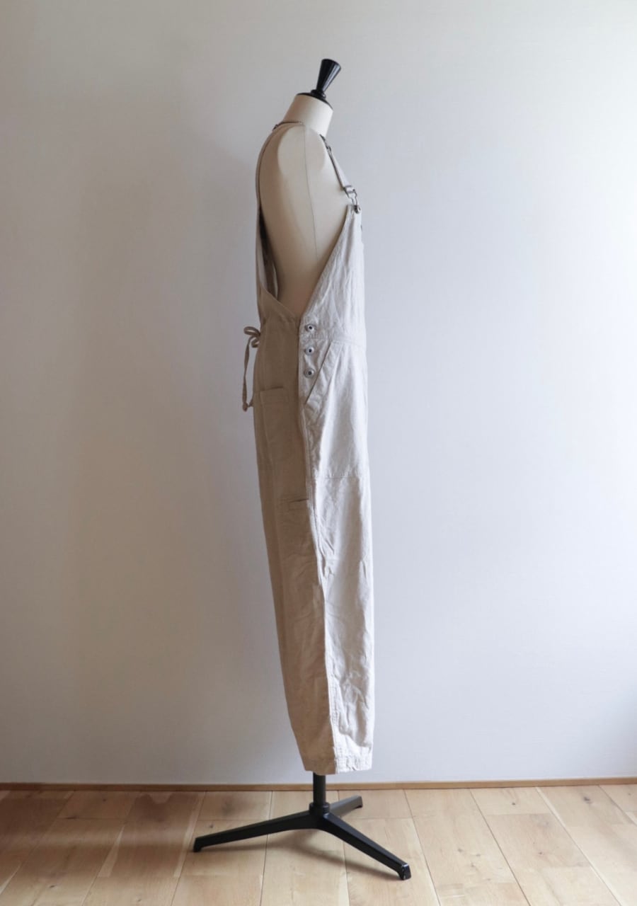 薄手で肌触りの良いリネンコットン生地で透け感は無し。丈の短いオーバーオールで足首をしっかり見せるコーディネートがポイント。今のムードにあったスタイリングが可能で、腰回りもバックで結んでシルエットに変化も楽しめるアイテム。ナチュラルなカラーにシルバ―のボタンが爽やかで可愛い。涼しくゆったり可愛く癒されるスタイリングが良い感じです。とても可愛いアイテム。
