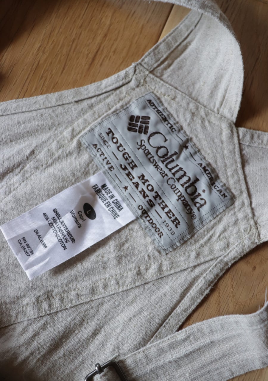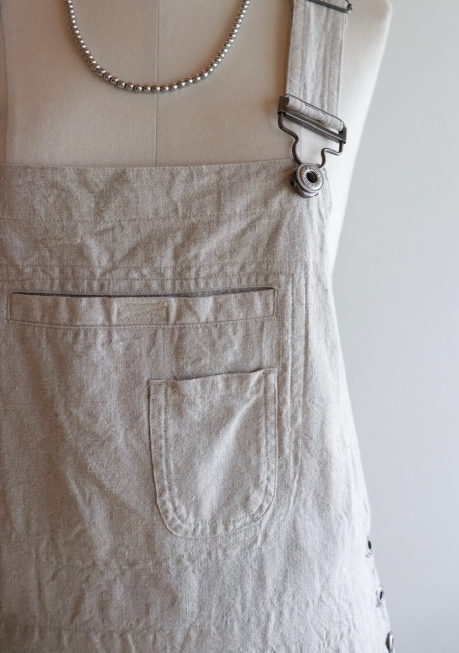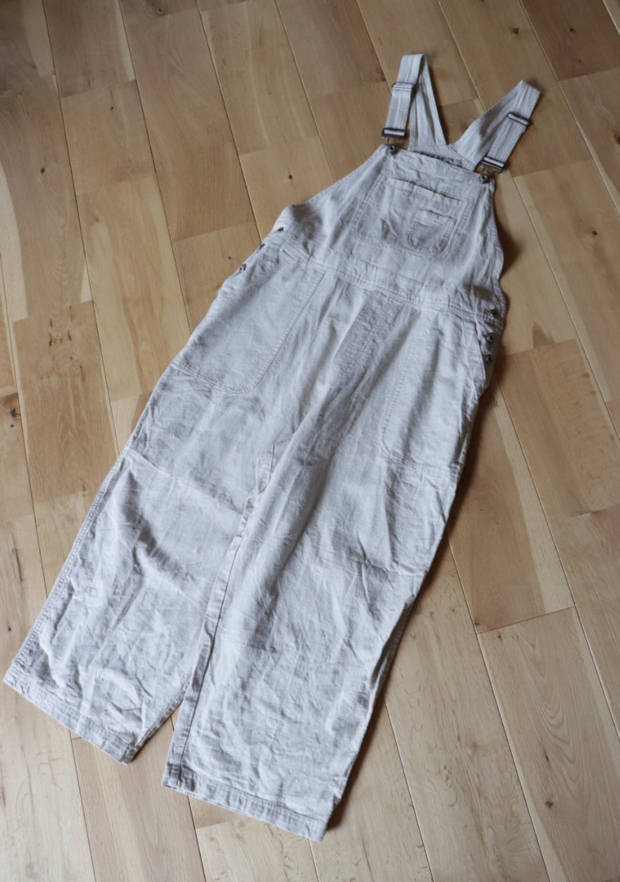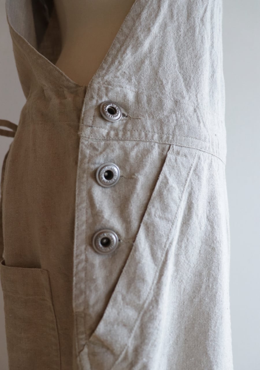 薄手で肌触りの良いリネンコットン生地で透け感は無し。丈の短いオーバーオールで足首をしっかり見せるコーディネートがポイント。今のムードにあったスタイリングが可能で、腰回りもバックで結んでシルエットに変化も楽しめるアイテム。ナチュラルなカラーにシルバ―のボタンが爽やかで可愛い。涼しくゆったり可愛く癒されるスタイリングが良い感じです。とても可愛いアイテム。