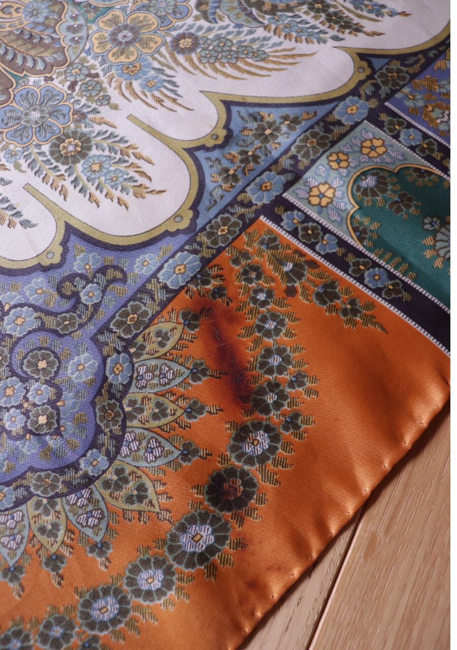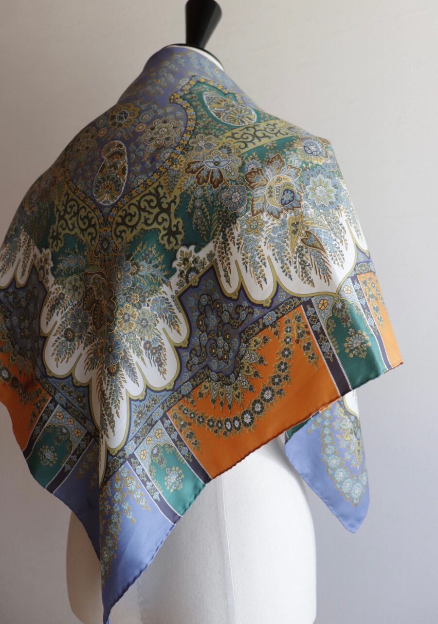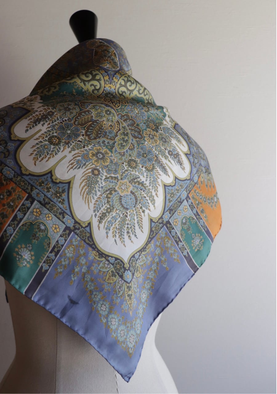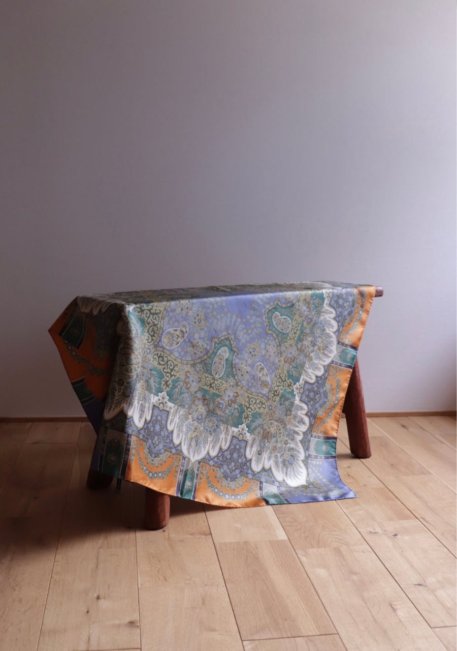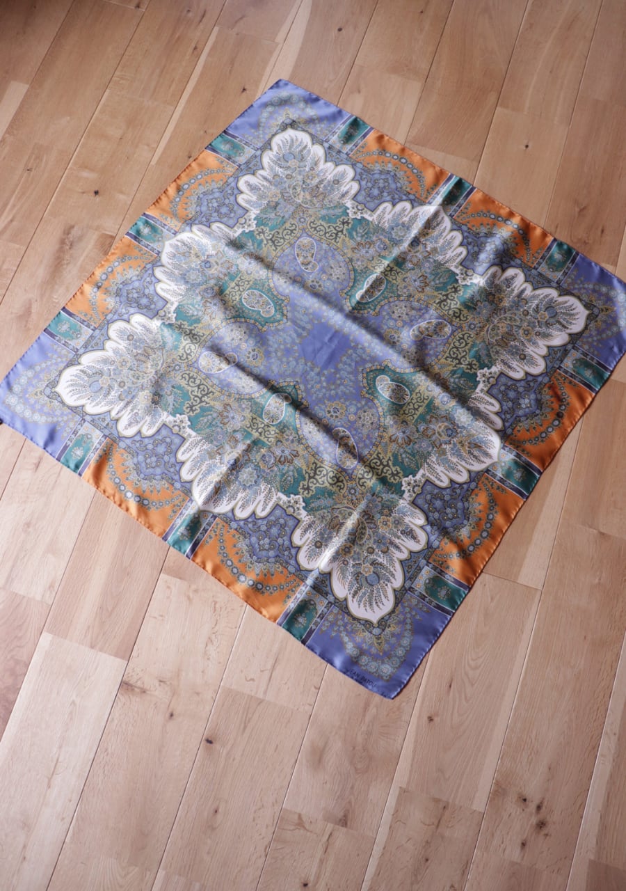 柔らかくしなやかで肌触りの良い繊細な生地。透け感は無し。くすみブルーとオレンジの柄と色味が大変おしゃれなスカーフ。ほどよい艶も上品でシルクの良さを感じる。プラスするだけでキレイ目で大人な印象のスタイリングが可能に。大変おすすめ一枚です。