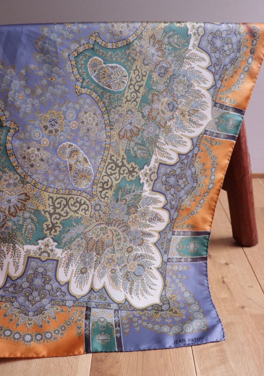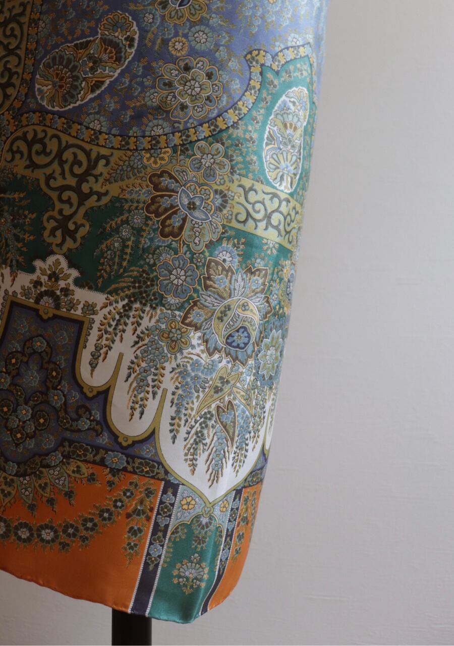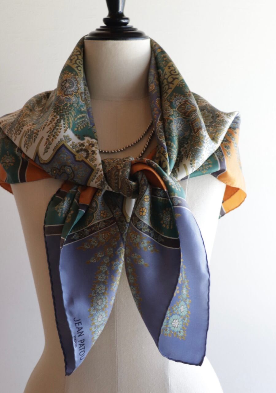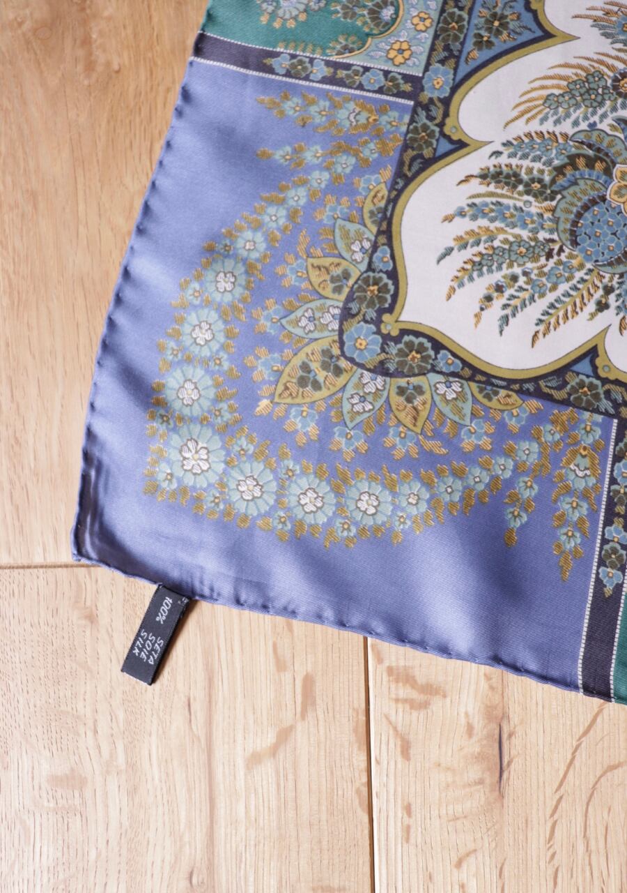 柔らかくしなやかで肌触りの良い繊細な生地。透け感は無し。くすみブルーとオレンジの柄と色味が大変おしゃれなスカーフ。ほどよい艶も上品でシルクの良さを感じる。プラスするだけでキレイ目で大人な印象のスタイリングが可能に。大変おすすめ一枚です。