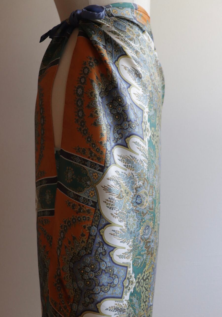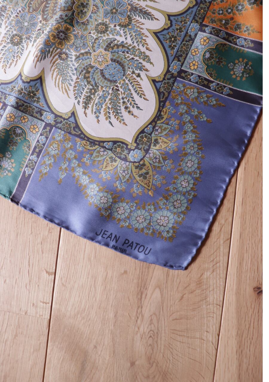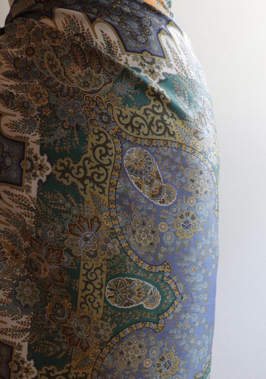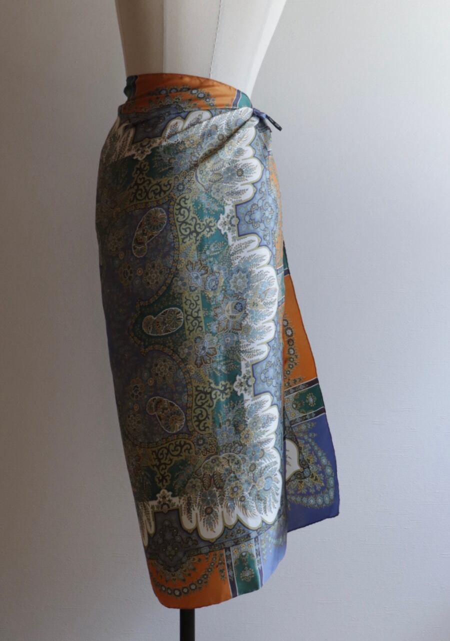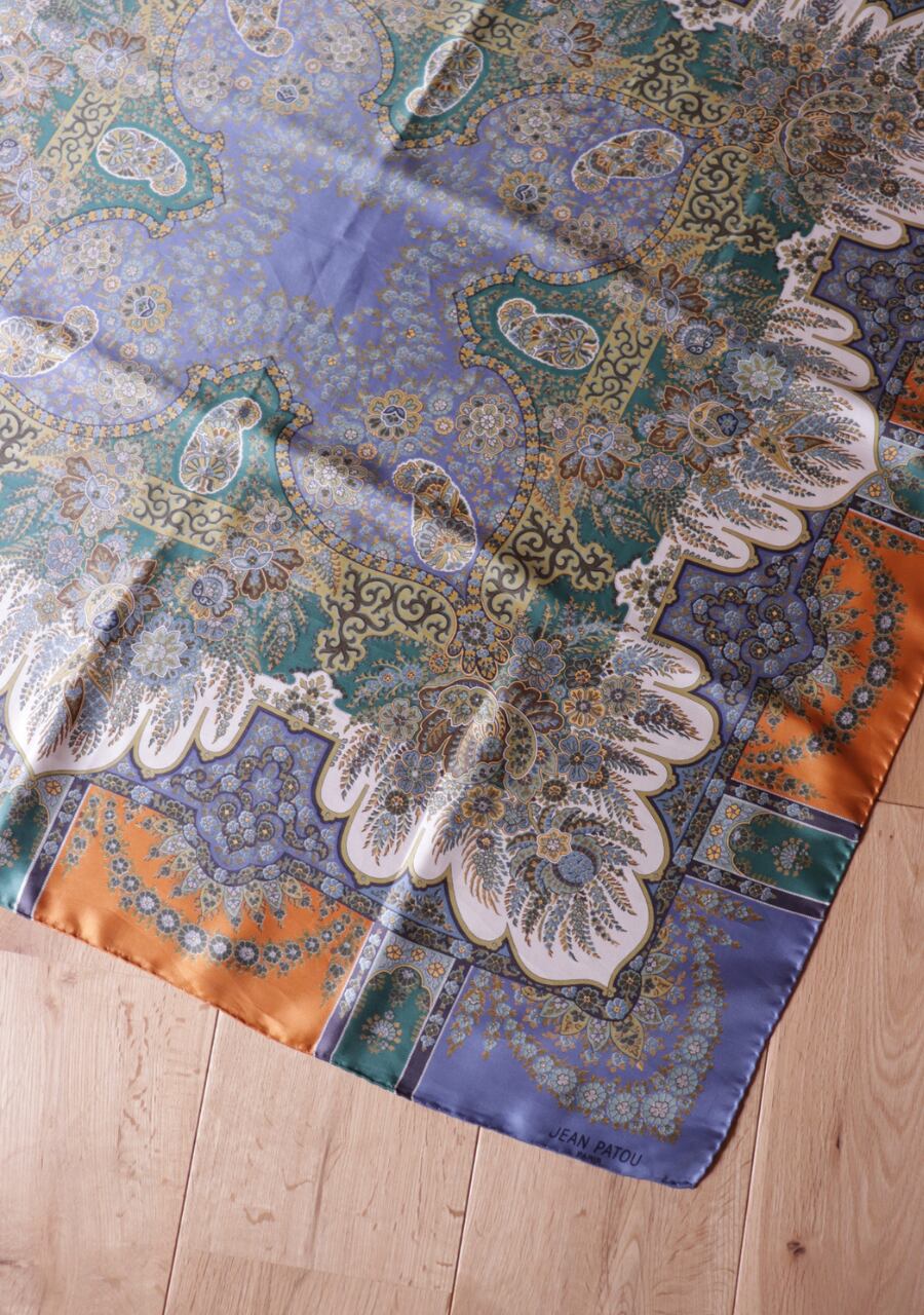 柔らかくしなやかで肌触りの良い繊細な生地。透け感は無し。くすみブルーとオレンジの柄と色味が大変おしゃれなスカーフ。ほどよい艶も上品でシルクの良さを感じる。プラスするだけでキレイ目で大人な印象のスタイリングが可能に。大変おすすめ一枚です。