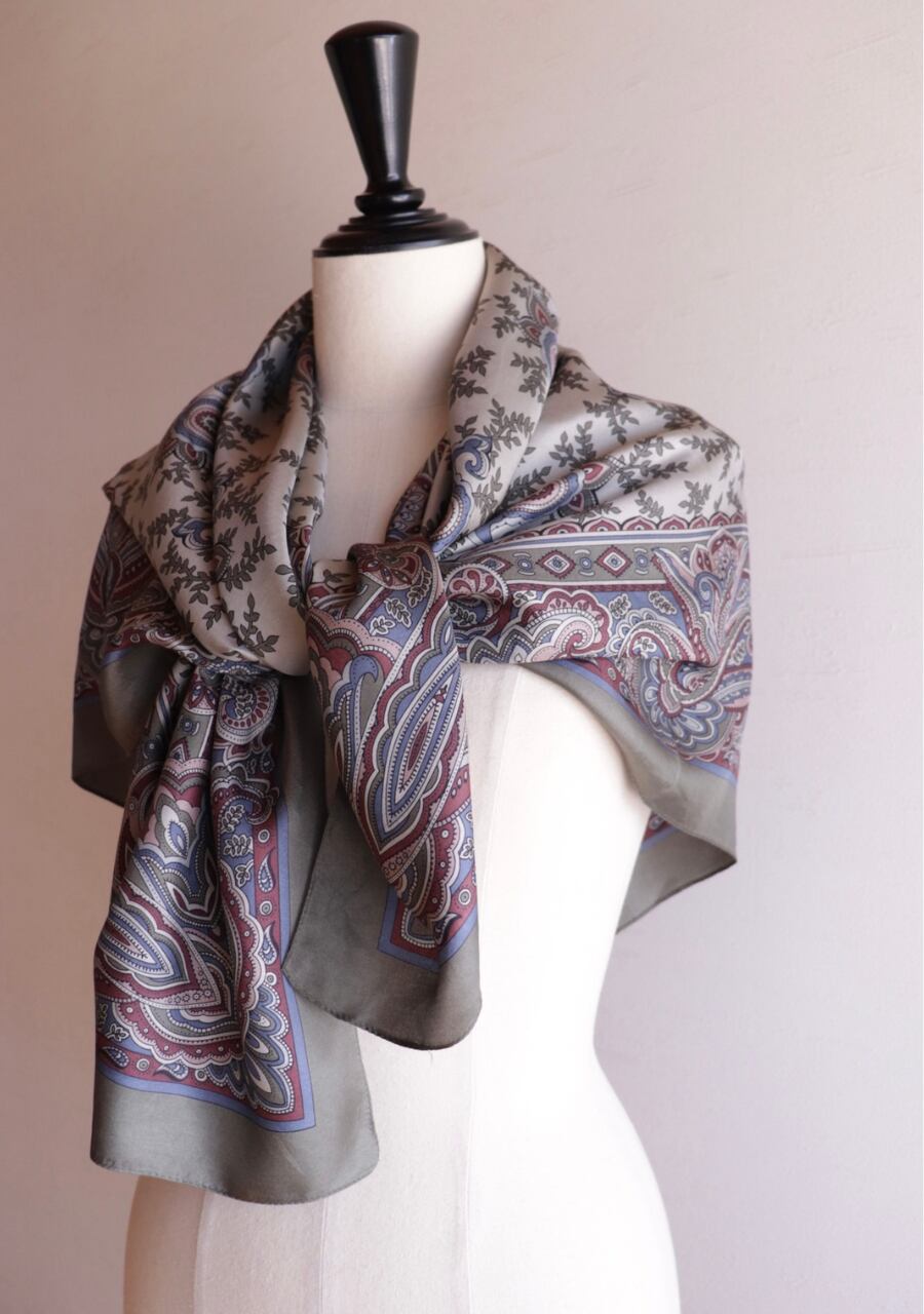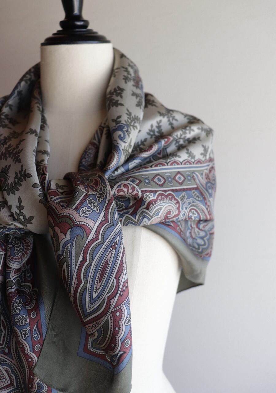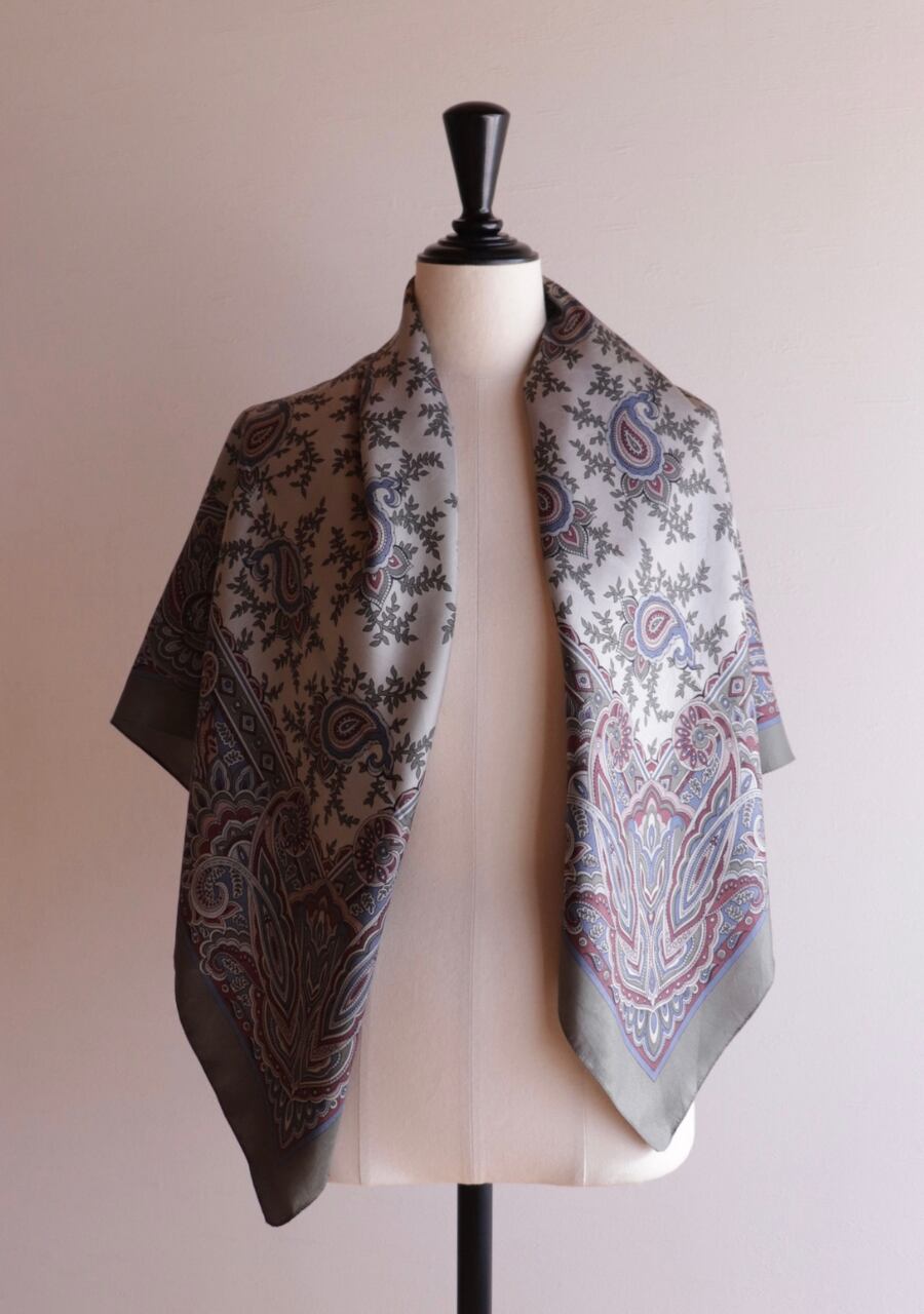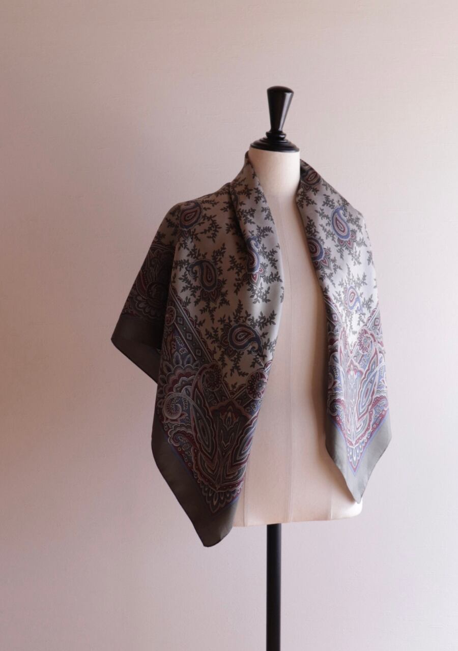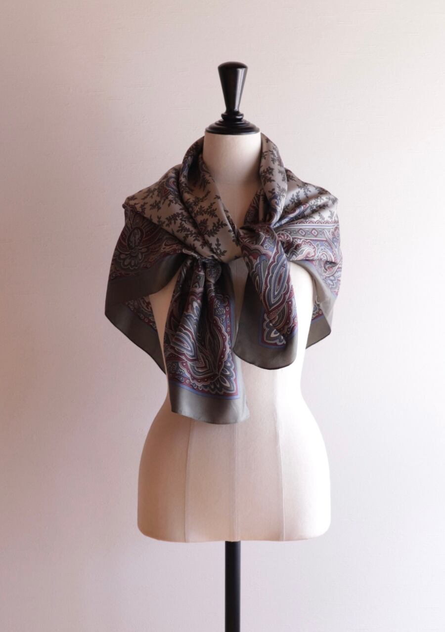 柔らかくしなやかで肌触りの良いシルク生地。透け感は無し。ほどよいシルクの艶が上品で落ち着いた色味も相まって大人の女性にぴったりのアイテム。リュームを楽しんでいただける大判なのも嬉しい。上品でカッコ良く決まるアイテムで季節を問わず活躍してくれるアイテム。ダメージもなくたいへんおすすめの一枚。