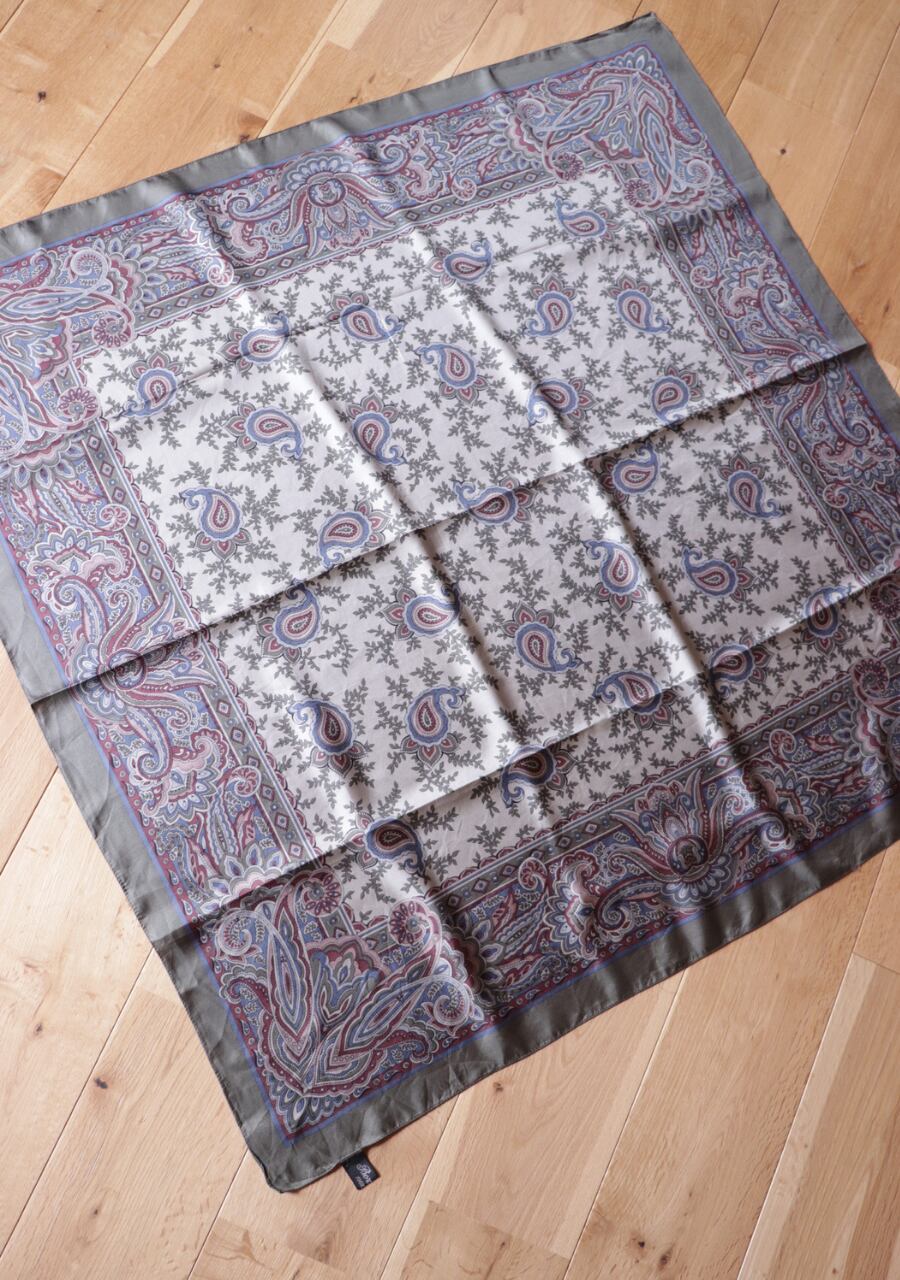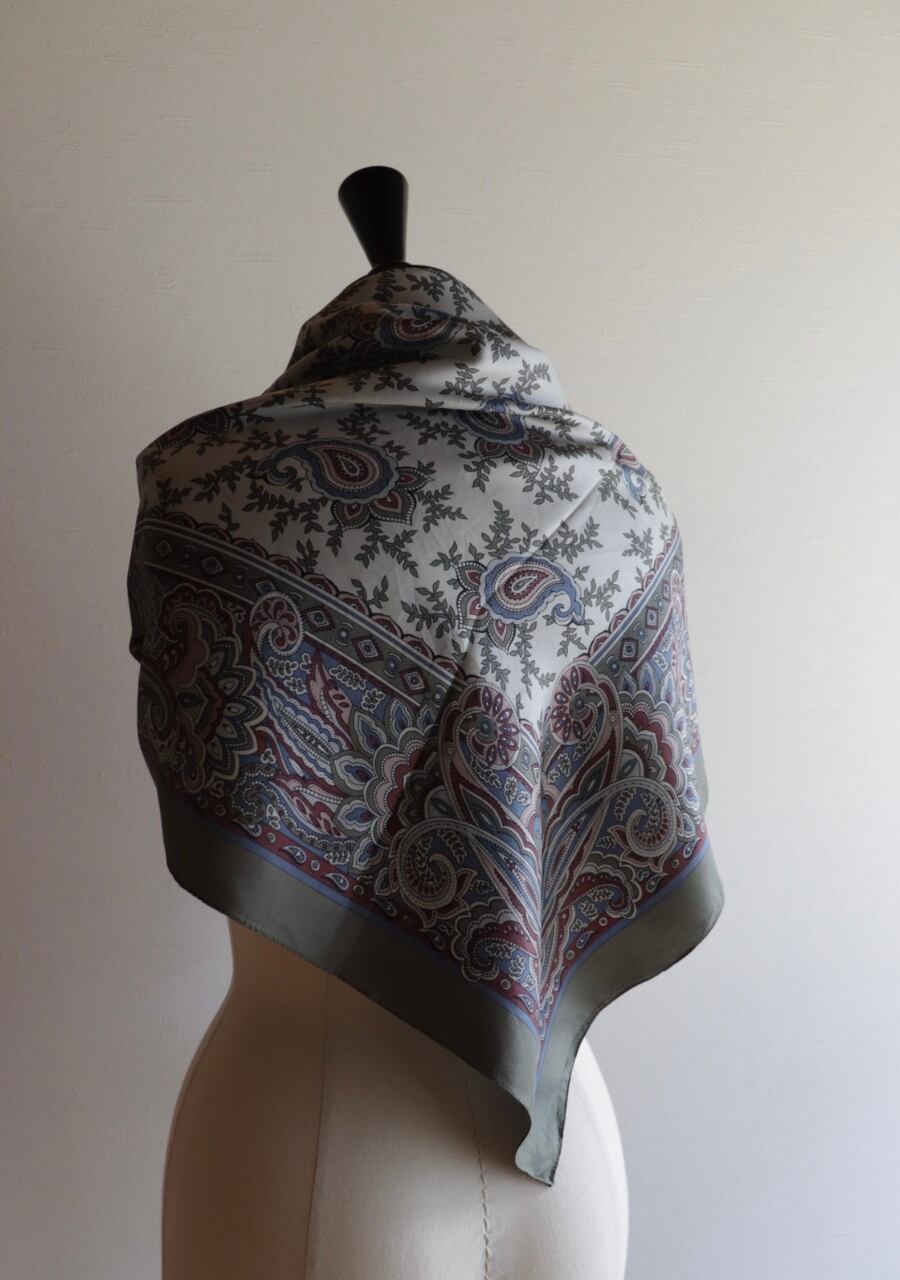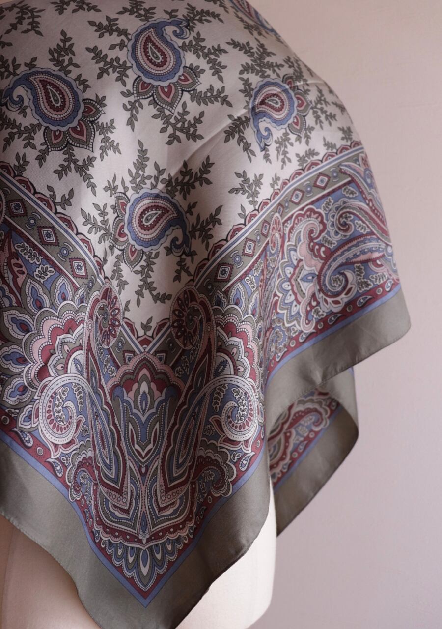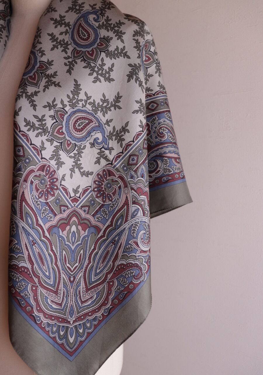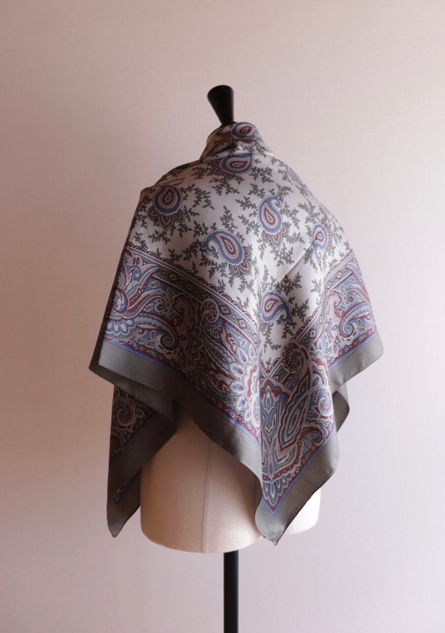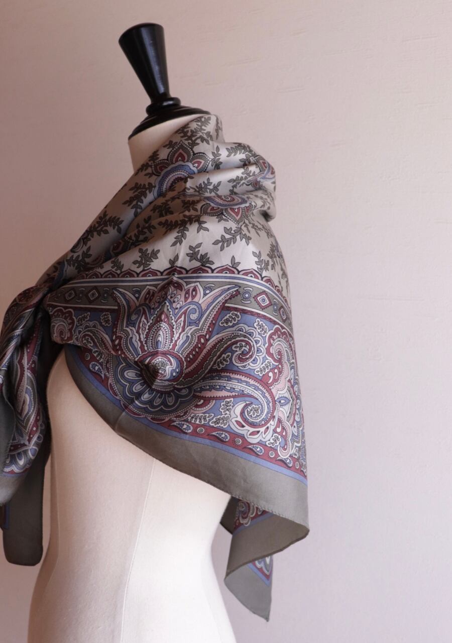 柔らかくしなやかで肌触りの良いシルク生地。透け感は無し。ほどよいシルクの艶が上品で落ち着いた色味も相まって大人の女性にぴったりのアイテム。リュームを楽しんでいただける大判なのも嬉しい。上品でカッコ良く決まるアイテムで季節を問わず活躍してくれるアイテム。ダメージもなくたいへんおすすめの一枚。
